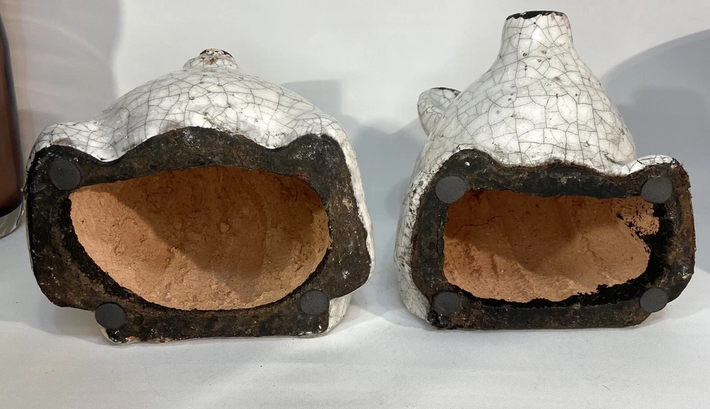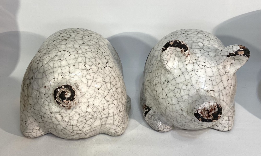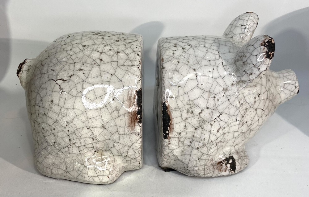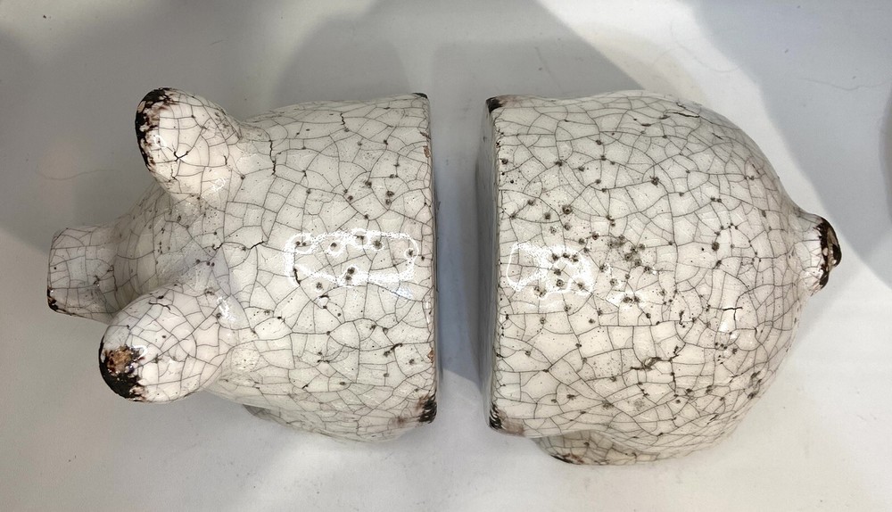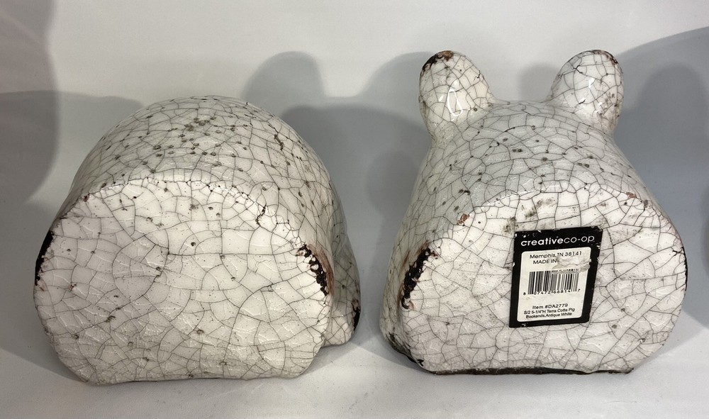 Add a touch of charm to your bookshelf with these delightful pig bookends from Creative Co-op. Made from red clay and finished with a beautiful white crackle glaze, these bookends feature a cute and intricate pig design that is perfect for all occasions. Measuring 5 inches in height and width, these medium-sized bookends are ideal for supporting your favorite reads. The pig subject, along with the crackle finish, makes them a great addition to any collection. These bookends are original and not reproductions, and they were manufactured in an unknown time period and country/region. Get ready to show off your love for pigs with these adorable bookends that are sure to delight any reader. Please look at photos for details.