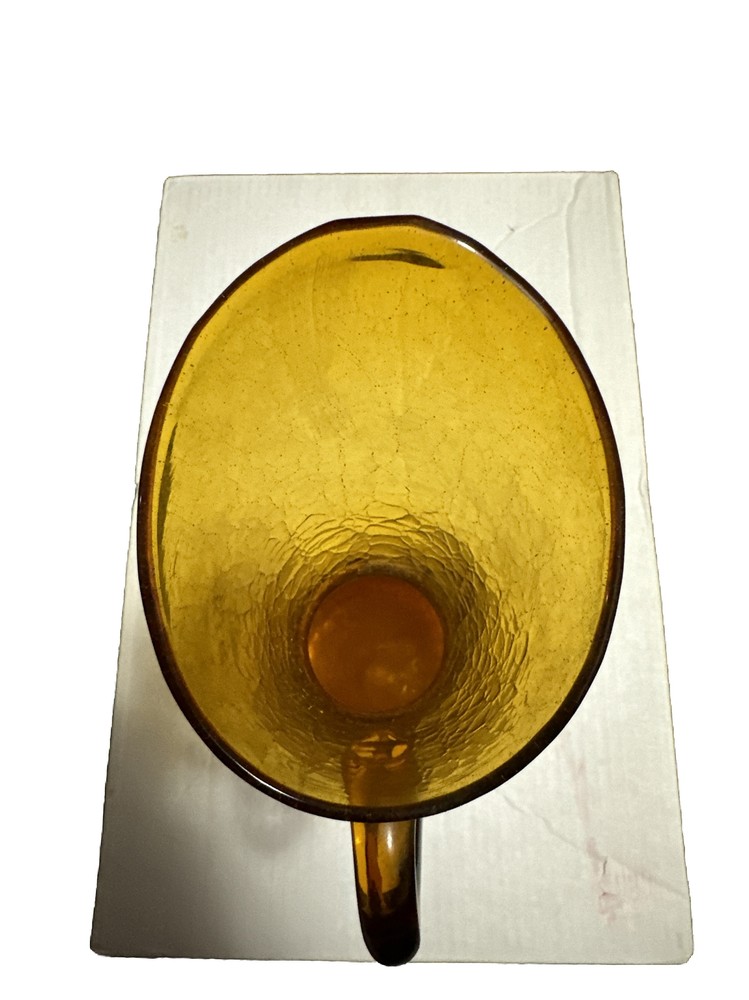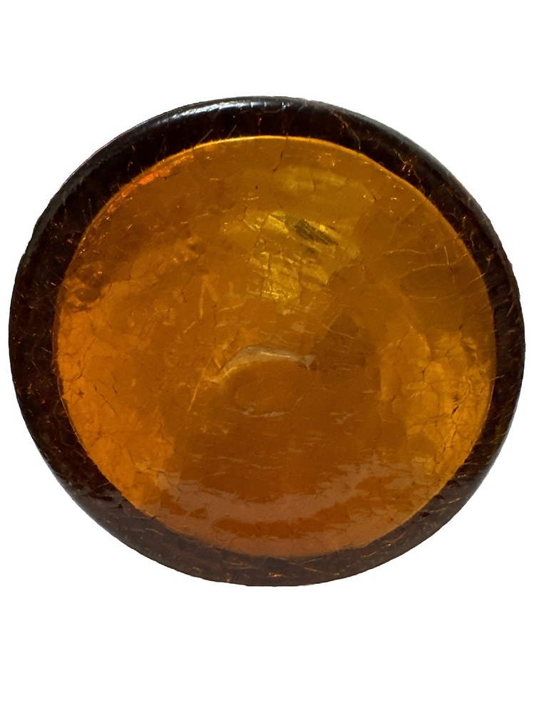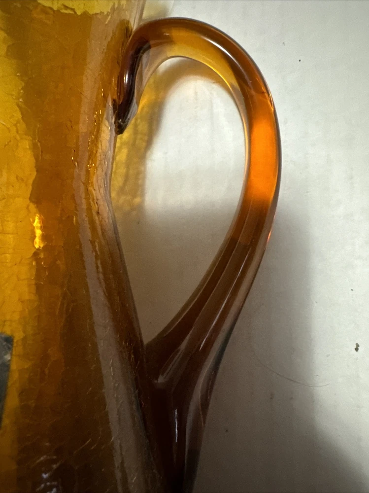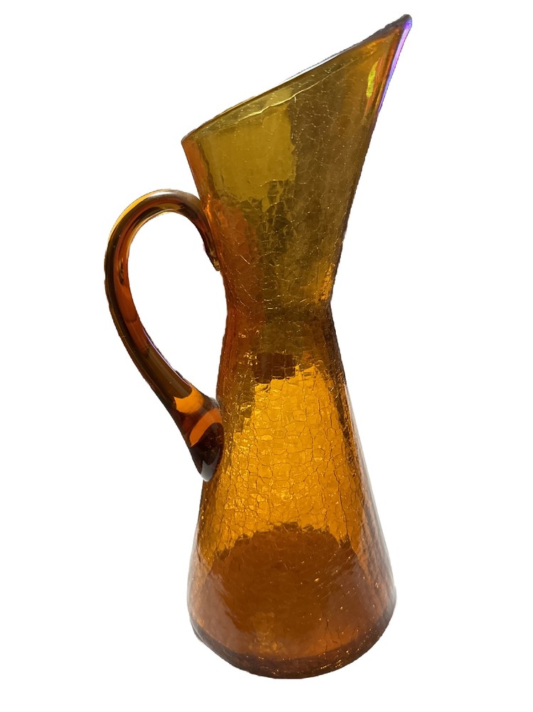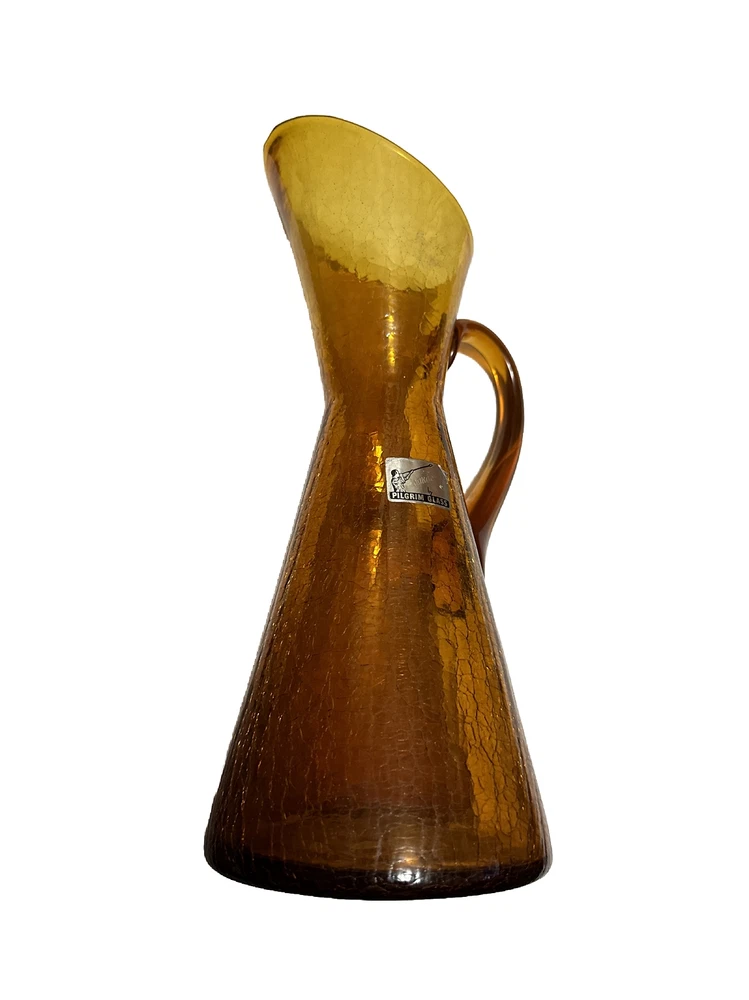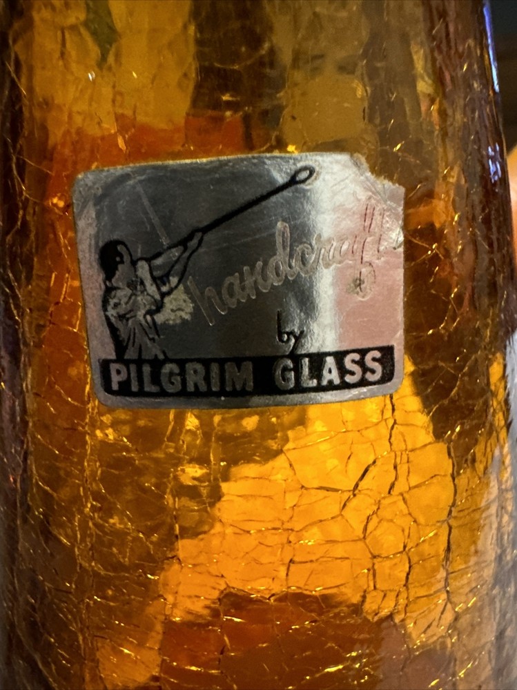 This Pilgrim Glass vase is a beautiful Amber Orange color and was handcrafted during the Mid Century period. The glass is crackled and has a unique production style that showcases the hand blown glass technique used to create this piece. It is a vintage item that weighs 2.5lbs and stands 12 inches tall with a base width of 4.75 inches. This vase is a great addition to any decorative pottery and glassware collection and is sure to be a conversation starter. The brand is well-known for their quality handmade glass products and this Pilgrim Glass vase is no exception. No box.