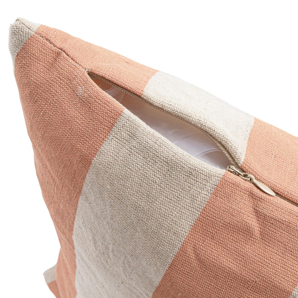 This red and natural cotton and linen striped pillow is a classic and cozy addition to any space. It features a simple and elegant striped pattern with horizontal stripes of different widths, creating contrast and interest. The pillow is made of a rich, smooth cotton and linen blend fabric, providing a soft and breathable feel. The polyester fill adds extra support and durability. The pillow measures 20 by 20 inches and is easy to care for and machine washable. It complements farmhouse, transitional, cottagecore, French country, or beach style decor. This versatile and timeless accessory is perfect for creating a cozy atmosphere or a bright and cheerful vibe. It is easy to care for and machine washable, making it a great choice for any space. A classic and cozy pillow with a striped pattern in pink and natural colors on a cotton and linen blend fabric A versatile and timeless accessory that can complement any farmhouse, transitional, cottagecore, French country, or beach style decor A soft and comfortable polyester insert A cotton and linen blend cover that is soft, breathable, and naturally cool Measures 20 inches in length and 20 inches in width