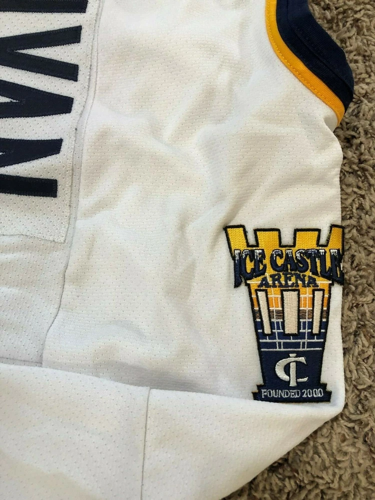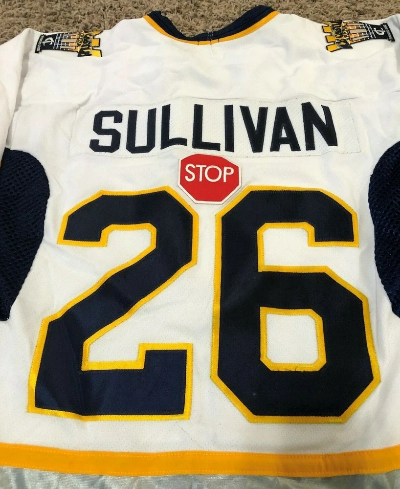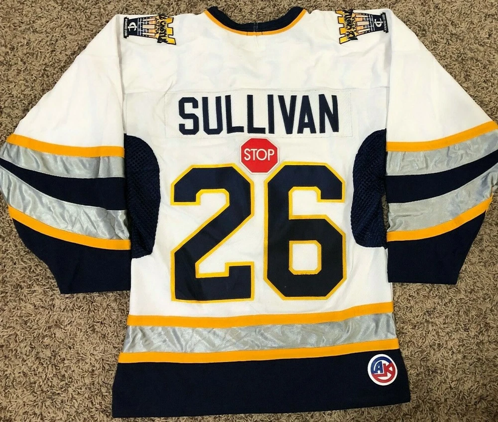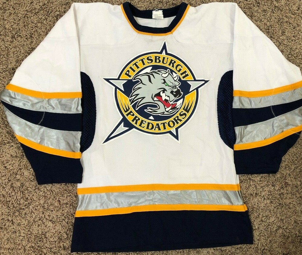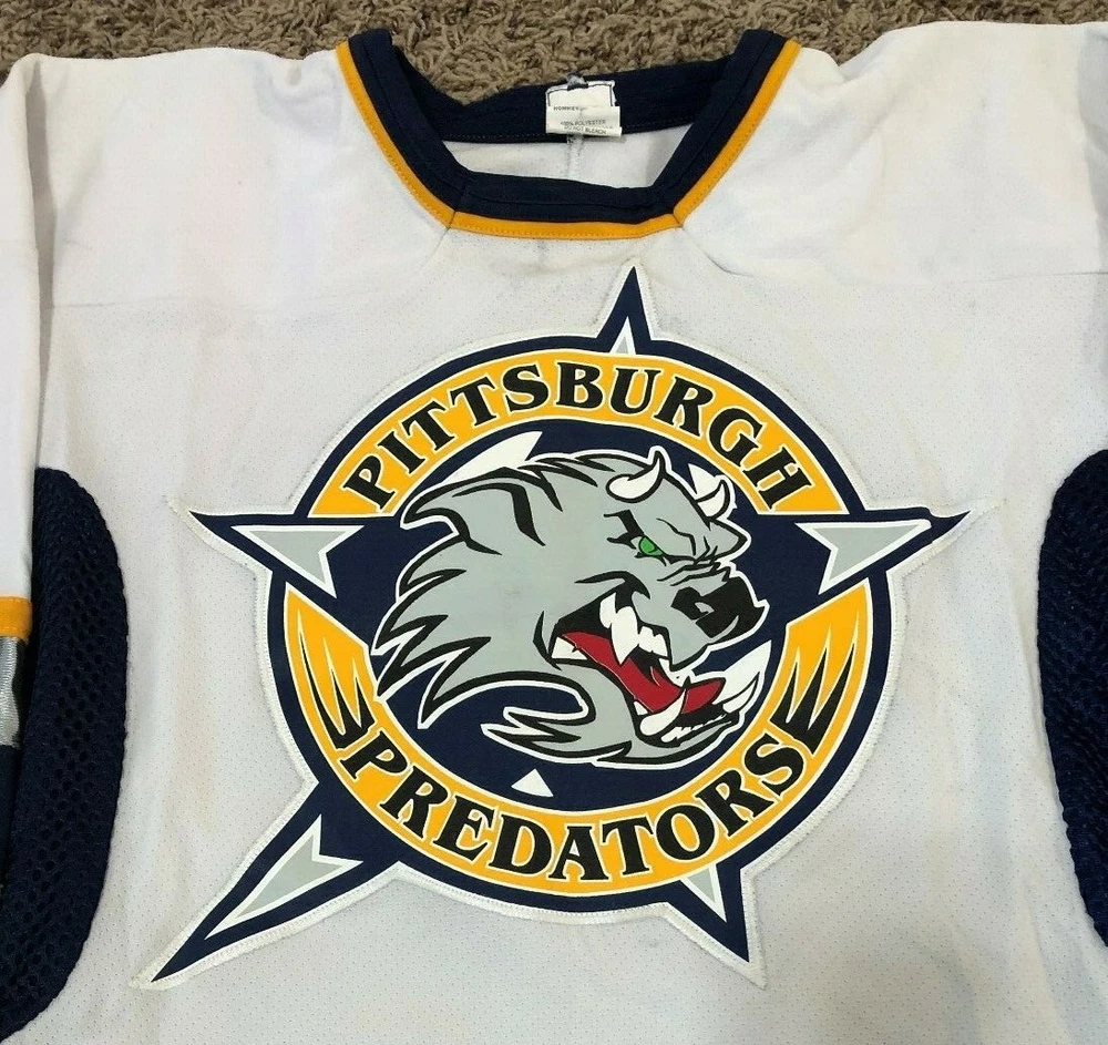 Pittsburgh Predators Hockey Jersey Athletic Knit "AK" brand Men's Small Sullivan #26 (STOP sign on back between name/number) White jersey with blue & yellow trim Sewn numbers/letters/logo on front and back Ice Castle Arena "Founded 2000" patch on shoulders Measurements: Pit to pit - 21" Back of neck to bottom - 27" Pre-owned, but still in excellent condition Please view all images for exact details Add'l $9 shipping