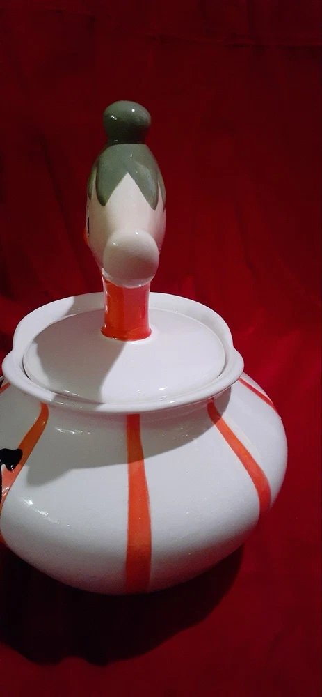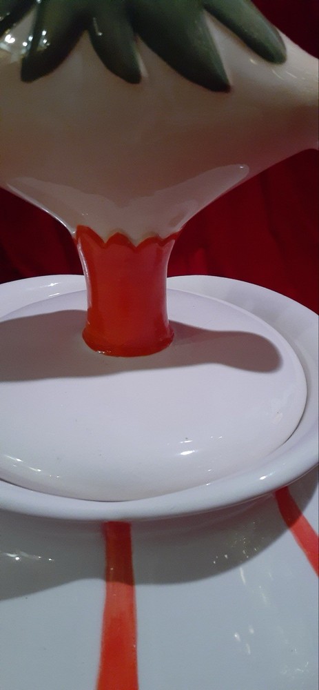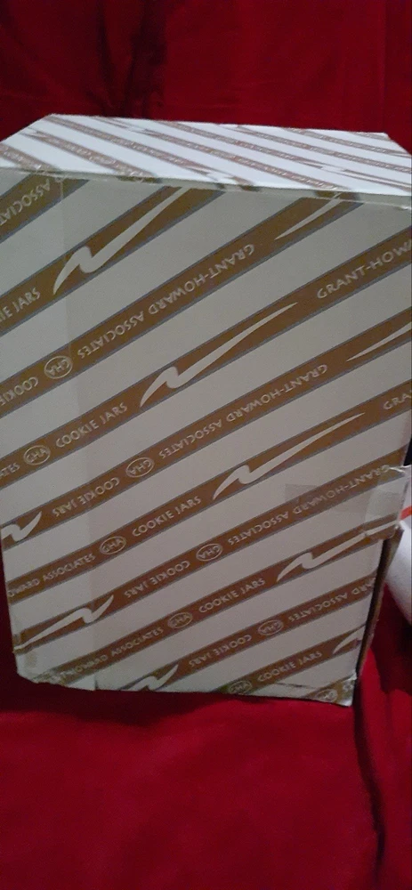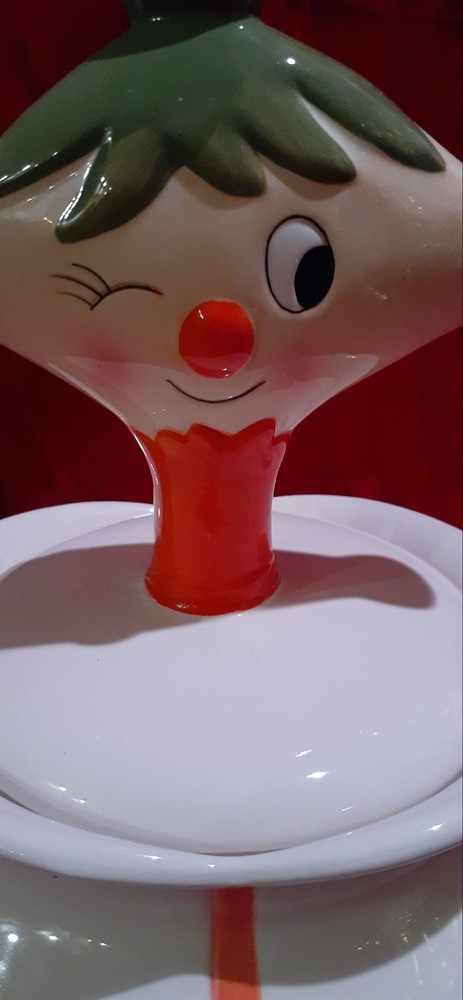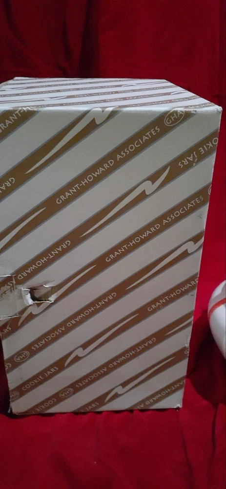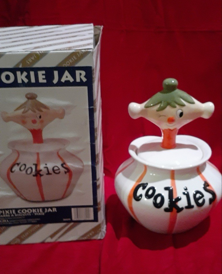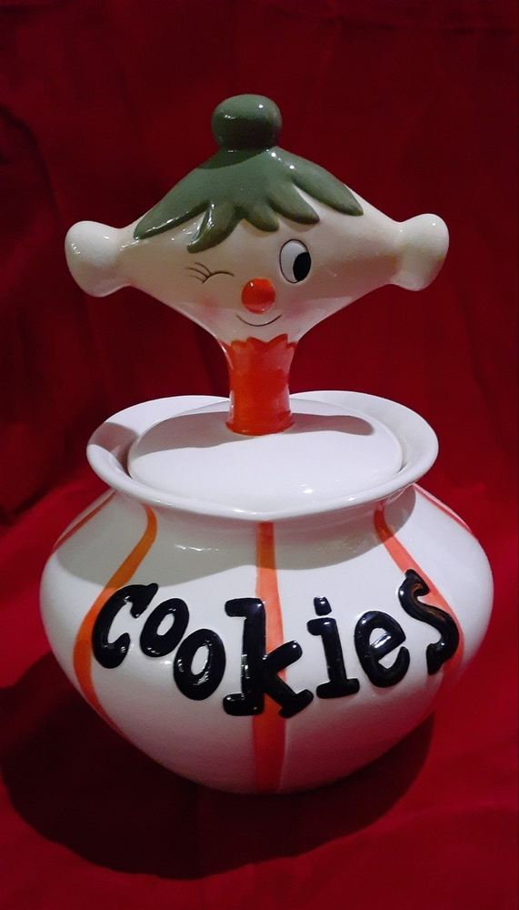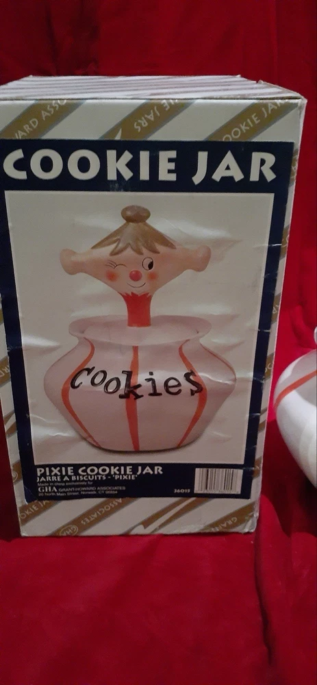 Pixieware Cookie Jar Grant Howard MCM with Original Box. The neck has been professionally repaired (see photos, it looks really good.)There is no silicone ring on lid. Please see pictures of box- is has some damage. The cookie jar box has original styrofoam inserts. This will be packed with extreme care- note my excellent feedback as a seller for over twenty-five years.