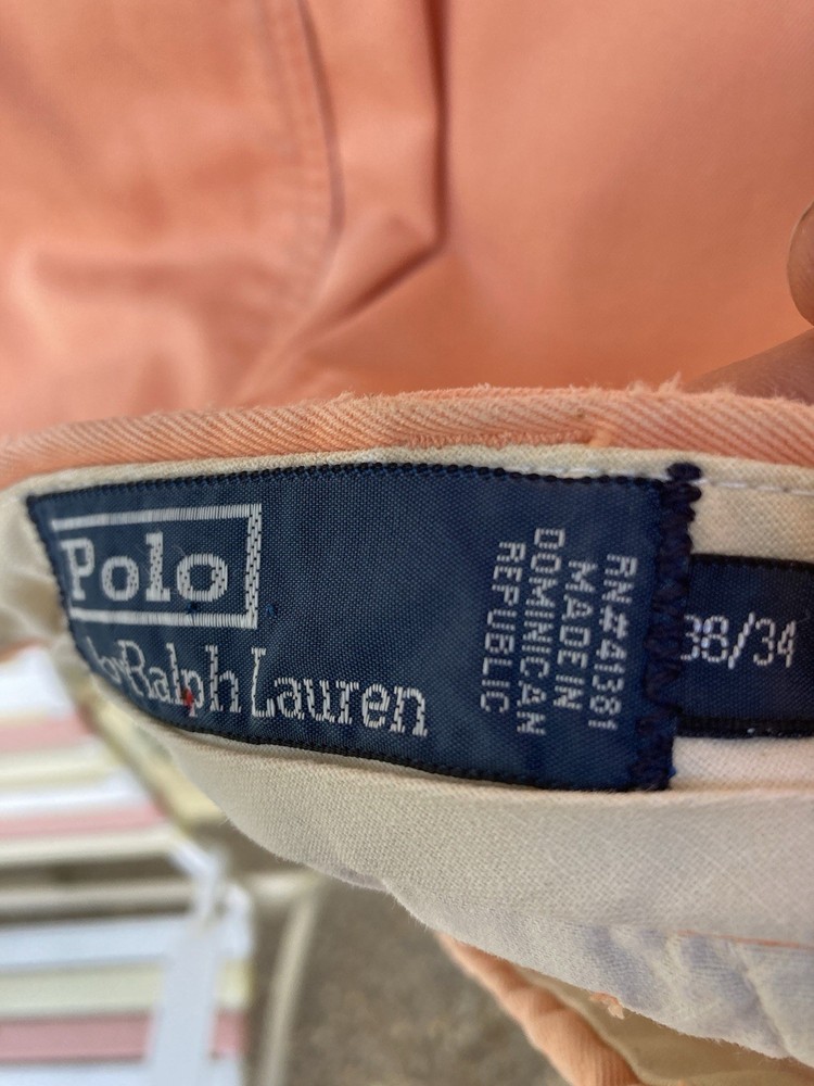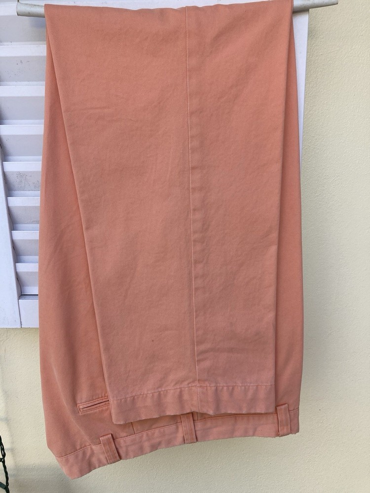 Add a touch of preppy elegance to your wardrobe with these Polo Ralph Lauren men's chino pants in a vibrant orange pastel shade. Perfect for various occasions, from casual outings to business meetings or even cocktail parties, these pants offer a versatile addition to your collection. They feature a comfortable mid-rise and a straight leg style with a 34-inch inseam, ensuring both a flattering fit and ease of movement. Crafted from all cotton and designed with convenience in mind, these pants include easy-care fabric and are machine washable. Details such as a flat front, paired with a traditional button and zip closure, enhance the pants' classic appeal. With practical pockets and a regular size 38 fit, they strike the perfect balance between functionality and timeless style. Worn very little, in excellent condition; professionally dry cleaned and from a pet free, smoke free home. Orig. $118.