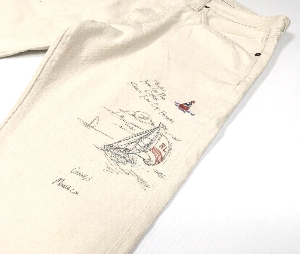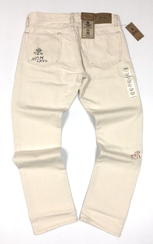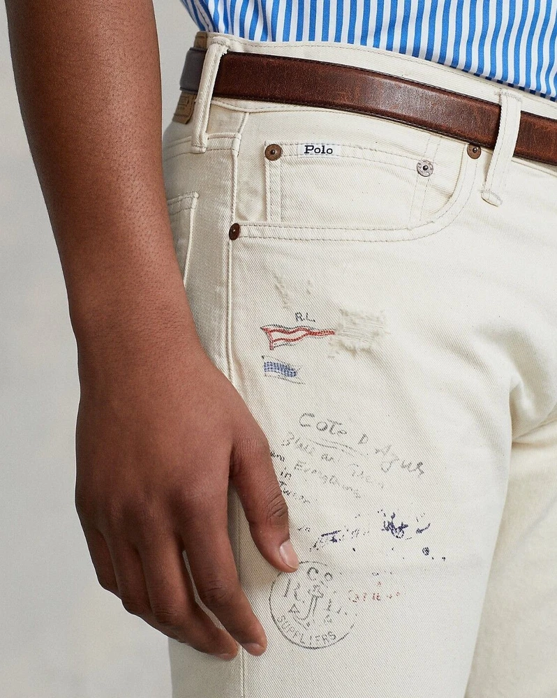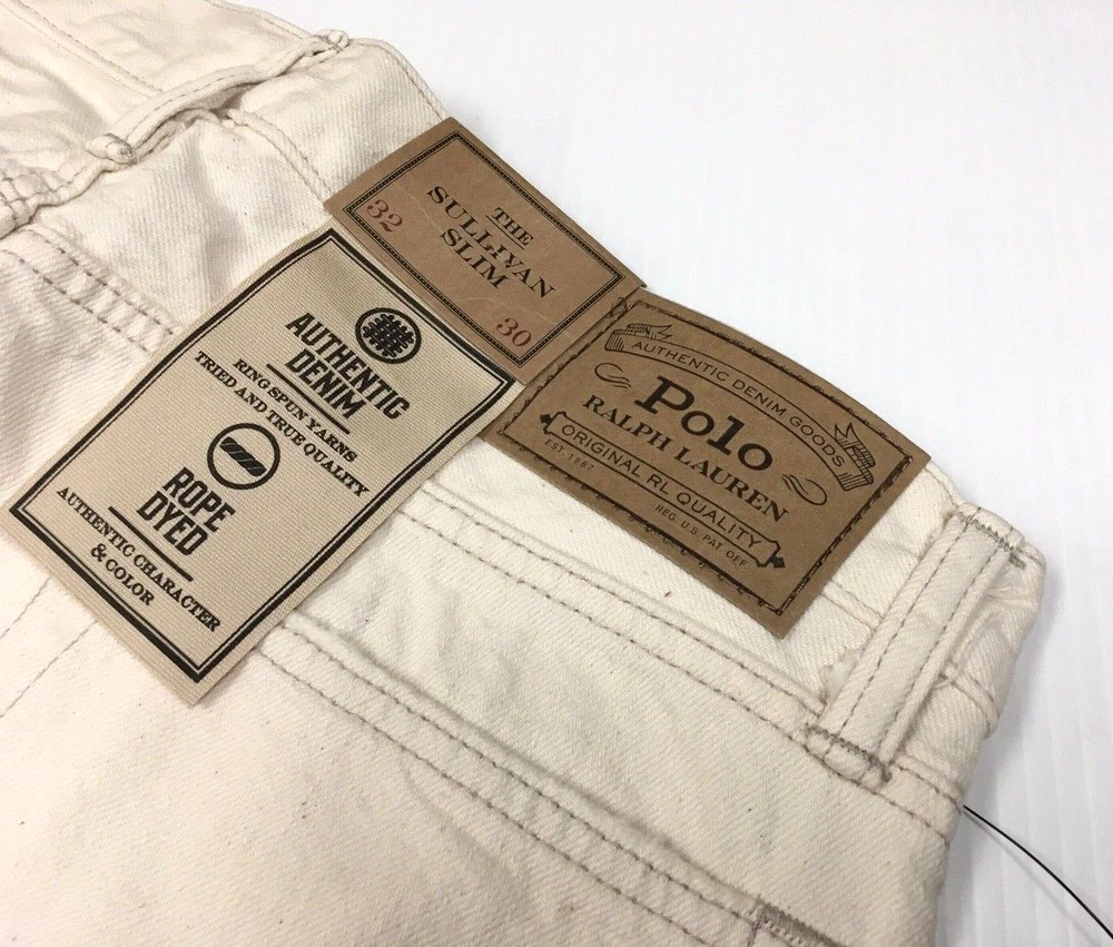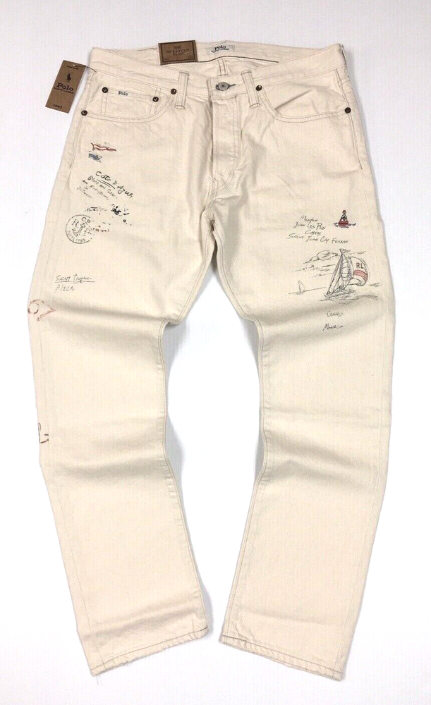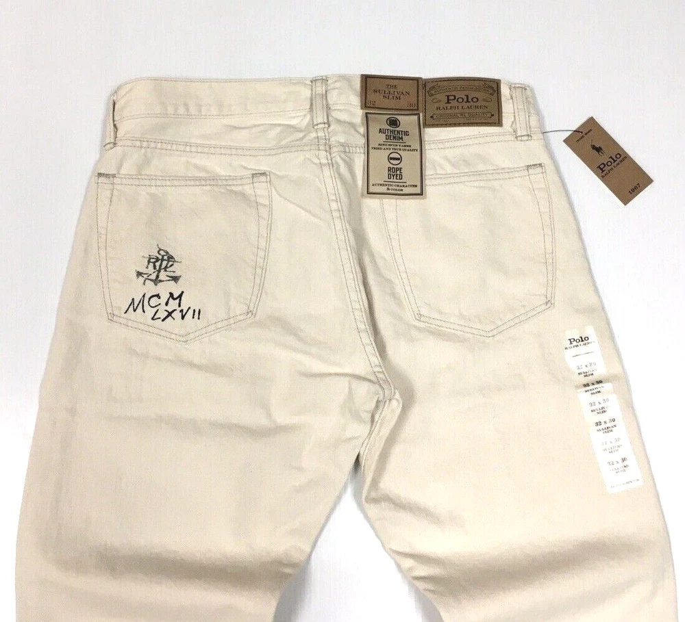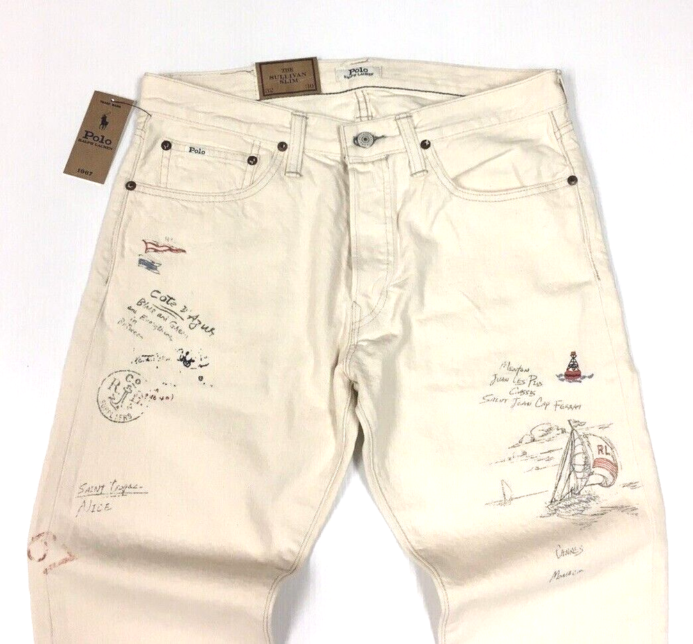 The Sullivan features a low rise and is trim through the seat and the thigh with a tapered leg. Crafted from natural seeded denim, this version combines nuanced repairs with signature screen-prints and hand-drawn nautical motifs rendered in embroidery. Brand new with tags. Color: Cream The Sullivan Slim: Our signature slim fit sits below the waist and is trim through the seat and the thigh with a tapered leg from the knee down. Size 32W has an 8¾" rise and a 14" leg opening. Low rise with tapered leg. Garment rope dyed. Belt loops. Button fly with a signature buttoned closure. Five-pocket styling with signature metal rivets. "Polo" label at the coin pocket. "Polo Ralph Lauren" leather patch at the back right waist. Cotton. Machine washable. Due to the natural characteristics of this material, the coloring may rub off onto fabrics and upholstery. Model is 6'1"/185 cm and wears a size 32W x 32L.