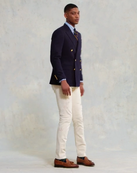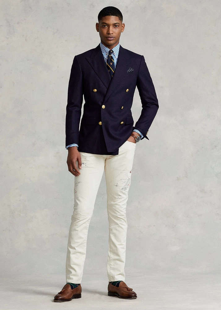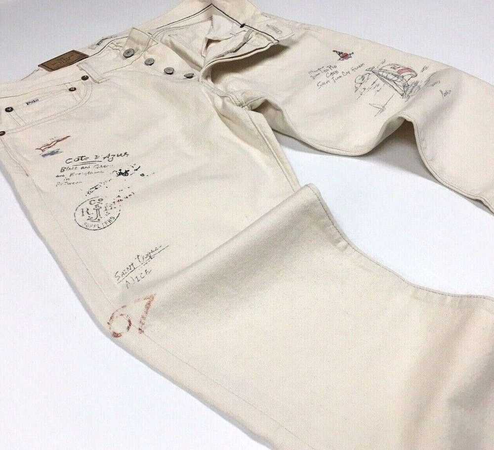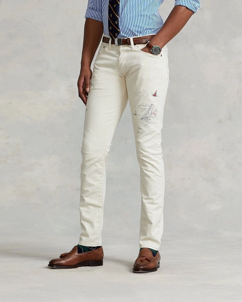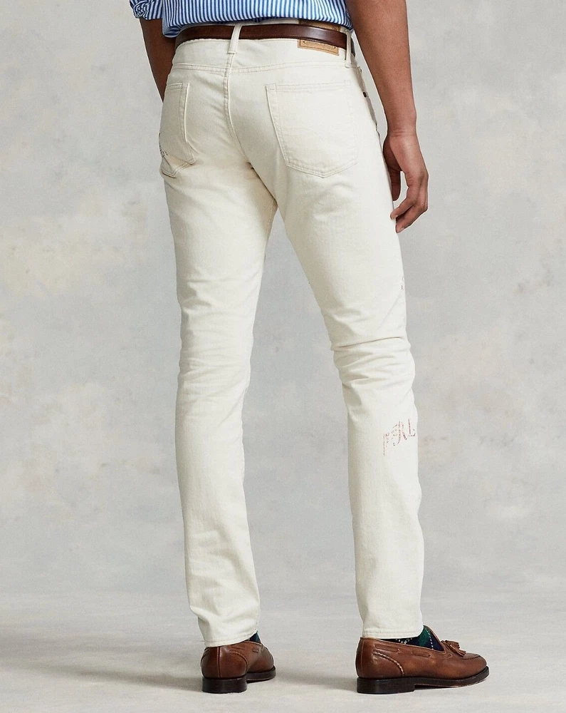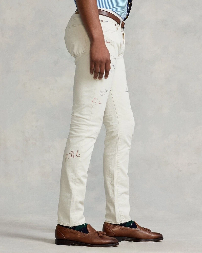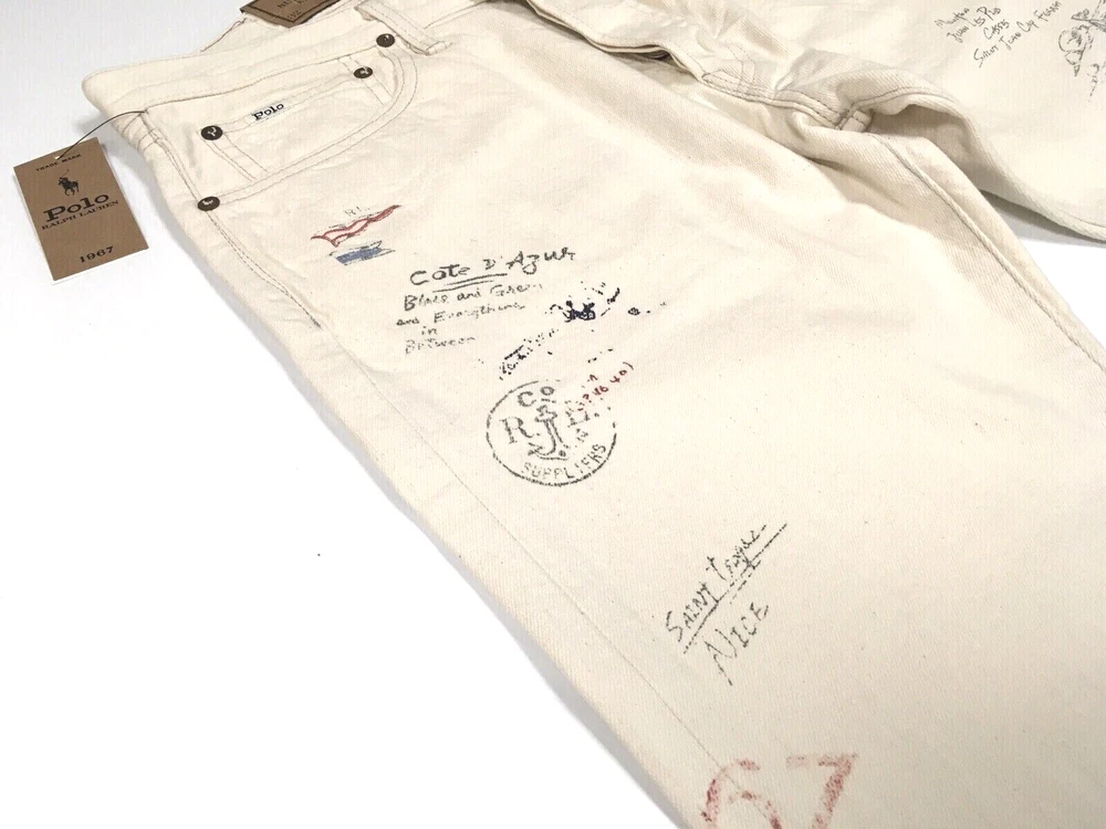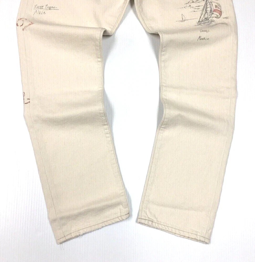 The Sullivan features a low rise and is trim through the seat and the thigh with a tapered leg. Crafted from natural seeded denim, this version combines nuanced repairs with signature screen-prints and hand-drawn nautical motifs rendered in embroidery. Brand new with tags. Color: Cream The Sullivan Slim: Our signature slim fit sits below the waist and is trim through the seat and the thigh with a tapered leg from the knee down. Size 32W has an 8¾" rise and a 14" leg opening. Low rise with tapered leg. Garment rope dyed. Belt loops. Button fly with a signature buttoned closure. Five-pocket styling with signature metal rivets. "Polo" label at the coin pocket. "Polo Ralph Lauren" leather patch at the back right waist. Cotton. Machine washable. Due to the natural characteristics of this material, the coloring may rub off onto fabrics and upholstery. Model is 6'1"/185 cm and wears a size 32W x 32L.