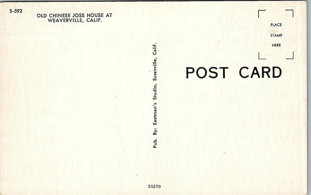 Absolutely love this vintage postcard! The image of the Weaverville Joss House is beautifully preserved with great detail. Seller was super helpful—clear photos and quick responses. Perfect for collectors who appreciate historical cards. It's in fantastic condition for its age, exactly as described. A wonderful addition to my postcard collection! Highly recommend this seller.
