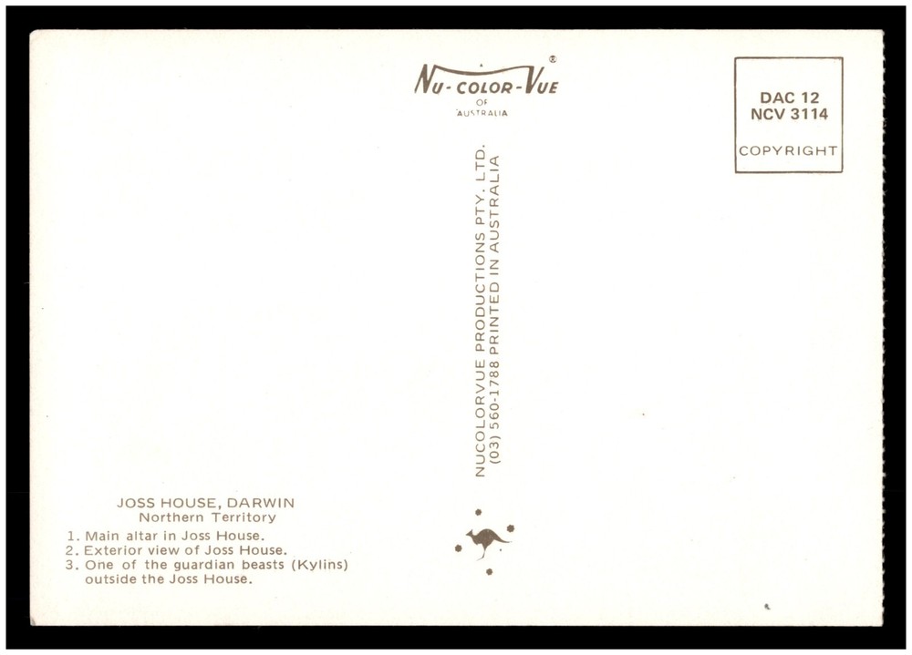 Postcard RPPC - Joss House, Darwin, Northern Territory, N.T. (C13) Unused. Please see the photos to see if there're any imperfections (e.g. creases, nicks, tear, marks/notes, toning). You can zoom in the photos. See the condition of the front and back of the postcard. The stated postage is for within Australia. Overseas buyer will need to pay extra of $20 for the registered airmail and responsible for any tax/customs. *Please see my other collection of vintage postcards* **Can combine Shipping with other purchases, buyer has option to pay tracked or untracked postage. Please note seller is not liable for lost packages for those choosing untracked postage. We will send a photo as proof item has been sent**