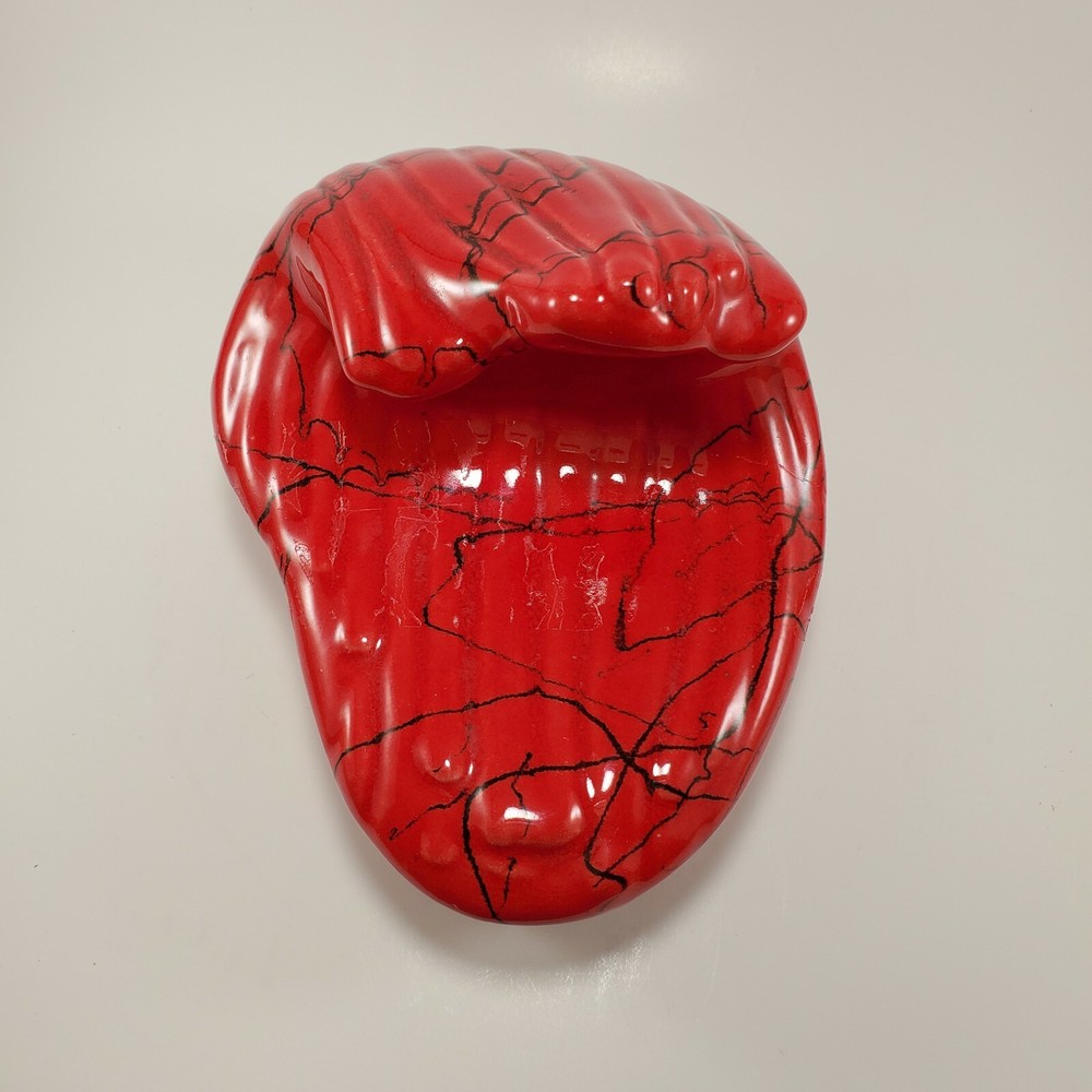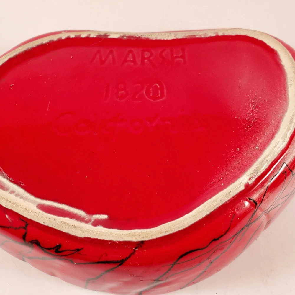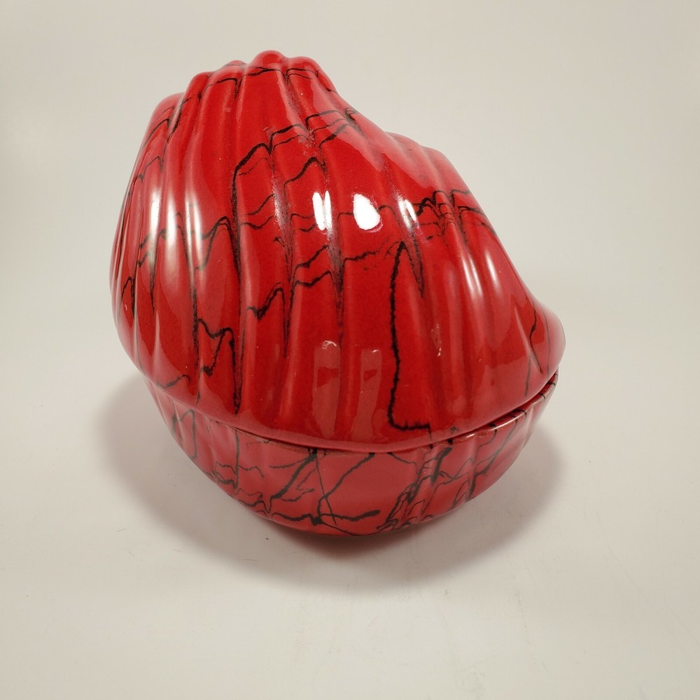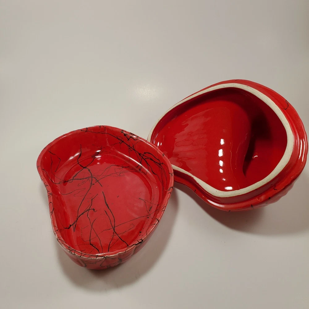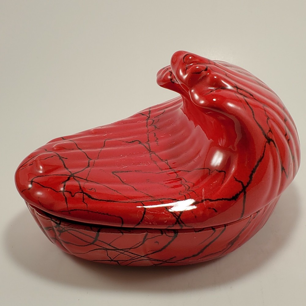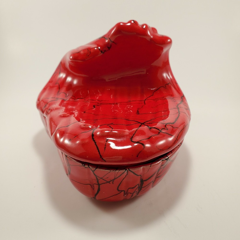 This vintage covered dish from California features a beautiful red glaze and mid-century modern style. The unmarked brand adds to its mystique and the art pottery production technique gives it a unique charm. Its decorative features make it a great addition to any collection. The clay material used to create this dish is of high quality, and the dish has been well-preserved over the years. Its use as a functional dish is not recommended, but it serves as a great decorative piece. Add a touch of vintage charm to your home with this beautiful California dish. Shipping: Choice of Economy or Expedited Mail. Thank you for visiting Like A Boss Lady Vintage. P259D15