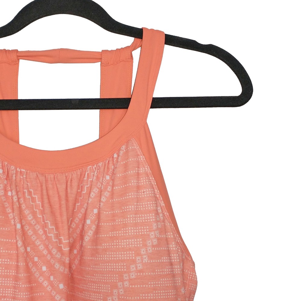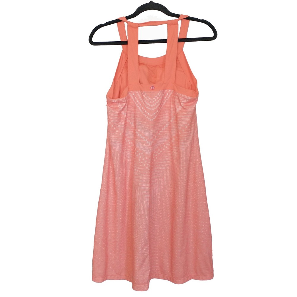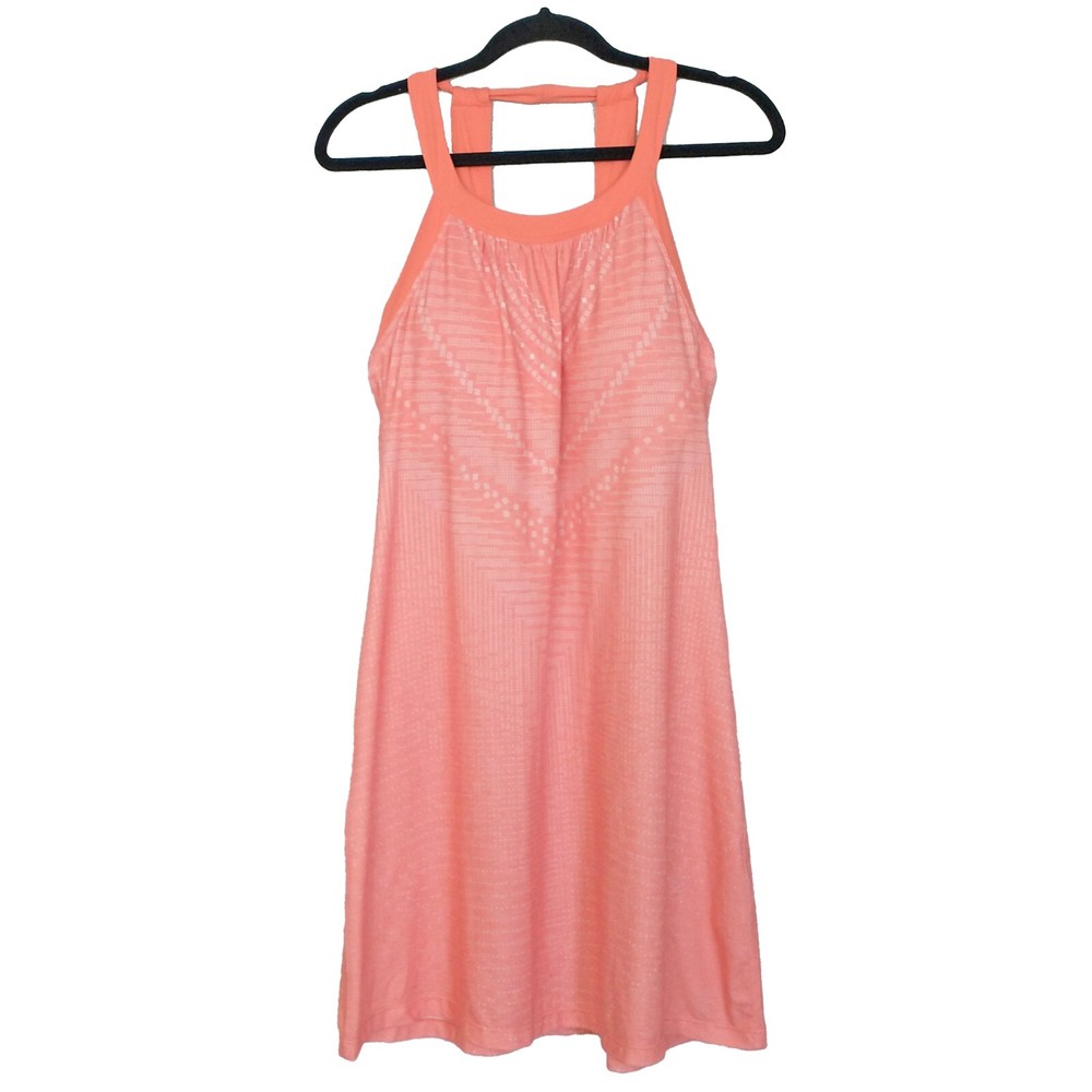 Prana Orange & White Cantine Dress - Size Large. Details: Pull-over style; moisture wicking; halter style dress with double strap back detail. Interior shelf brand with mesh liner & brushed elastic. Removable modesty cups. Size: Large Fabric: 45% recycled polyester; 45% polyester; 10% Lycra elastane Measurements: 37" from shoulder to hem 17" armpit to armpit Condition: Very good with no tears, stains, etc. Style #: W31180358 Shipping included in Buy It Now price. Reasonable offers welcome; please keep in mind that shipping is included. :)