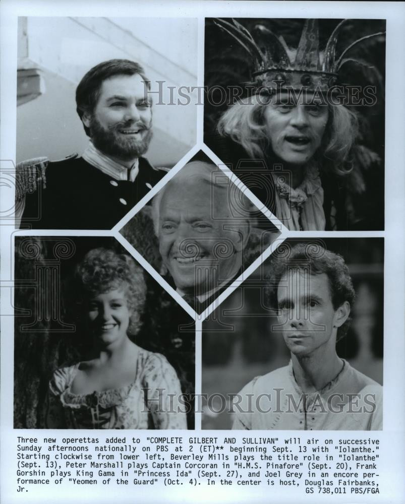 ebay template Note: Please study the images carefully to determine the condition of this vintage photograph, as it may not be in perfect condition. It may contain wrinkles, cracks, and possibly even tears due to its age and how it was handled before it got to us. A scanner may interpret colors and contrast differently than human eyes will, so it is possible that the actual photograph may be slightly darker or lighter in person. This vintage photograph is offered for sale as a collectible item and conveys no transfer of copyright. Press Photo Complete Gilbert And Sullivan - cvb74577 This is an original press photo. Three new operettas added to Complete Gilbert and Sullivan will air on successive Sunday afternoons nationally on PBS at 2 beginning Sept. 13 with Iolanthe. Starting clockwise from lower left, Beverly Mills plays the title role in Iolante, Peter Marshall plays Captain Corcoran in H.M.S. Pinafore. Frank Gorshin plays King Gama in Princess Ida and Joel Grey in an encore performance of Yeomen of the Guard, in the center is host, Douglas Fairbanks, Jr.Photo measures 8 x 10inches. Photo is dated --none. PHOTO FRONT PHOTO BACK Historic Images Part Number: cvb74577 Sell Smarter with Kyozou. Inventory and Ecommerce Management