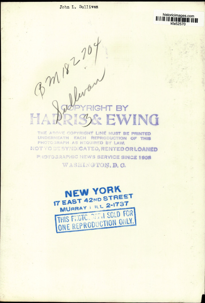 ebay template Note: Please study the images carefully to determine the condition of this vintage photograph, as it may not be in perfect condition. It may contain wrinkles, cracks, and possibly even tears due to its age and how it was handled before it got to us. A scanner may interpret colors and contrast differently than human eyes will, so it is possible that the actual photograph may be slightly darker or lighter in person. This vintage photograph is offered for sale as a collectible item and conveys no transfer of copyright. Press Photo John L. Sullivan - kfa52570 John L. Sullivan. Photo measures 7 x 10.25 inches. Photo Is dated -- none. PHOTO FRONT PHOTO BACK Historic Images Part Number: kfa52570 Sell Smarter with Kyozou. Inventory and Ecommerce Management