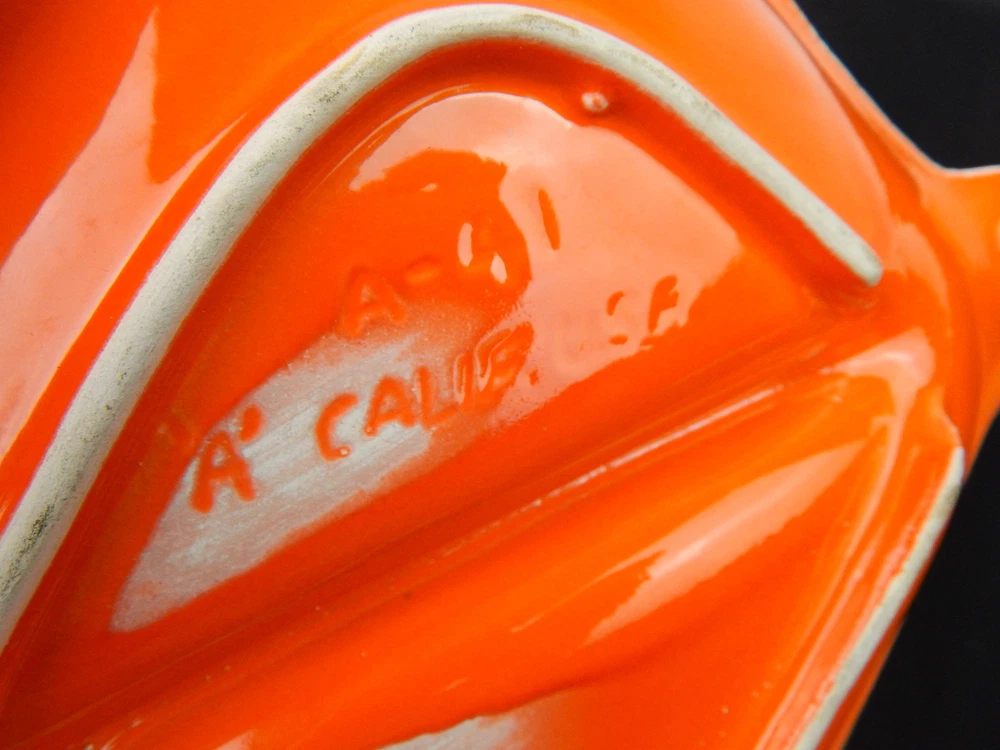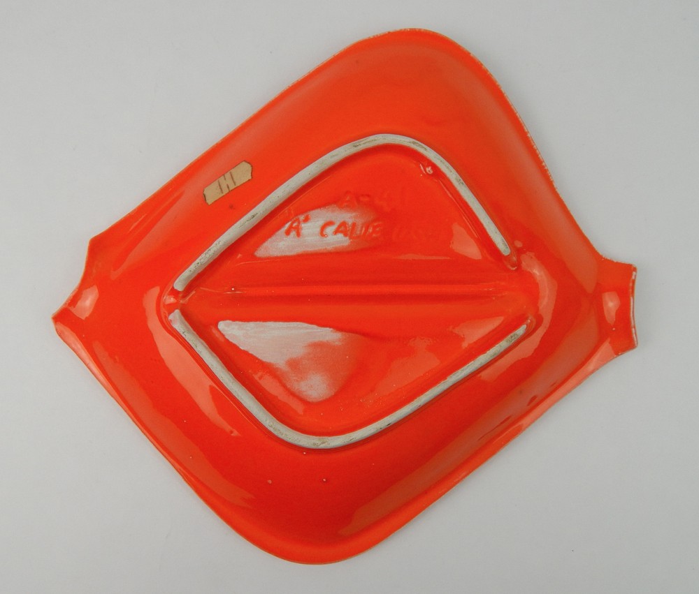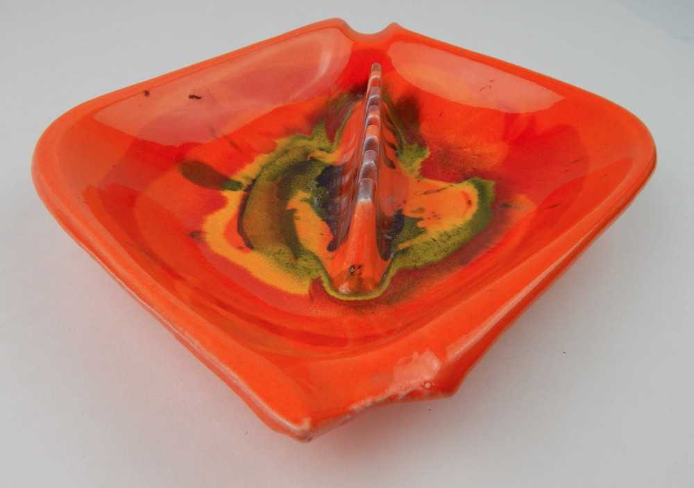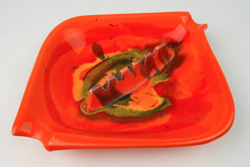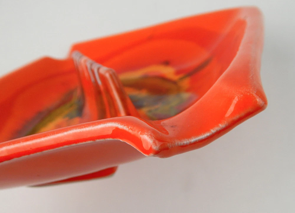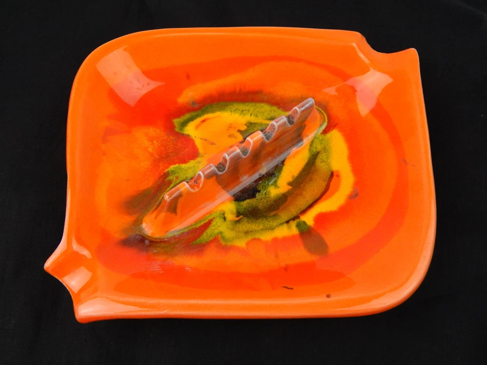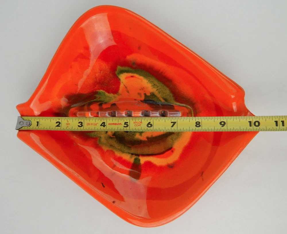Mid-Century Modern California USA pottery ashtray In great condition, no chips but some burn marks 10" measurement from corner rest to rest Other ashtray shown in last photo and is also available in my store The colors & pattern match very closely but not exactly Will be shipped with care from USA