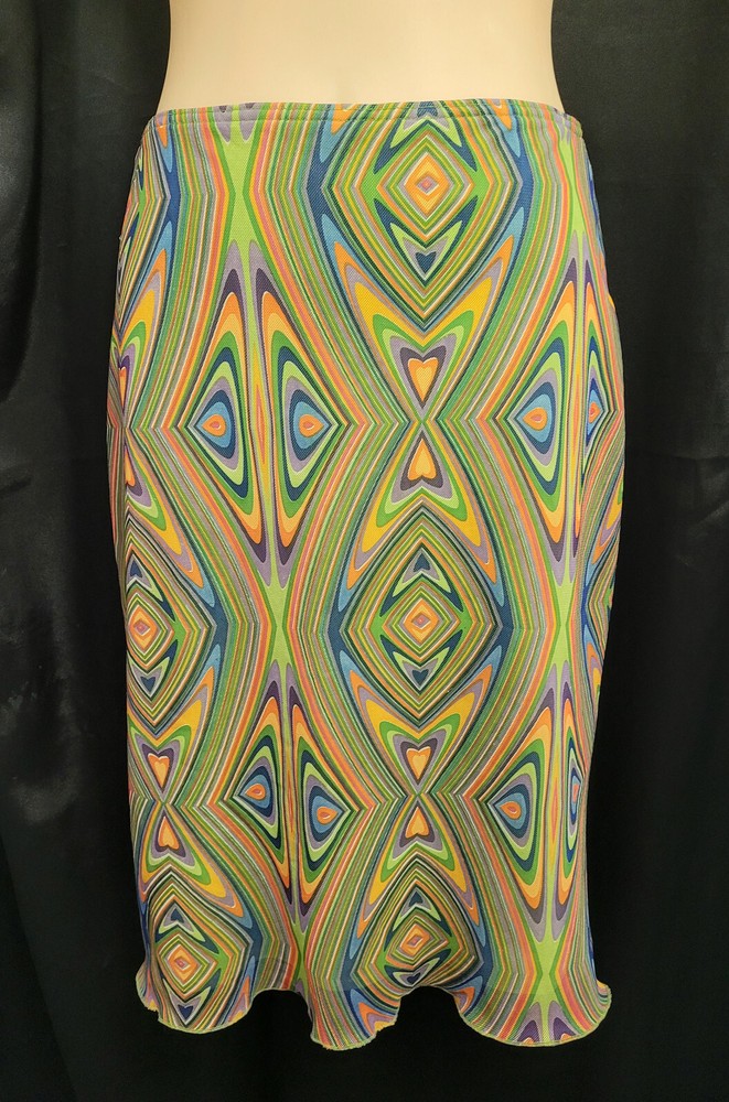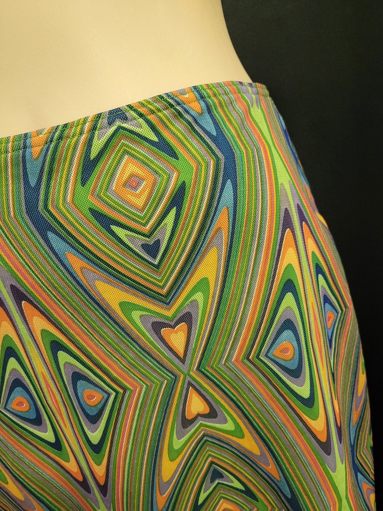 Step in time and keep your groove Featuring: Fabricated from polyester Psychedelic vibrant print Elastic waist Straight skirt Contrasting lime color stretchy lining Measured lying flat un-stretched: Length – 62 cm Hips - 45 cm Waist – 34 cm Hips – 42 cm I combine postage. Please make sure to choose the correct postage service during the check out. As Sendle Courier $7.60 flat rate only covers Sydney Metropolitan area. Outside of that scope item will be posted in satchel with tracking with AU post. Please check out my other items. Thank you.
