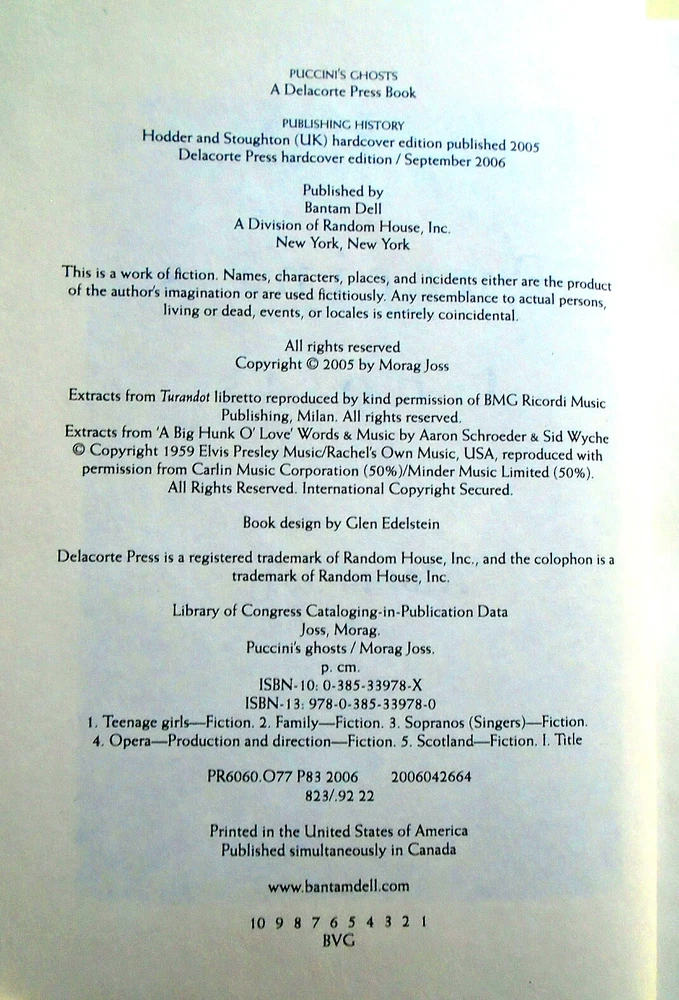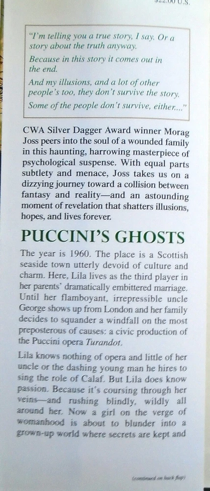 | Synopsis | Fifteen-year-old Lila is in love for the first time, but in the future she maps out for herself, reality and fantasy fuse into a dangerous mixture, one that threatens to destroy Lila and all those around her., CWA Silver Dagger Award winner Morag Joss peers into the soul of a wounded family in this haunting, harrowing masterpiece of psychological suspense. With equal parts subtlety and menace, Joss takes us on a dizzying journey toward a collision between fantasy and reality--and an astounding moment of revelation that shatters illusions, hopes, and lives forever. The year is 1960. The place is a Scottish seaside town utterly devoid of culture and charm. Here, Lila lives as the third player in her parents' dramatically embittered marriage. Until her flamboyant, irrepressible uncle George shows up from London and her family decides to squander a windfall on the most preposterous of causes: a civic production of the Puccini opera Turandot. Lila knows nothing of opera and little of her uncle or the dashing young man he hires to sing the role of Calaf. But Lila does know passion. Because it's coursing through her veins--and rushing blindly, wildly all around her. Now a girl on the verge of womanhood is about to blunder into a grown-up world where secrets are kept and exposed, hopes soar and wither, and where crimes petty and great exact the most chilling punishments of all. Masterfully paced and spellbinding till its final, haunting scene, Puccini's Ghosts is a piercing look into the fierce darkness that lurks behind seemingly ordinary lives. |