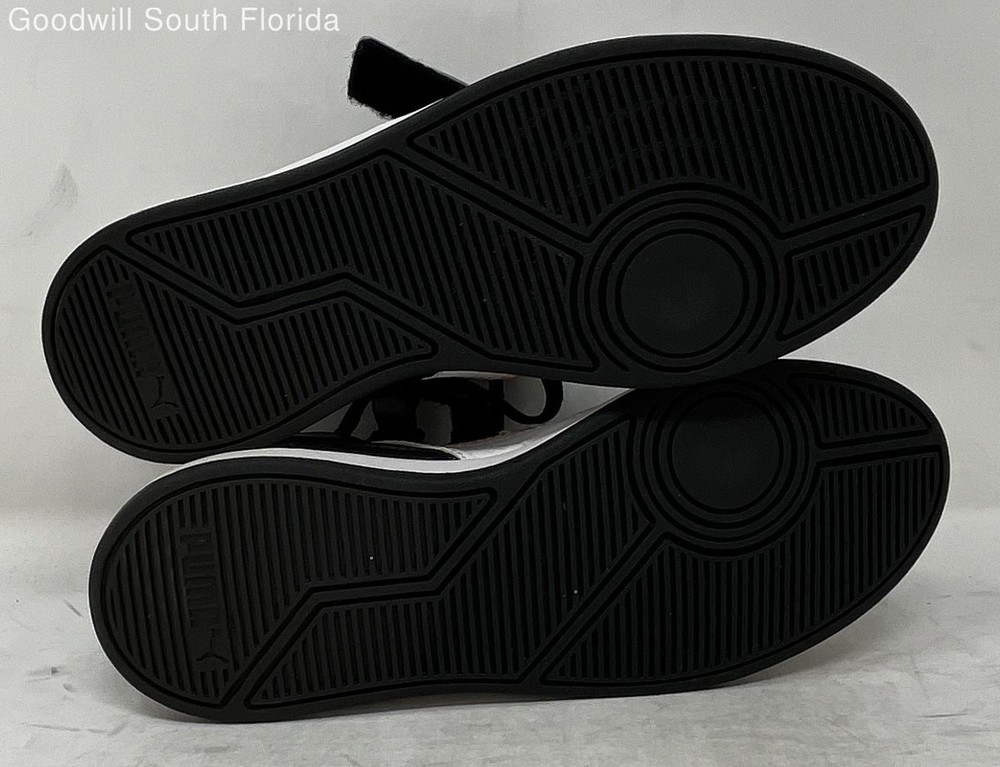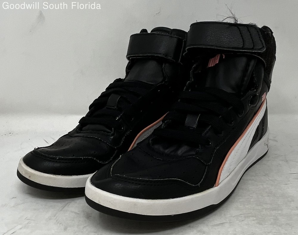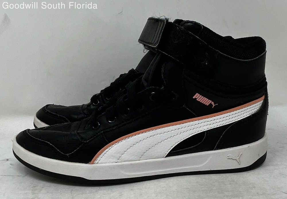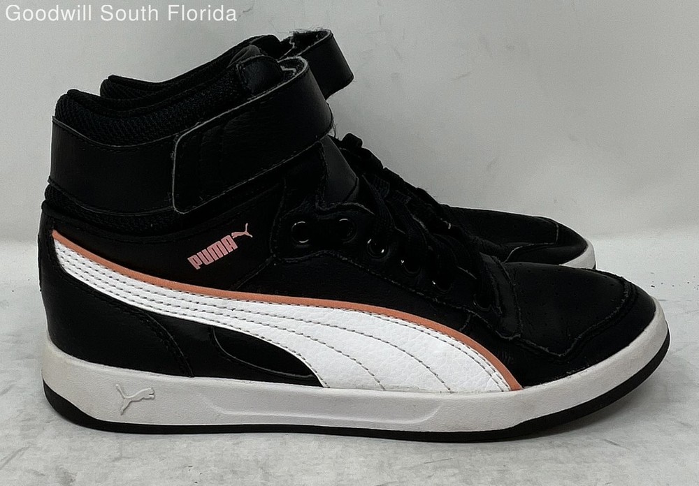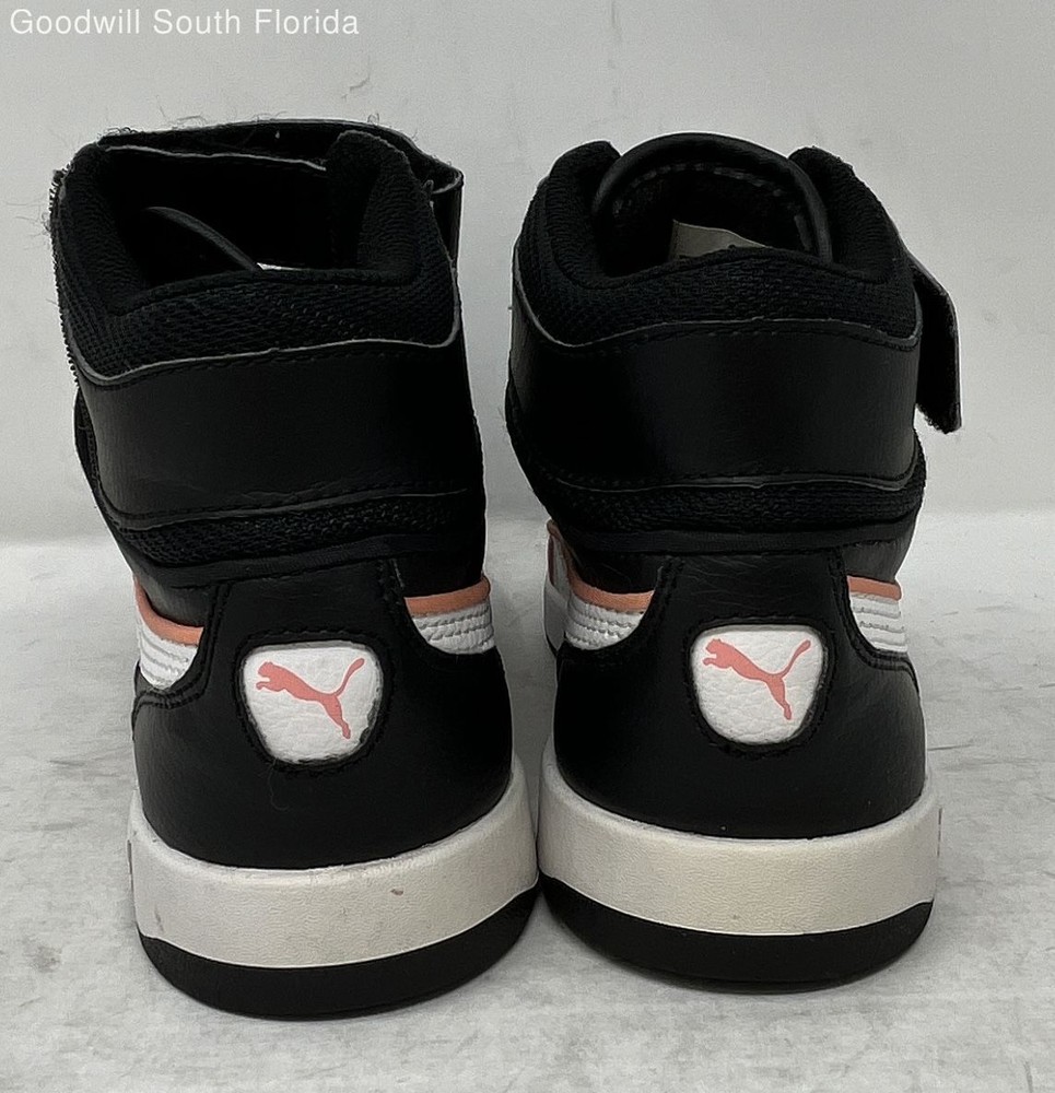 Puma Boys Liza Mid Dazz 361471-01 Black White Orange High Top Sneaker Shoes 4.5 Brand: Puma Department: Boys Color: Black, White, Orange Style: Sneaker Size: 4.5 Pattern: Solid Type: Athletic Material: Leather Condition: Pre-owned We are committed to the sanitization of all our products to ensure safety and cleanliness for our customers. All shoes available for purchase have been professionally cleaned and disinfected by our sneaker restoration team prior to listing for sale. We use a high-grade disinfectant formula which is EPA registered to kill as many as 64 micro-organisms that eliminates odors and kills bacteria, viruses, fungi, mold, and 99.9% of germs.