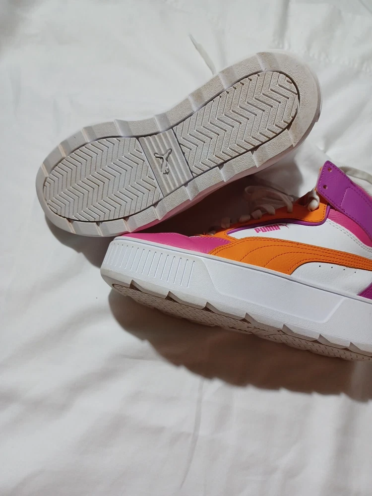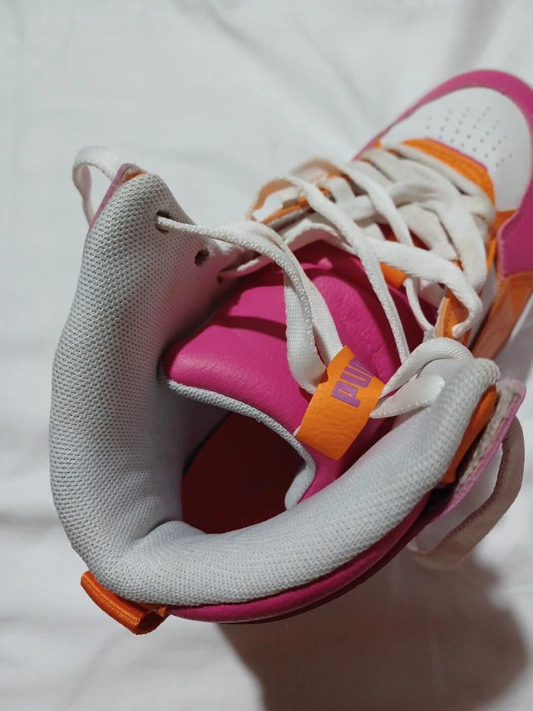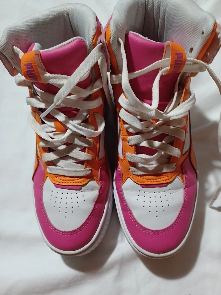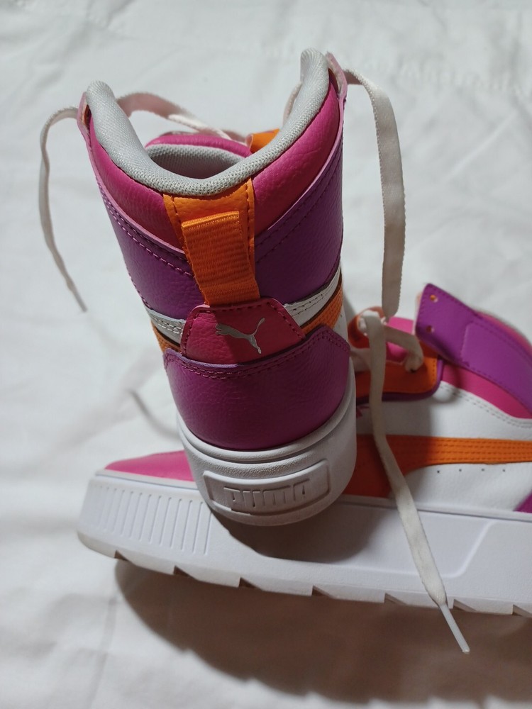 Elevate your little girl's style with these Puma Karmen Rebelle mid-sneakers. The pink, white, and orange color combination adds a pop of color to any outfit, making them perfect for casual wear or activewear. The lace-up closure ensures a secure fit, while the logo accents give these sneakers a trendy touch. These sneakers are designed for girls and come in a size 5.5 US/37.5 EU. They are part of the Puma Karmen product line and are ideal for walking or school. The sneakers have a school theme and are designed with a rainbow character family. Get your hands on these stylish sneakers today! Some creases on the front,inside ia a little discolored from socks, laces a little dirty, and some pilling on inside shown in pictures but overall in great shape. Only worn 2 times.