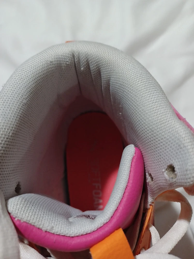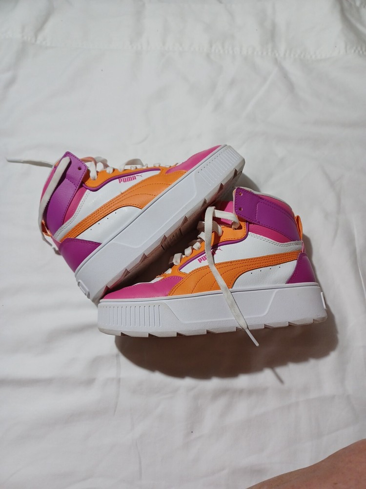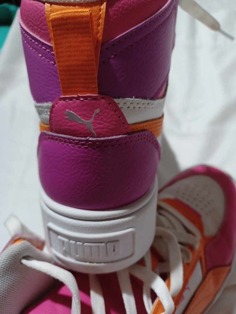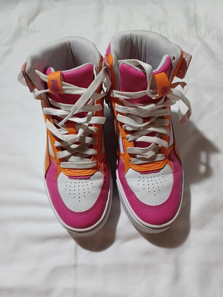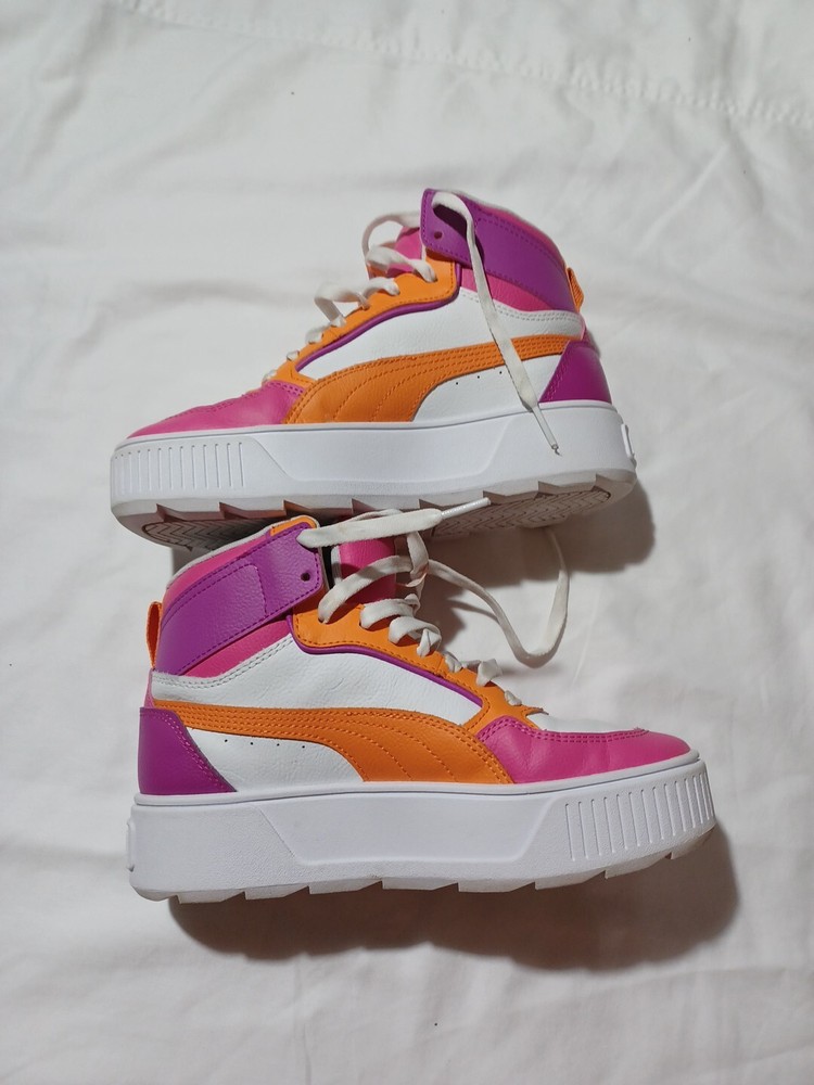 Elevate your little girl's style with these Puma Karmen Rebelle mid-sneakers. The pink, white, and orange color combination adds a pop of color to any outfit, making them perfect for casual wear or activewear. The lace-up closure ensures a secure fit, while the logo accents give these sneakers a trendy touch. These sneakers are designed for girls and come in a size 5.5 US/37.5 EU. They are part of the Puma Karmen product line and are ideal for walking or school. The sneakers have a school theme and are designed with a rainbow character family. Get your hands on these stylish sneakers today! Some creases on the front,inside ia a little discolored from socks, laces a little dirty, and some pilling on inside shown in pictures but overall in great shape. Only worn 2 times.