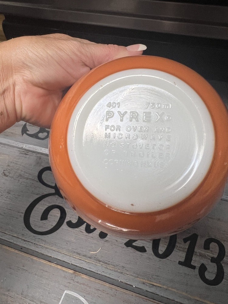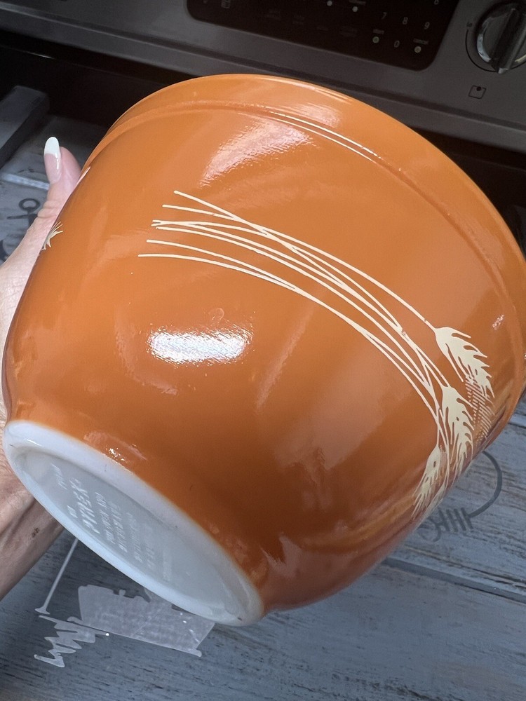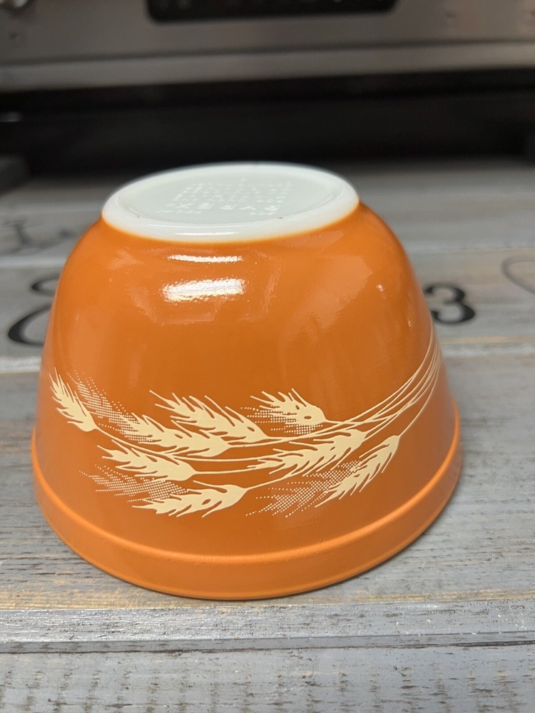 Add a touch of vintage charm to your kitchen with this Pyrex 401 mixing bowl in the Harvest Wheat pattern. Made of durable glass and with a glossy finish, this round bowl has a diameter of 5.5 inches and is perfect for all occasions. The bowl is part of the original Pyrex product line manufactured in the late 20th century (1970-1999) and features an impressed backstamp. With its Mid-Century Modern style, this Pyrex mixing bowl is ideal for collectors or anyone who appreciates retro kitchenware. Whether you use it for baking or simply as a decorative piece, this bowl is sure to bring warmth and a touch of nostalgia to your home.