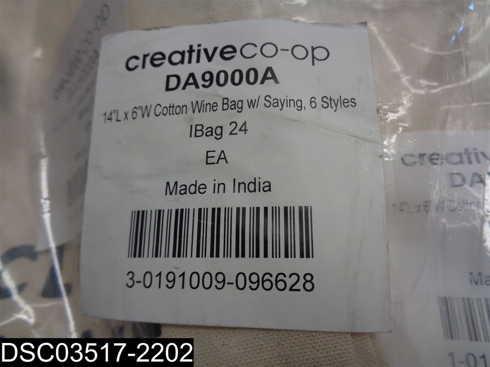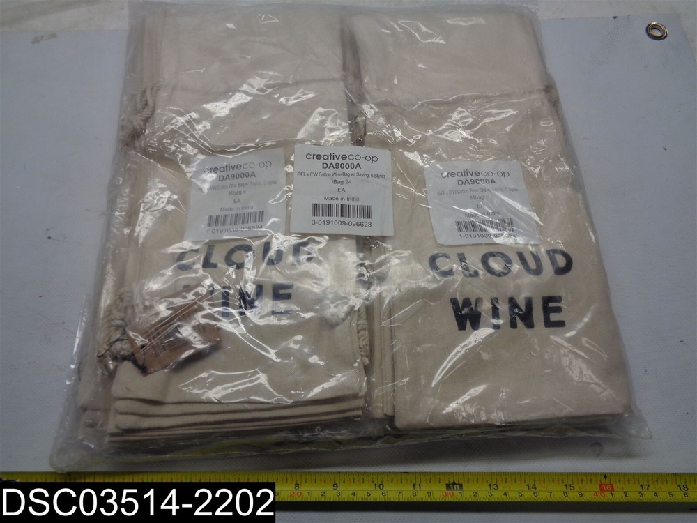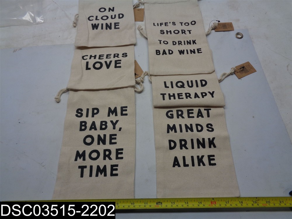 This item is:_____________QTY=24 (4 pks x 6) DA9000A Creative Co-op 14" x 6" Cotton Wine Bags W/ Sayings ___________ This item is new, however, The original packaging may be missing or imperfect. See photos. Includes only what is shown in the picture. 1005 Warehouse Location: Warehouse #1 Shelf______________12171 Box 1495_________ Sales tax will be added to items shipping to locations in Kansas. _____________________________________________________________________ _____________________________________________________________________ _____________________________________________________________________ By bidding and or purchasing this item(s) you (the buyer) agree to the following terms and conditions: 1. An item is defined as the following: The unit or units purchased in the ebay listing, (it could be a single unit, multiple units, a mixture of units, a variety of units, the incorrect unit or any combination of units not mentioned). It also includes the packaging, or lack thereof, the shipping label, and any contents place in the package by error. 2. The Seller is defined as Seller and/or Consignor. 3. The buyer is defined as the entity that purchased the item from Seller and/or Consignor. 4. If the buyer does not agree to these terms and conditions then do not purchase from us. 5. All items are sold AS IS No warranty or liability is expressed or implied. 6. The buyer agrees that: All items are shipped without insurance. It is the responsibility of the buyer to let us know if they want insurance on the item. Insurance cost is $2.00 for every $50 insured, in $50 increments. The buyer agrees that if no insurance is purchased and the item is not received or received damaged that no claim shall be brought against the seller. 7. We only ship to PayPal confirmed street addresses, no exceptions. No PO Boxes, APO, FPO or similar addresses. 8. The buyer agrees that the sale is considered complete once the carrier has picked up the item from the seller. 9. The buyer agrees that if there is a dispute that arises that the dispute will be settled in the State of Kansas under the laws of Kansas. 10. The buyer agrees that the item fits the buyers purpose prior to bidding. 11. The buyer agrees to indemnify and hold harmless the seller from any and all claims arising out of any conditions or defects for the item or items that they purchased 12. We only ship to the continental United States. The shipping price quoted is for the continental United States Only. All other locations will be charged extra. Out of county buyers agree to pay any additional charges that we ask them to pay including but not limited to import duties, shipping costs, packaging costs, time costs, and other costs. If the item is shipped via ebay global shipping program these terms and conditions still apply. 13. Claims made against the carrier for non-delivery, lost in transit or any other reason shall be made solely by the buyer without aid from the Seller. 14. In the event that any clauses or phrases contained here within are ruled out by a judge, the law, a lawyer, jurors, and or any other entity all others remain in effect. 15. If any claim is brought against the Seller the buyer agrees to pay for any and all costs including legal fees, travel, time, accommodations, and other costs. Late payment will result in the seller charging interest at the maximum legal rate. 16. In any event or circumstance the maximum liability to the Seller is the purchase price plus cost of shipping plus sales tax if applicable. This amount is not subject to inflation, interest, inconvenience fee or any other price adjustment. 17. The buyer agrees there will be no refunds for any reason outside of the Ebay return policy. 18. The buyer understands that our items are wholesale, overstock, unclaimed, foreclosure purchase or salvage goods. Most boxes have been opened for inspection and photos. If items are listed as new they may not come with original packaging. 19. The buyer agrees that they are trained, licensed, qualified, and understand how to properly use, dispose of and handle the product in accordance with law and regulations. 20. The buyer agrees that if any part of these terms and conditions is determined to be void that it does not void or alleviate the enforcement of the remainder of this contract. 21. Seller and/or Consignor is not an authorized distributor, reseller or representative of the products featured on this website. All product names, trademarks, brands and logos used on this site are the property of their respective owners. The depiction, description or sale of products featuring these names, trademarks, brands and logos is for identification purposes only and is not intended to indicate any affiliation with or authorization by any rights holder. 22. Restocking fee will apply to all returns.