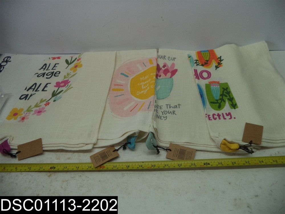 This item is:__________QTY=1 Pack of 4: DF5272A Creative Co-op 28" X 18" Tea Towels With Sayings ________ This item is new, however, The original packaging may be missing or imperfect. See photos. Includes only what is shown in the picture. 1005 Warehouse Location: Warehouse #1 Shelf____________ 7268 Box 471 ________ Sales tax will be added to items shipping to locations in Kansas. _____________________________________________________________________ _____________________________________________________________________ _____________________________________________________________________ By bidding and or purchasing this item(s) you (the buyer) agree to the following terms and conditions: 1. An item is defined as the following: The unit or units purchased in the ebay listing, (it could be a single unit, multiple units, a mixture of units, a variety of units, the incorrect unit or any combination of units not mentioned). It also includes the packaging, or lack thereof, the shipping label, and any contents place in the package by error. 2. The Seller is defined as Sellor and,or Consignor. 3. The buyer is defined as the entity that purchased the item from Sellor and,or Consignor. 4. If the buyer does not agree to these terms and conditions then do not purchase from us. 5. All items are sold AS IS No warranty or liability is expressed or implied. 6. The buyer agrees that: All items are shipped without insurance. It is the responsibility of the buyer to let us know if they want insurance on the item. Insurance cost is $2.00 for every $50 insured, in $50 increments. The buyer agrees that if no insurance is purchased and the item is not received or received damaged that no claim shall be brought against the seller. 7. We only ship to PayPal confirmed street addresses, no exceptions. No PO Boxes, APO, FPO or similar addresses. 8. The buyer agrees that the sale is considered complete once the carrier has picked up the item from the seller. 9. The buyer agrees that if there is a dispute that arises that the dispute will be settled in the State of Kansas under the laws of Kansas. 10. The buyer agrees that the item fits the buyers purpose prior to bidding. 11. The buyer agrees to indemnify and hold harmless the seller from any and all claims arising out of any conditions or defects for the item or items that they purchased 12. We only ship to the continental United States. The shipping price quoted is for the continental United States Only. All other locations will be charged extra. Out of county buyers agree to pay any additional charges that we ask them to pay including but not limited to import duties, shipping costs, packaging costs, time costs, and other costs. If the item is shipped via ebay global shipping program these terms and conditions still apply. 13. Claims made against the carrier for non-delivery, lost in transit or any other reason shall be made solely by the buyer without aid from the Seller. 14. In the event that any clauses or phrases contained here within are ruled out by a judge, the law, a lawyer, jurors, and or any other entity all others remain in effect. 15. If any claim is brought against the Seller the buyer agrees to pay for any and all costs including legal fees, travel, time, accommodations, and other costs. Late payment will result in the seller charging interest at the maximum legal rate. 16. In any event or circumstance the maximum liability to the Seller is the purchase price plus cost of shipping plus sales tax if applicable. This amount is not subject to inflation, interest, inconvenience fee or any other price adjustment. 17. The buyer agrees there will be no refunds for any reason outside of the Ebay return policy. 18. The buyer understands that our items are wholesale, overstock, unclaimed, foreclosure purchase or salvage goods. Most boxes have been opened for inspection and photos. If items are listed as new they may not come with original packaging. 19. The buyer agrees that they are trained, licensed, qualified, and understand how to properly use, dispose of and handle the product in accordance with law and regulations. 20. The buyer agrees that if any part of these terms and conditions is determined to be void that it does not void or alleviate the enforcement of the remainder of this contract. 21. Sellor and,or Consignor is not an authorized distributor, reseller or representative of the products featured on this website. All product names, trademarks, brands and logos used on this site are the property of their respective owners. The depiction, description or sale of products featuring these names, trademarks, brands and logos is for identification purposes only and is not intended to indicate any affiliation with or authorization by any rights holder. 22. Restocking fee will apply to all returns.