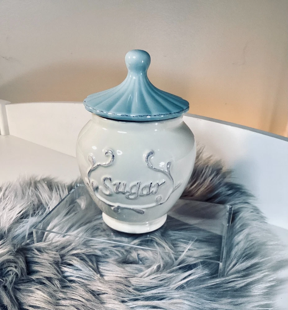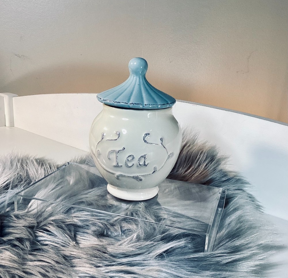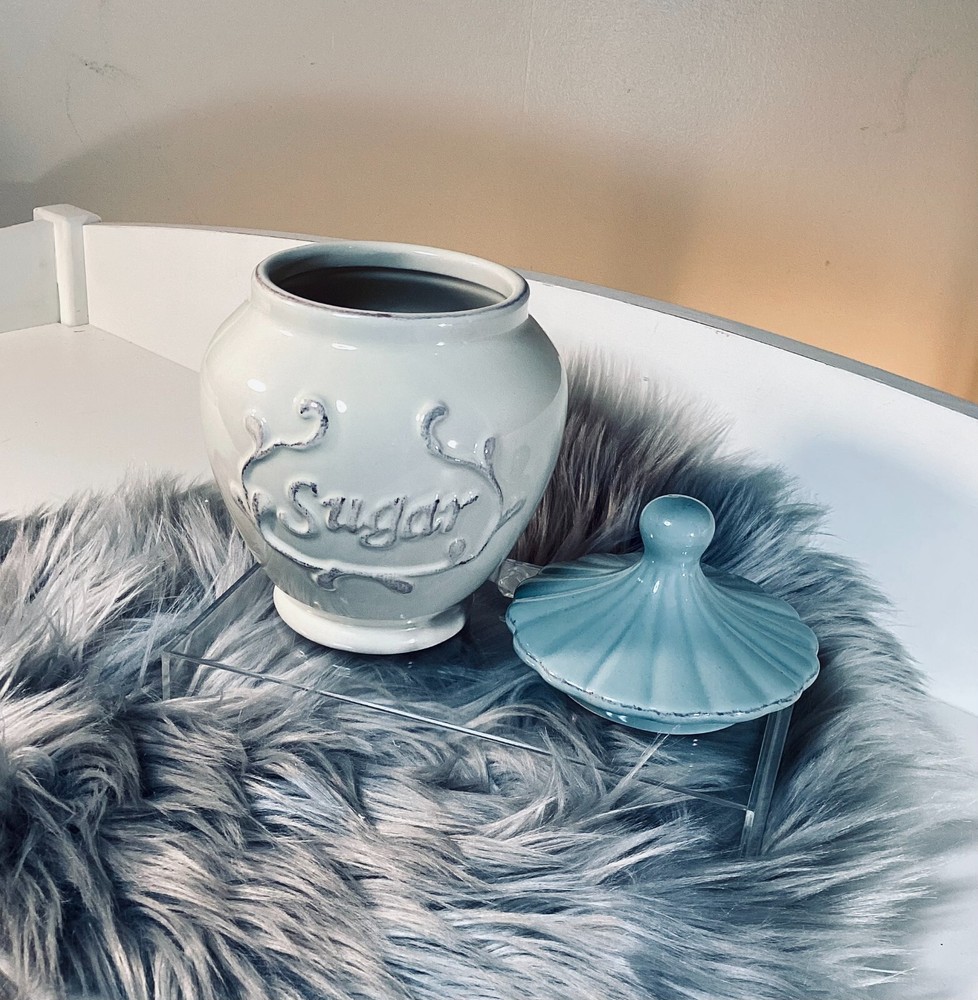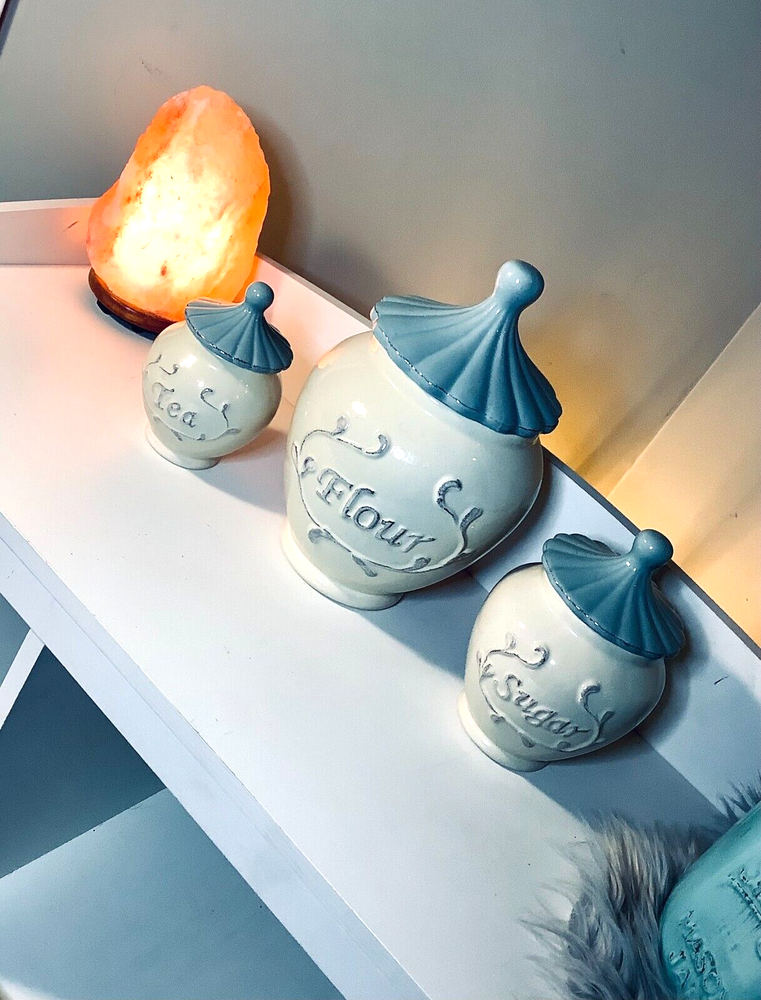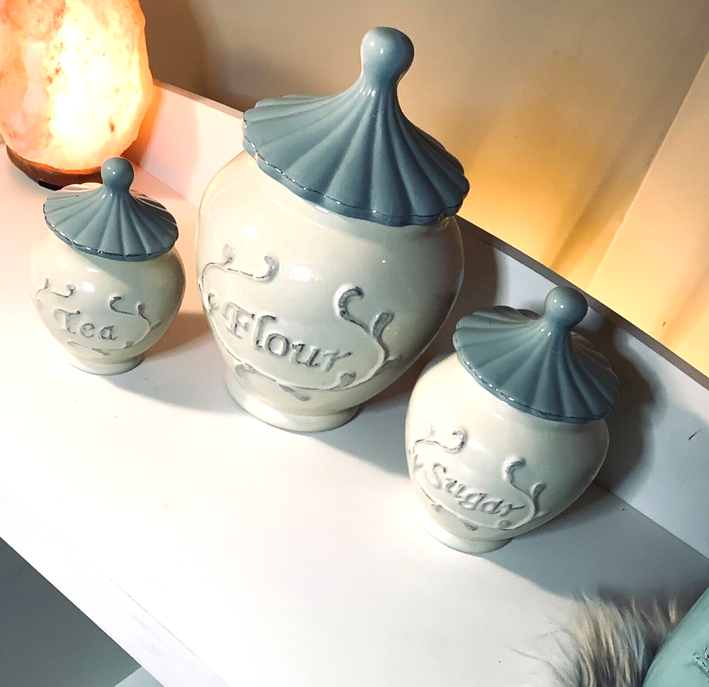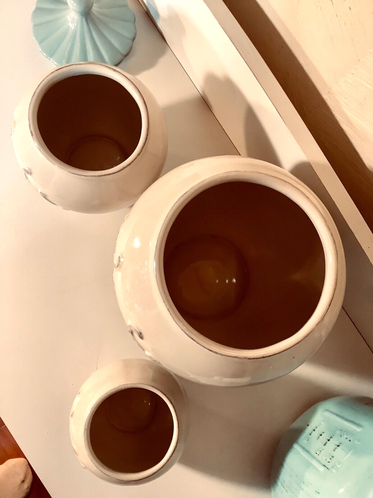 Le Prairie Distressed Stoneware Canister Set by Creative Co-Op - a RARE find! :) Set of three: flour, sugar + tea Tea canister is approximately six and a half inches tall (+ approximately 4.5 inches across at its widest part) Sugar canister is approximately eight and a half inches tall. (+ approx 5.5" across at its widest part) Flour canister is approximately eleven and a half inches tall. (+ approx 8" across at its widest part) excellent pre-loved condition; no chips or cracks - the only flaw is on the back of the tea canister - it looks like a small scuff mark but matches the color of the lid; so I think this happened during the manufacturing process.