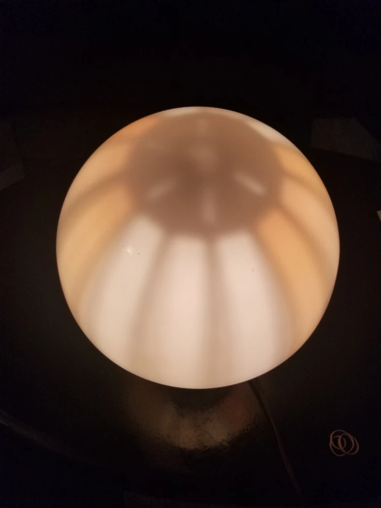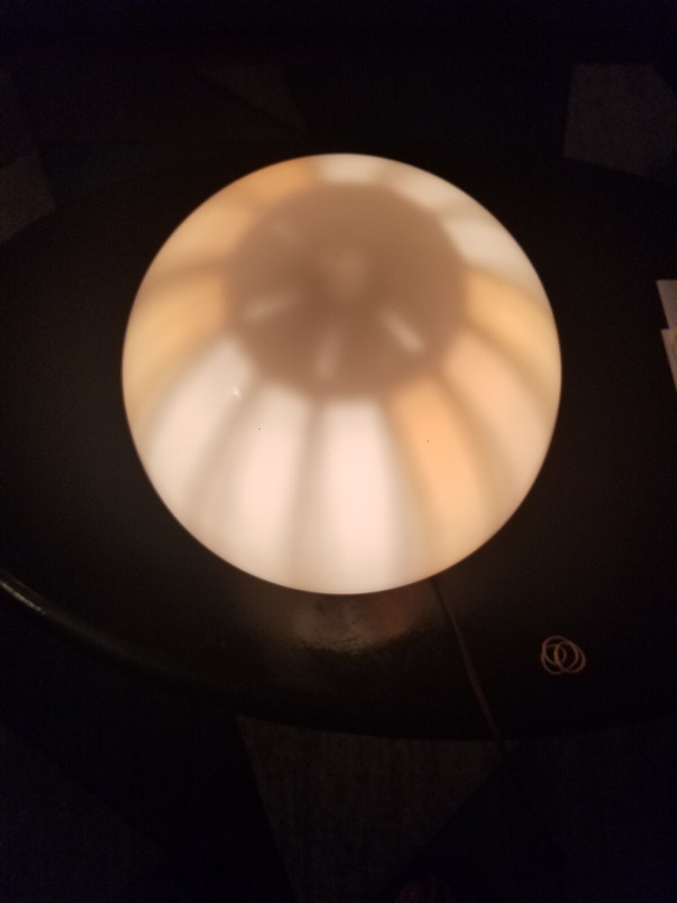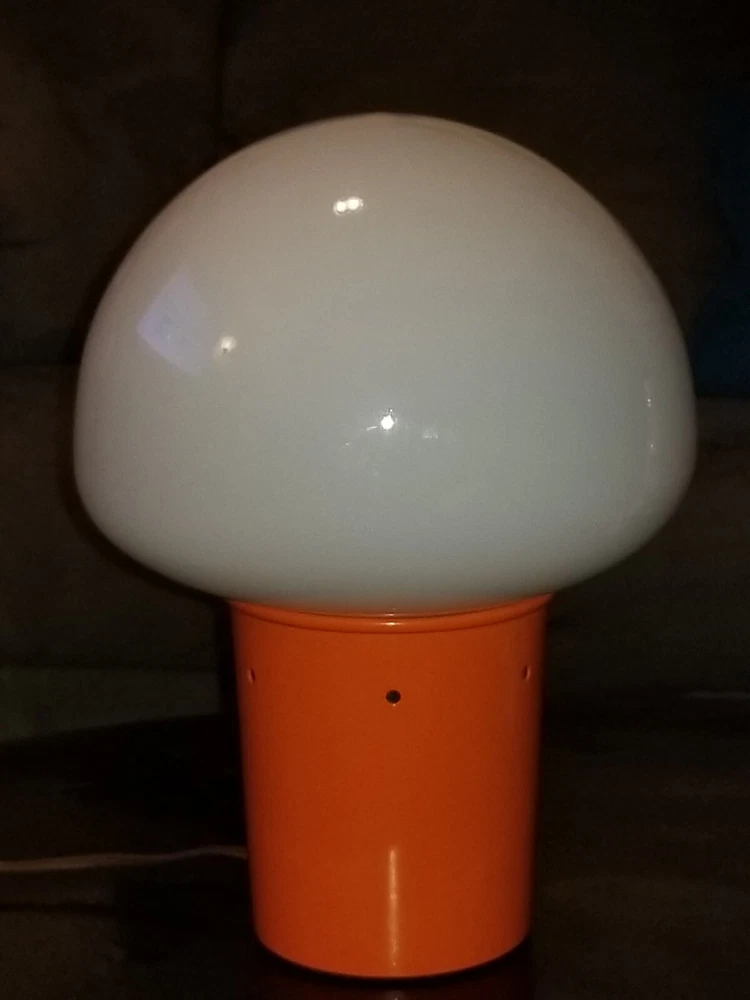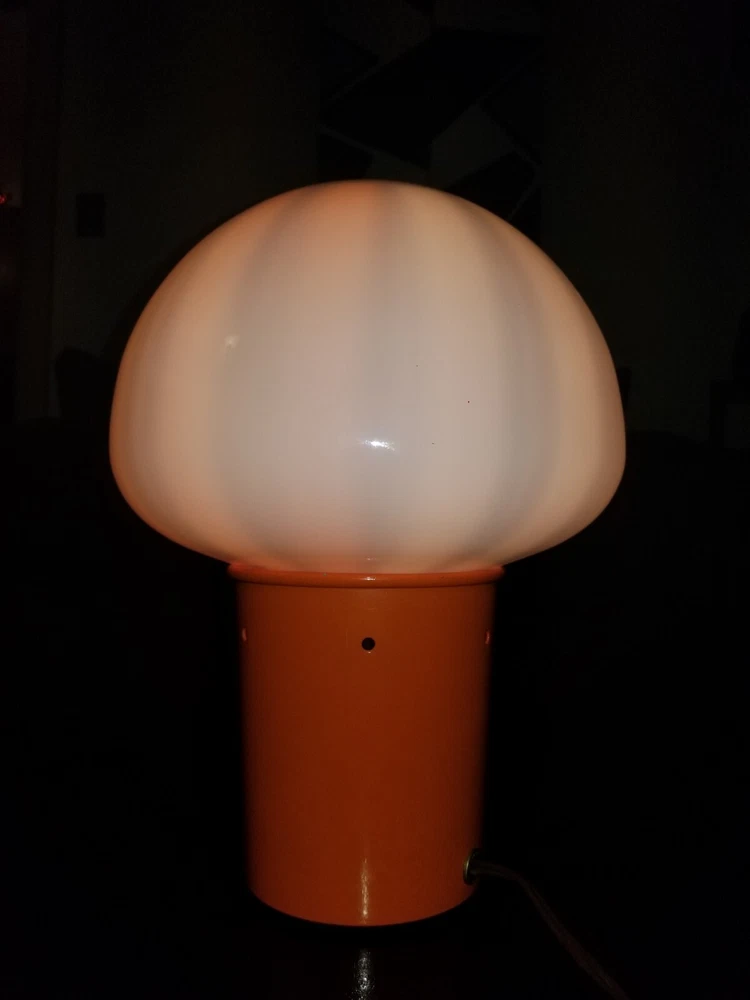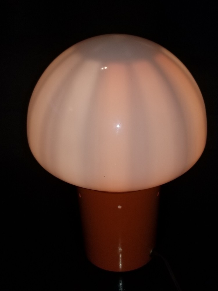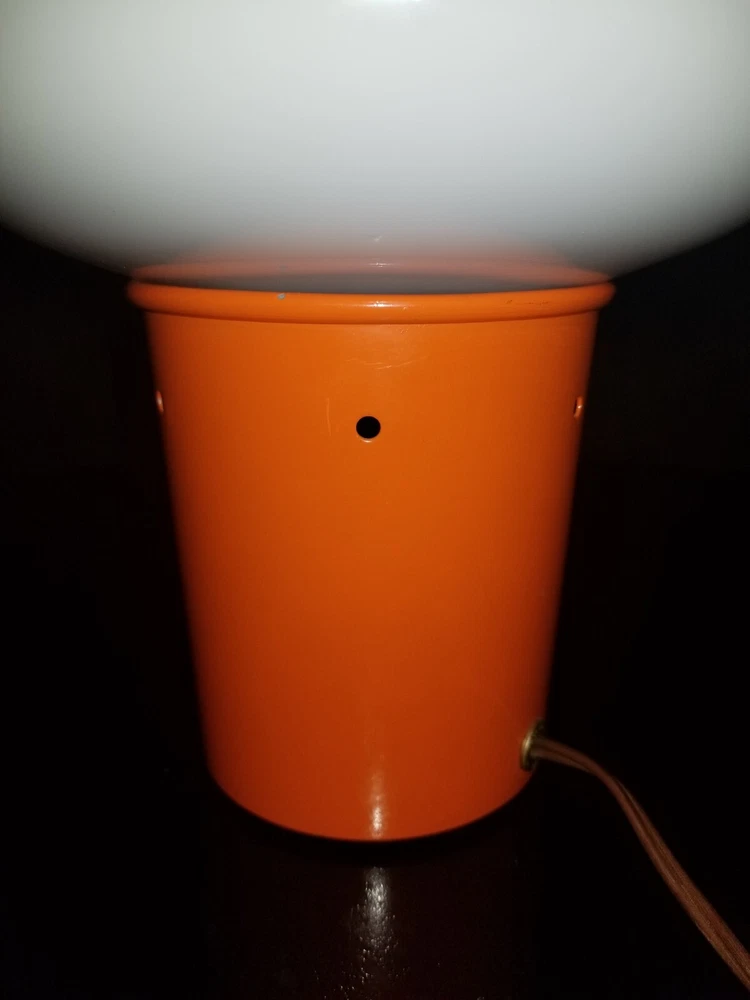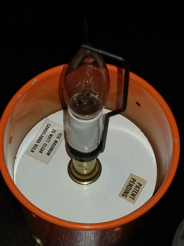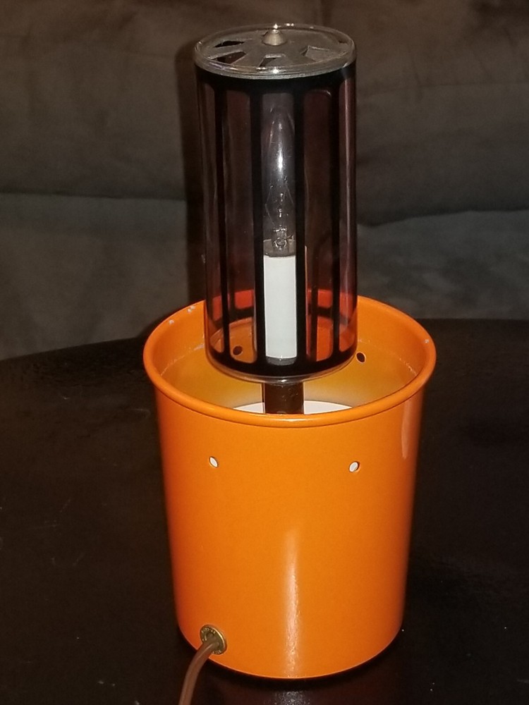 I tried to add a video if you want to see the lamp with rhe color wheel moving ask and i will send you the video.. This retro lamp, with its unique mushroom-shaped design, is a rare find from the 1970s. The lamp is made of orange-colored metal and glass, and is powered by a corded electric source. Measuring 11 inches in height and 8 inches in diameter, this lamp features a spinning color wheel that creates a mesmerizing kaleidoscope effect. The lamp's vintage design is perfect for collectors and enthusiasts of retro decor. Its metallic finish and brown cord add to its charm. Whether you're looking to add a unique touch to your living space or simply adding to your vintage collection, this mid-century motion lamp is a must-have. Natural air movement causes the wheel to spin it's not mechanical reall cool i don't see a maker just Pat. Pending reall cool vintage mid century retro lamp