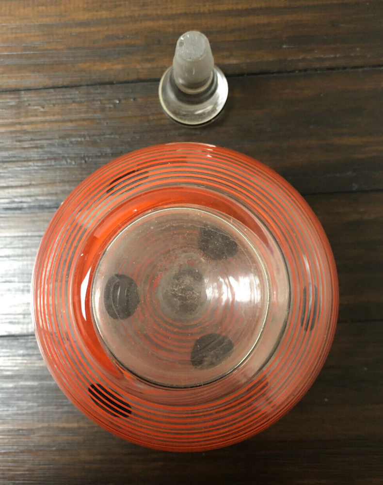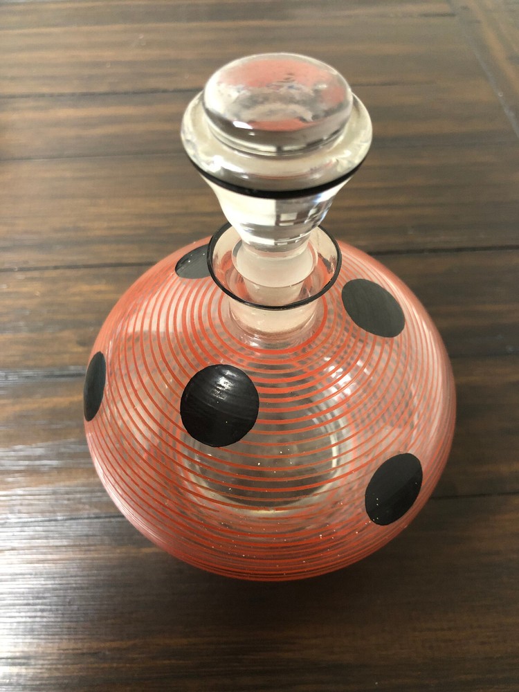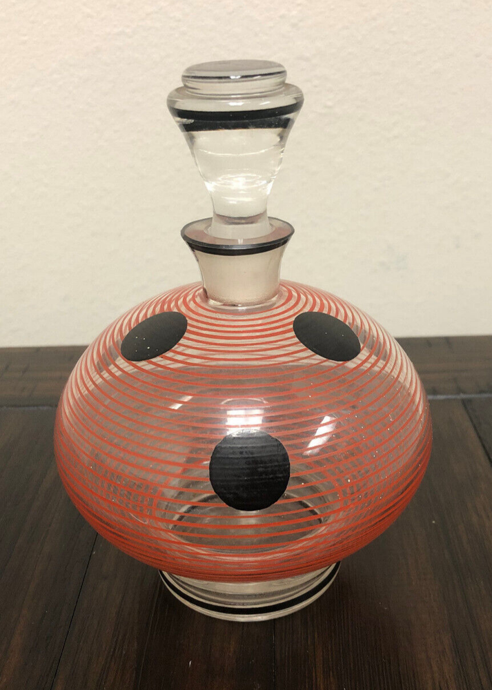 WELCOME! Please Read Entire Description You are bidding on a vintage retro style glass decanter with stopper. The pattern is larger black polka dot with thin orange pinstripes around and a thinner glass. This is a very rare and hard to find piece to add to a collection. If you are looking for something unique there are not many of these around. Measures approx. 6 1/2" tall with stopper X 4 1/2" tall without stopper X 1 1/4" across top X 2 1/2" diameter base X 4" bulge. The stopper is approx. 2 1/2" long. No chips or cracks. Needs a good cleaning. Sold as is. Insurance is included in shipping cost. There is no intentional misleading information in my listings, but there may be a mistake or something missed occasionally due to human error. Please feel free to email me with any questions. I will do my best to answer them. SMOKE FREE HO ME! Happy Bidding! Thanks for looking! Please Do Not Purchase if you do not like my Shipping Cost, and then give me a bad evaluation rating. I do the best I can to charge reasonable prices, but some do not realize how much it costs for actual shipping, insurance and materials (packing materials, labels, ink, etc). If for some reason I charge way too much shipping, I have been known to refund the few dollars back to you. I do not try to make profit on shipping cost, but in return I am not going to hurt myself by not charging enough. Thank you! My packages are insured so if there is any damage during shipping it will need to be submitted for an insurance claim to receive your refund. If there are any problems or issues please contact me so we can try to make things right for both parties ( you and I). As in any business, sometimes it is difficult to please everyone, and things do come up that need to be attended to. I will do my BEST! Thanks again! I only ship within United States ( Alaska and Hawaii will cost more shipping than listed due to location ). Please ask before bidding if you are in one of those two states. The only international shipping I do is through the Global Shipping Program on Ebay. I do combine shipping . I do not try to make money on shipping and insurance. Purchases need to be paid within 7 days of closing or I will relist item unless purchaser contacts me to make other arrangements. I insure my packages. No matter how well something is packed, there is always the chance that it could be lost or damaged in shipping. I am not responsible for sny damage incurred during shipping. We take pride in our packing, and we do not ship out broken items unless stated in the listing. If anything is damaged during shipping please take pictures of the outer box, packing, and broken item. Contact me for an email address to send the pictures to so that I will submit a claim through ShipSaver to get your money refunded through the insurance claim as soon as possible. As in all insurance there is a small wait of approx. 2 weeks after claim is submitted before you may receive you refund. Returns are accepted due to mistakes in the written discription of item. Items must be returned in the same condition as they were shipped out to receive your refund. No refunds on lost packages or item damage during shipping. The Postal Service has a refund policy for items insured.