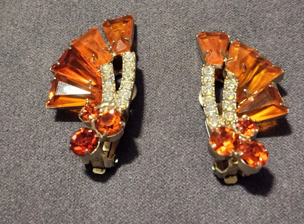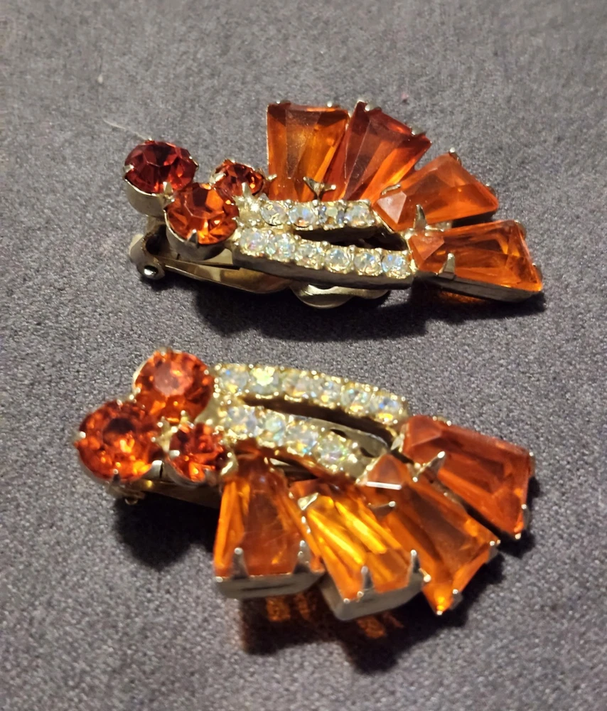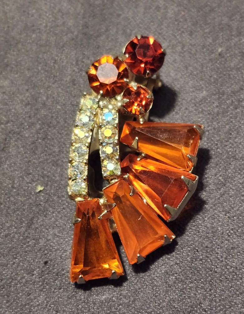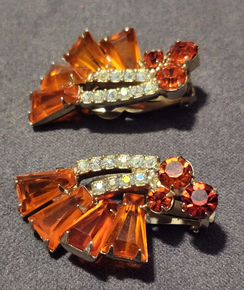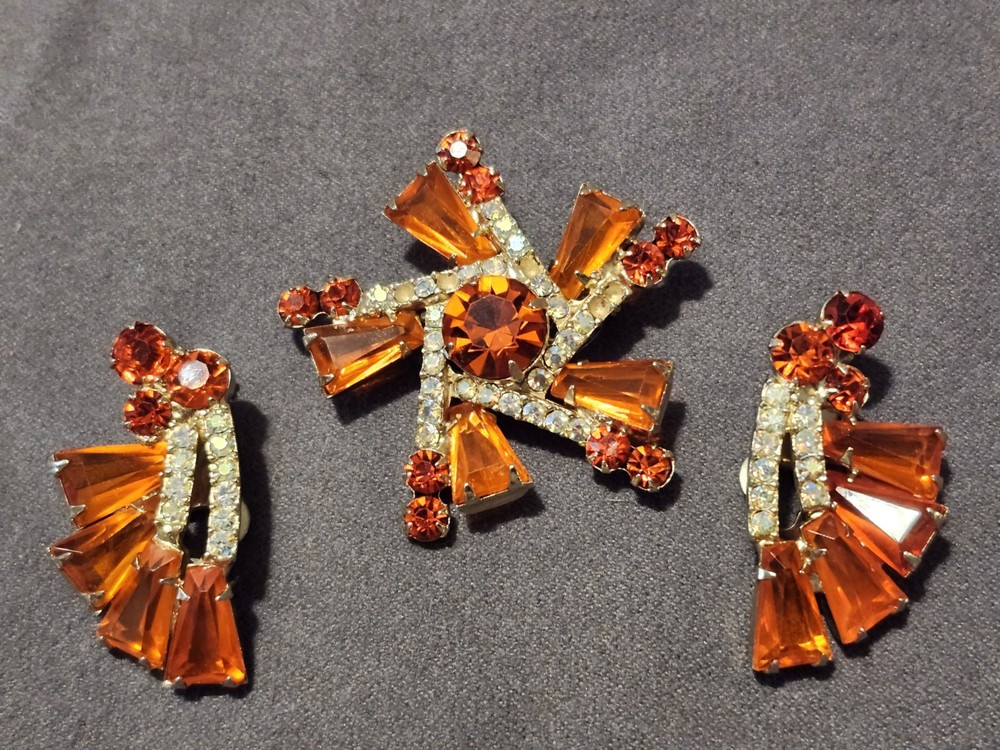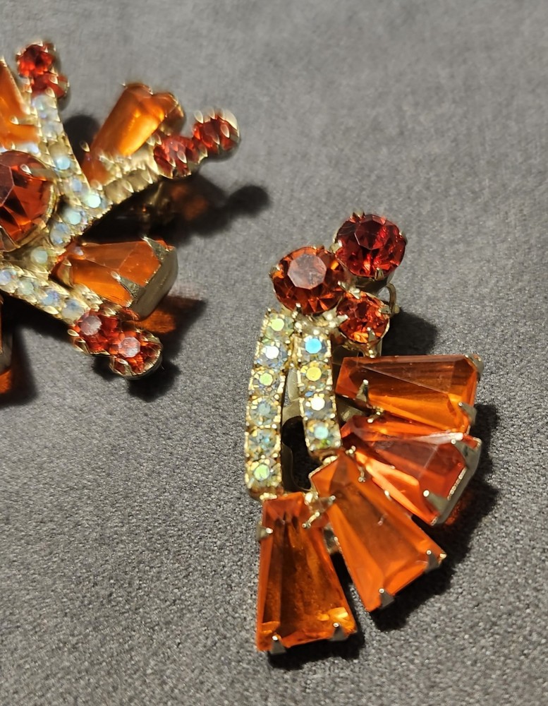 This is a stunning, vintage Juliana demi parure. This rare brooch and matching climber earrings are the hard to find orange. Both the brooch and earrings are featured in the JULIANA JEWELRY REFERENCE IDENTIFICATION & VALUE GUIDE by ANN PITMAN. The orange brooch is item # 4235 and the earrings, which are pictured on page 149, are in red. The earrings I am selling are the rare orange color. Simply beautiful! According to the book, the brooch and earrings in red and ruby are both accented with clear chatons. Only the orange pieces were accented using aurora borealis chatons. Both the brooch and the earrings have shiny goldtone settings. The brooch is a pinwheel of open backed, orange keystones which are accented by deep orange chatons, and aurora borealis crystal chatons. The matching climbers are open backed, orange keystones, also accented with aurora borealis chatons. See pictures for measurements. Please note that there are 5 small AB stones missing from the brooch, (but only noticeable if looking for it.) There are no stones missing from the earrings. Check out my other listings for more jewelry, vintage and antique treasures!