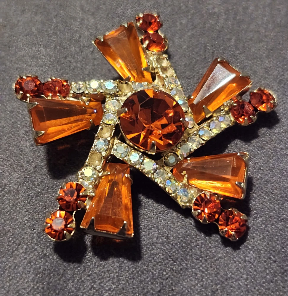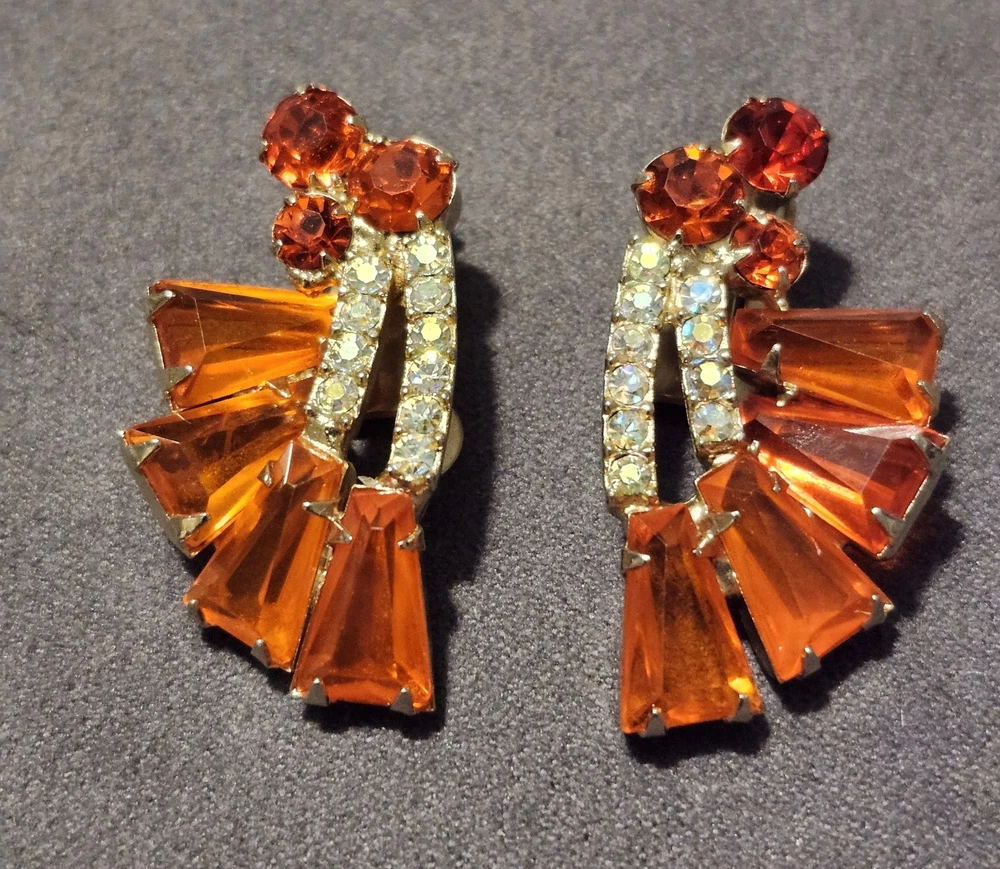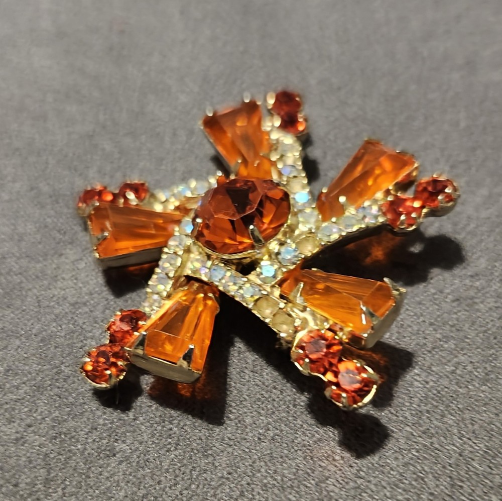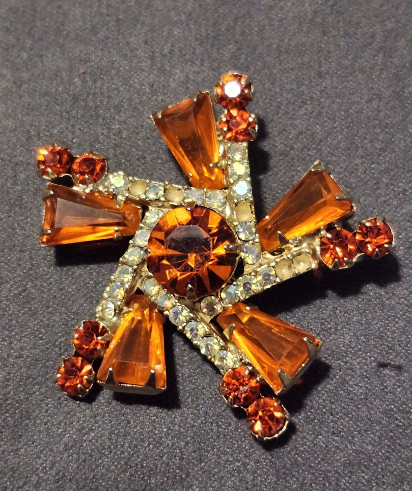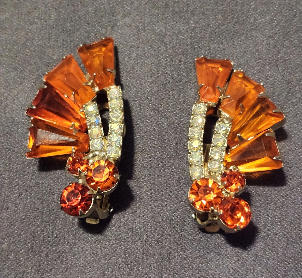 This is a stunning, vintage Juliana demi parure. This rare brooch and matching climber earrings are the hard to find orange. Both the brooch and earrings are featured in the JULIANA JEWELRY REFERENCE IDENTIFICATION & VALUE GUIDE by ANN PITMAN. The orange brooch is item # 4235 and the earrings, which are pictured on page 149, are in red. The earrings I am selling are the rare orange color. Simply beautiful! According to the book, the brooch and earrings in red and ruby are both accented with clear chatons. Only the orange pieces were accented using aurora borealis chatons. Both the brooch and the earrings have shiny goldtone settings. The brooch is a pinwheel of open backed, orange keystones which are accented by deep orange chatons, and aurora borealis crystal chatons. The matching climbers are open backed, orange keystones, also accented with aurora borealis chatons. See pictures for measurements. Please note that there are 5 small AB stones missing from the brooch, (but only noticeable if looking for it.) There are no stones missing from the earrings. Check out my other listings for more jewelry, vintage and antique treasures!