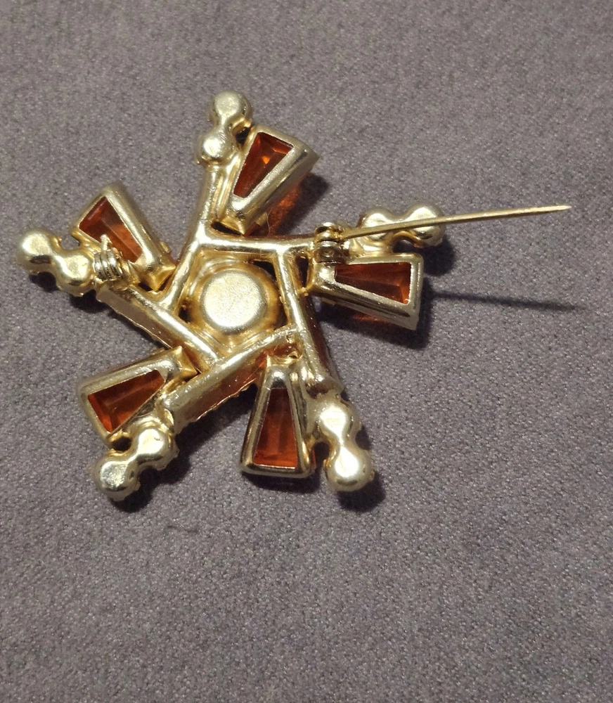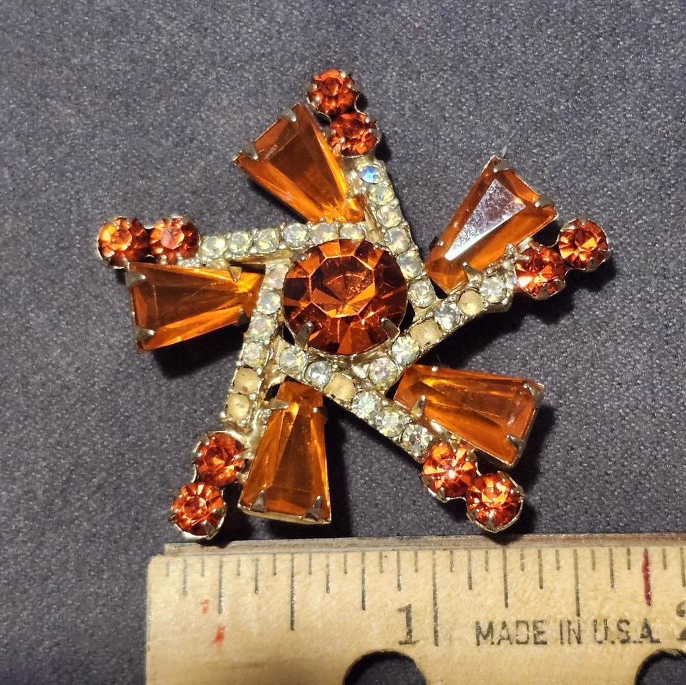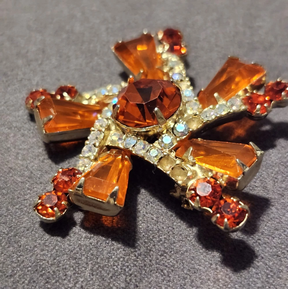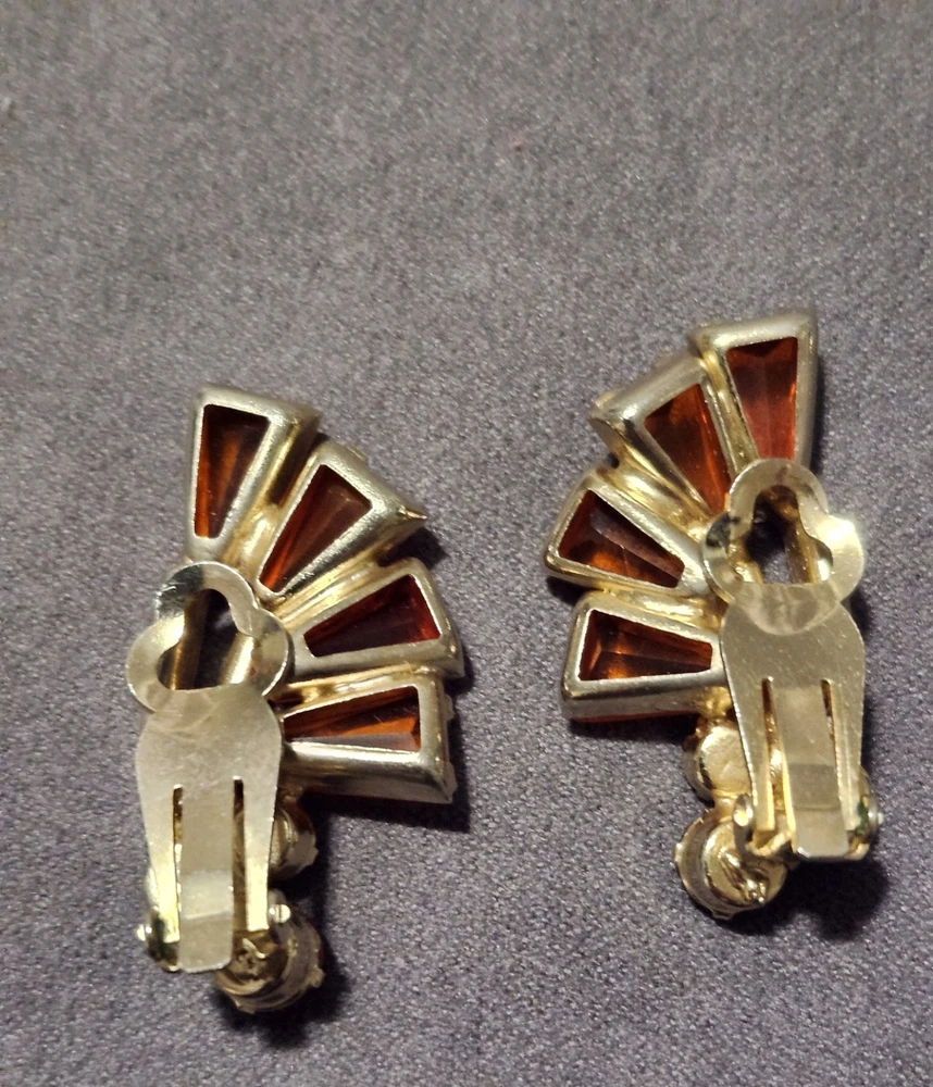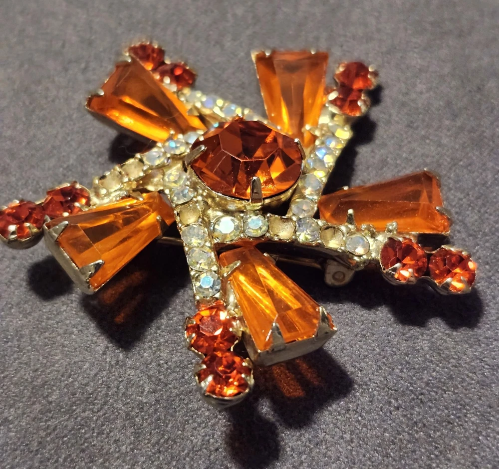 This is a stunning, vintage Juliana demi parure. This rare brooch and matching climber earrings are the hard to find orange. Both the brooch and earrings are featured in the JULIANA JEWELRY REFERENCE IDENTIFICATION & VALUE GUIDE by ANN PITMAN. The orange brooch is item # 4235 and the earrings, which are pictured on page 149, are in red. The earrings I am selling are the rare orange color. Simply beautiful! According to the book, the brooch and earrings in red and ruby are both accented with clear chatons. Only the orange pieces were accented using aurora borealis chatons. Both the brooch and the earrings have shiny goldtone settings. The brooch is a pinwheel of open backed, orange keystones which are accented by deep orange chatons, and aurora borealis crystal chatons. The matching climbers are open backed, orange keystones, also accented with aurora borealis chatons. See pictures for measurements. Please note that there are 5 small AB stones missing from the brooch, (but only noticeable if looking for it.) There are no stones missing from the earrings. Check out my other listings for more jewelry, vintage and antique treasures!
