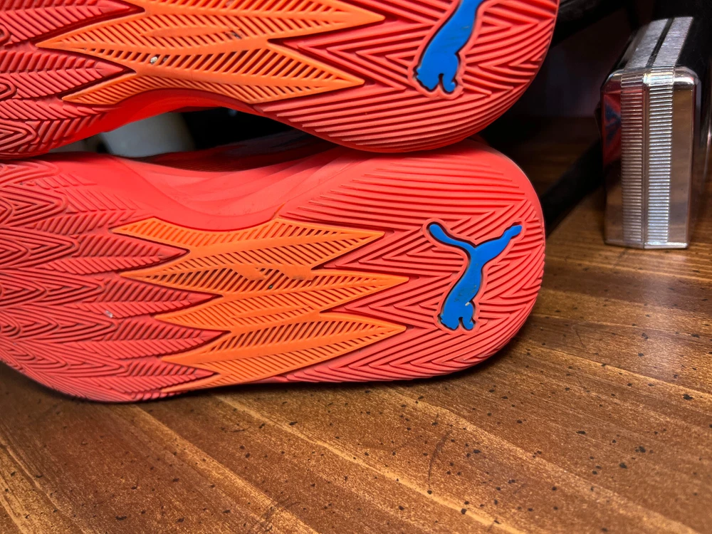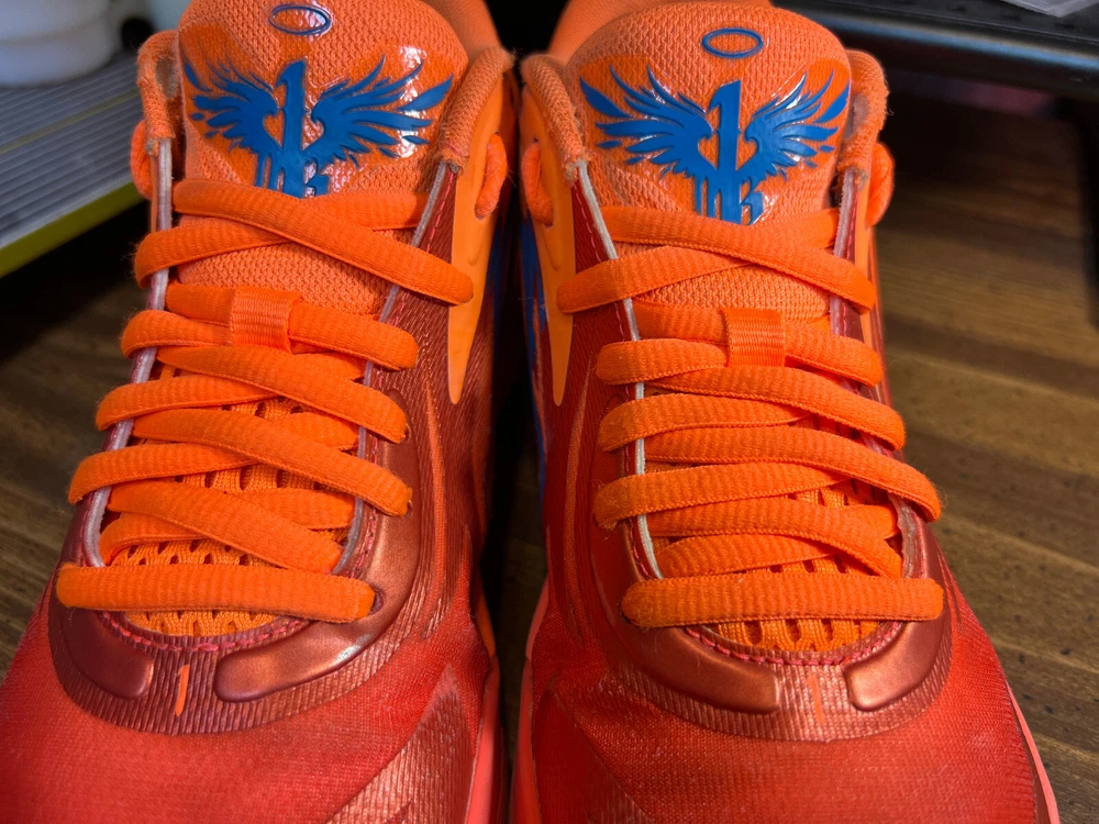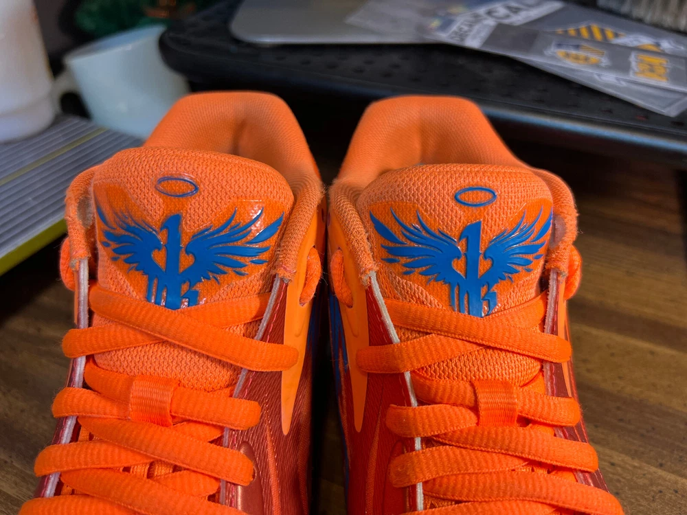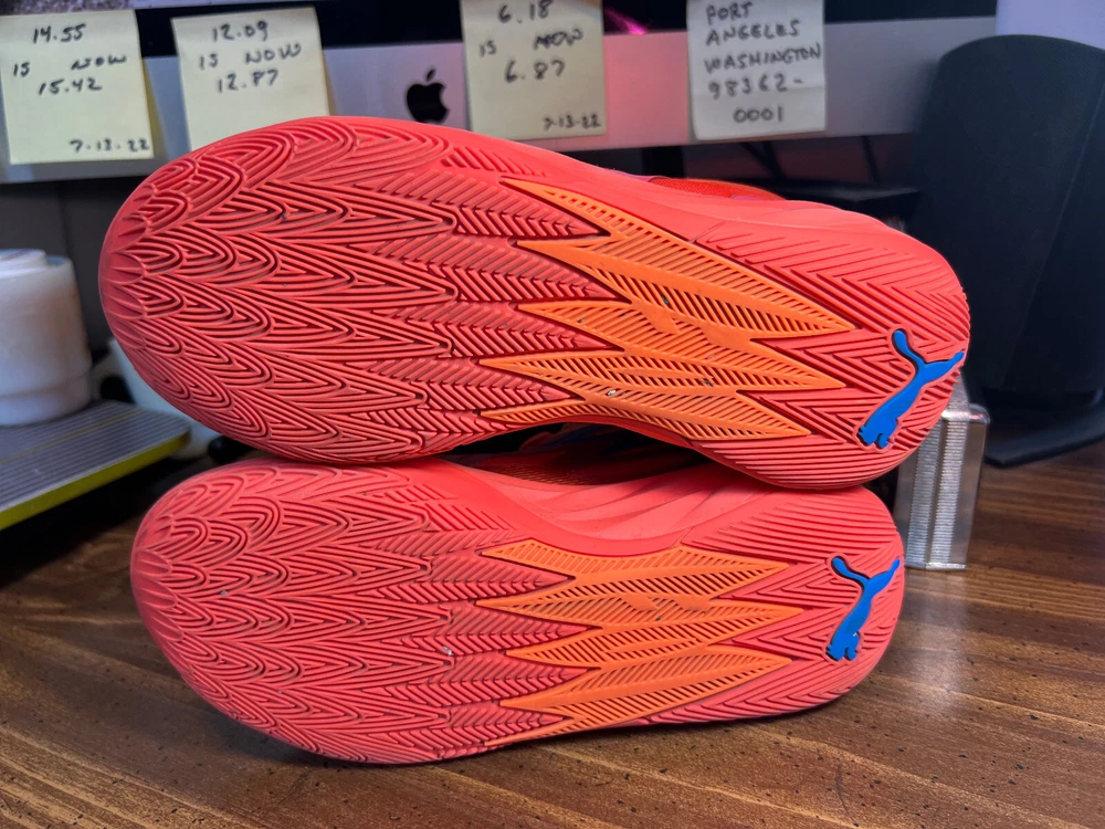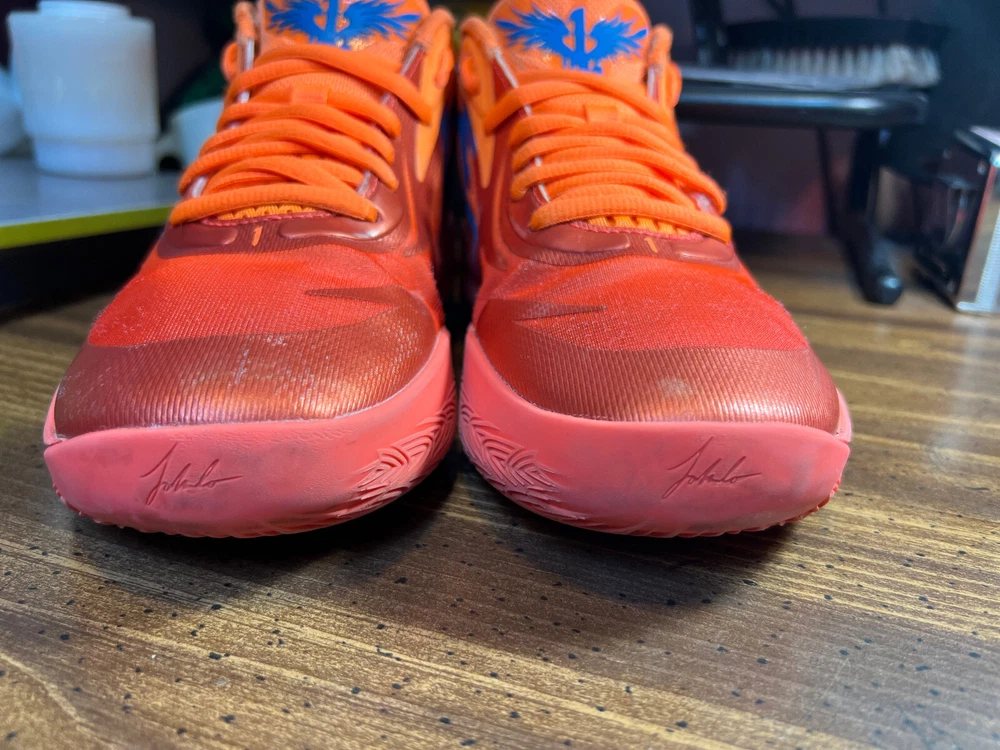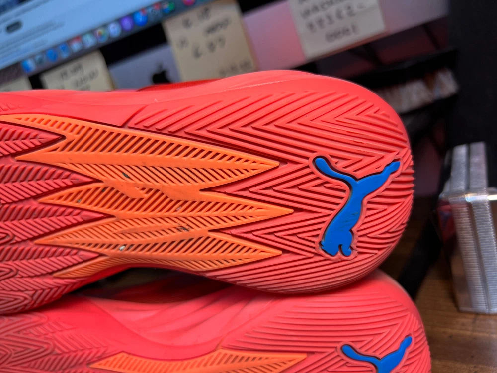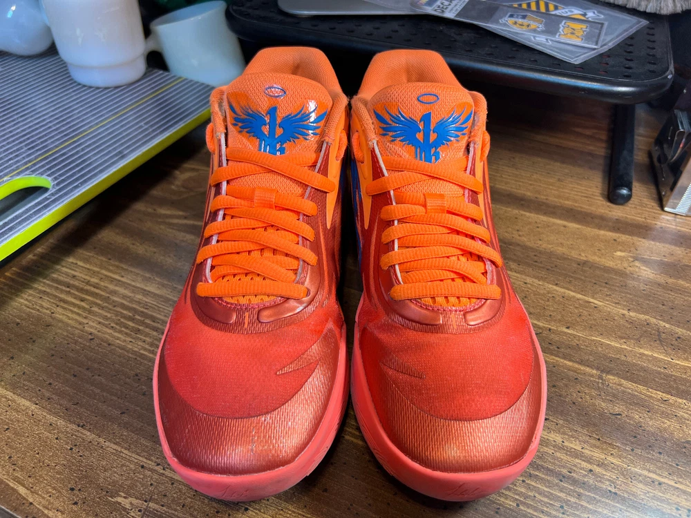Hidden when worn, are two small wear spots on the inside of the collar of each shoe ~ See the last 5 pictures RARE Puma MELO MB.02 Supernova Fiery Coal/Orange Basketball 377403-01 Men sz 6.5