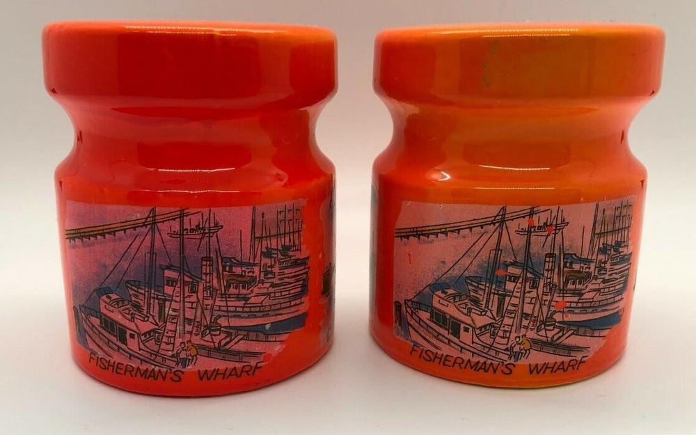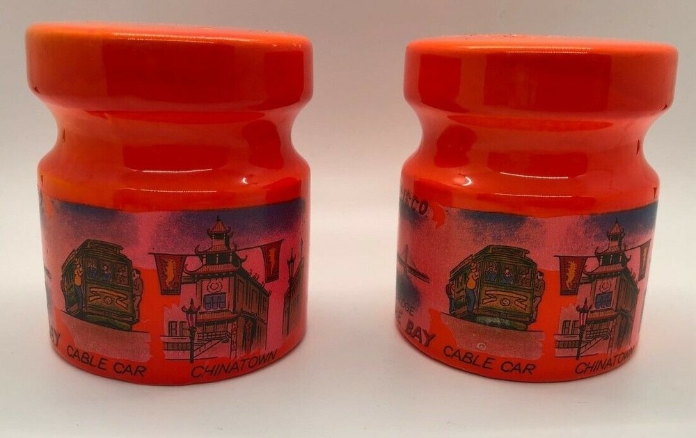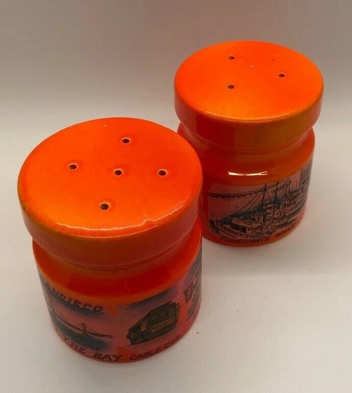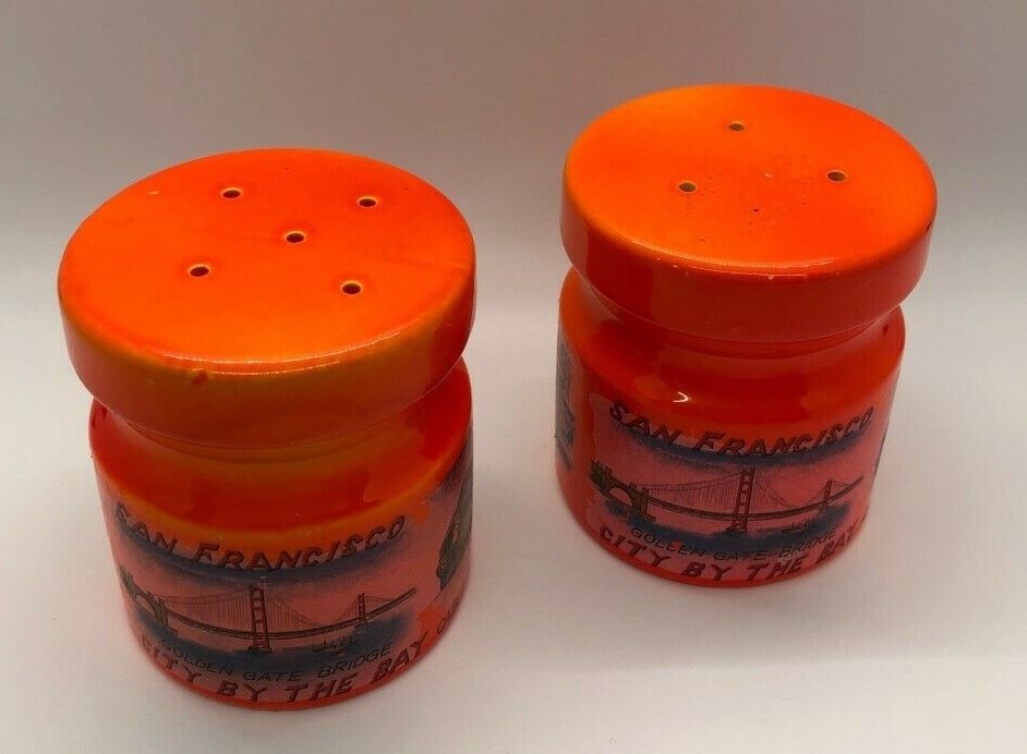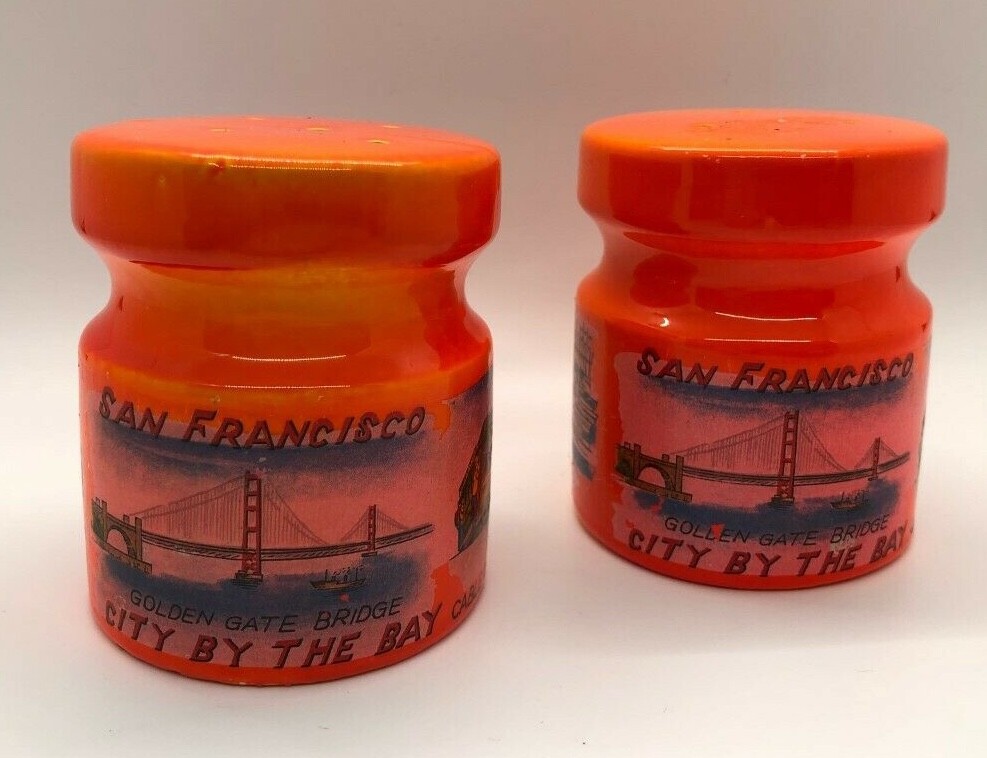 RARE Vintage San Francisco Salt & Pepper Shakers Orange Peel Mid Century Modern Very Rare Salt & Pepper No Chips or Cracks They measure 3" Tall by 2 1/2" Diameter Historical Sites Amazing Set