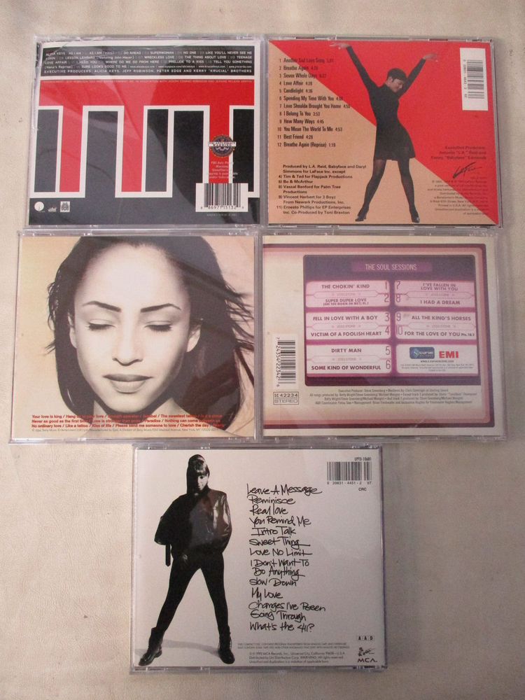 R&B/SOUL FEMALE ARTIST MUSIC CDS (SET OF 5) BLIGE JOSS STONE SADE BRAXTON KEYS SKU: 9098690 Condition: Used I am selling a set of (5) R&B/ Soul female artist music CDs. Most of these items are used in good condition. The Alicia Keys CD is used with blemishing. This set includes albums: Alicia Keys/ As I Am, Toni Braxton/ Toni Braxton, The Best of Sade, Joss Stone/ The Soul Sessions, Mary J Blige/ Whats the 411? For more information regarding this item contact a dealer in your area. (LC/ UPH/ 9098690) Shipping cost is for the continental United States (lower 48 states) only. For shipping outside of the continental United States please inquire about shipping cost before bidding.