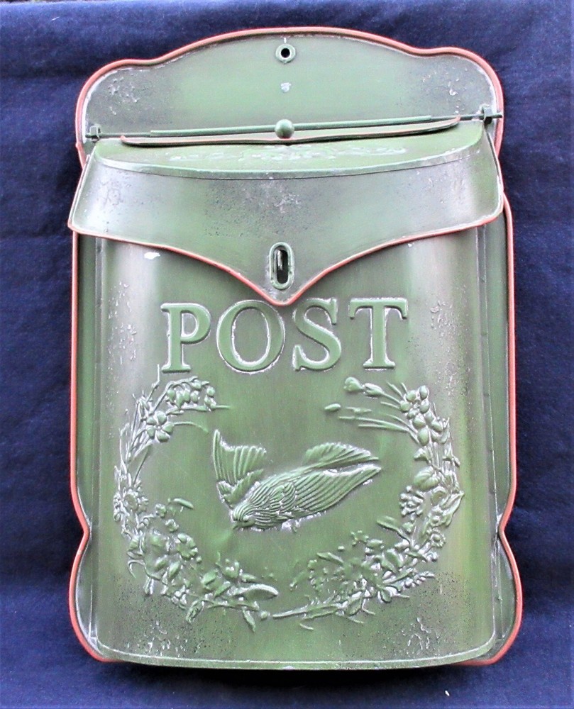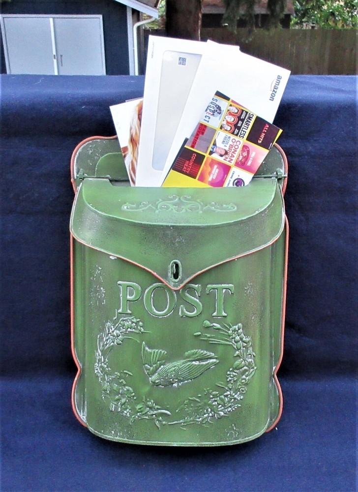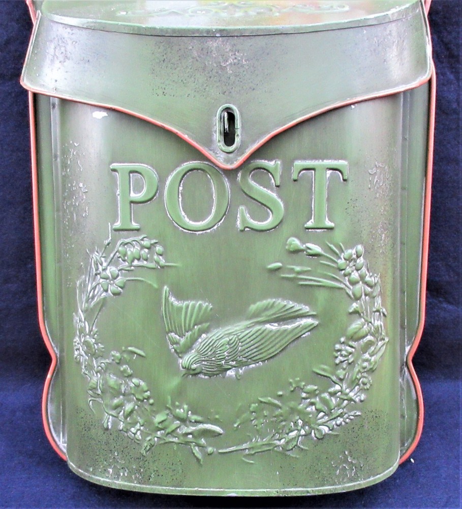 REPRODUCTION TIN EMBOSSED GREEN MAILBOX by CREATIVE CO-OP UNUSED - SEE DESC.. This festive embossed tin mailbox was given to us as a gift a while ago. It is distressed by the manufacturer but has never been used. It doesn't serve our mail needs, but it might serve yours. There is a letter slot on top and the box opens for larger items. It would look great next to your front door year-round, but especially during the holidays. The flip-top has a hasp for a lock to secure your mail and small packages. The mailbox is 15" high, 11" wide, and 3" deep. If you already have a mailbox, this green one would look great inside your house as a part of your holiday decor. Just stuff some letters to Santa in the mail slot and fill the box itself with holiday flowers, real or artificial. How have you lived without this rustic piece of yesteryear? I pack with care and ship promptly; check out my feedback.