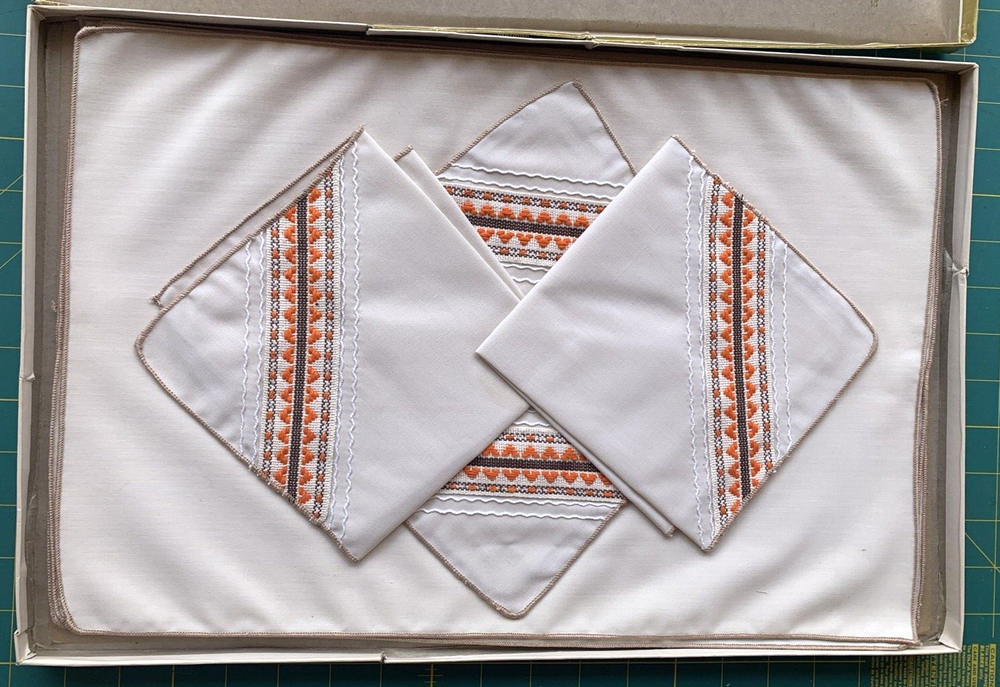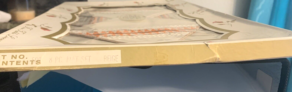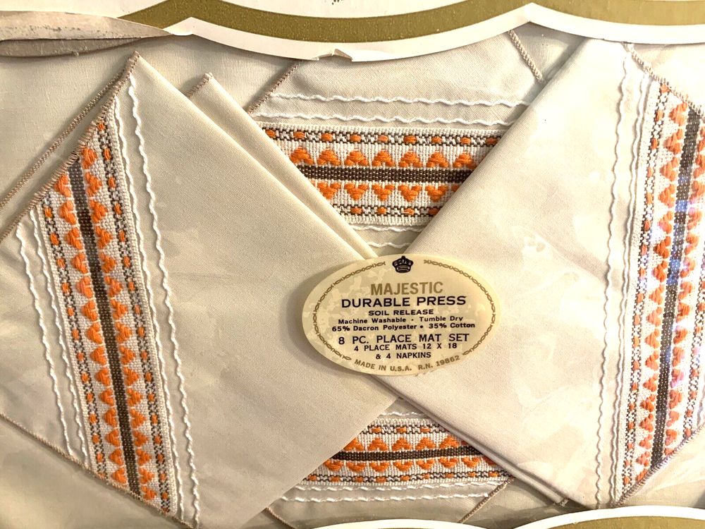 Boxed set with 4 beige placemats and 4 embroidered napkins. Great 1970's colors and design. Definitely a great addition to any 1970's linen collection! Brand: Majestic. Fiber Content: 65% Dacron Polyester; 35% Cotton Vintage: the colors and design are definitely 1970's. Size: According to the box, the placemats are 12 x 18," but they are slightly smaller, about 11.5 x 17." Napkins are approximately 12 x 12." Condition: Napkins and placemats are in new, unused condition, still attached to the original packaging. The box is not in great shape. It has bending, ripping, and tearing. It has been taped shut with that industrial clear tape. (Which is good. It kept the items inside safe!) Thanks for stopping by today. I am offering a discount for multiple purchases, and shipping will be combined and adjusted. Please check out my store for other interesting collectible items. I'm out and about weekly scouring local estate sales for cool items to list. If you follow me on eBay, newly listed items of interest to you will come up on your newsfeed. You can find and follow me on Facebook as cab4dk/Kissypop Cottage. Have a great day! I am always happy to combine shipping. Please message me for a shipping estimate for combined orders.