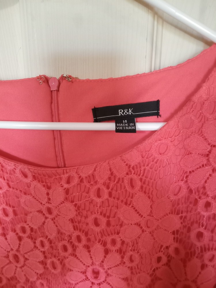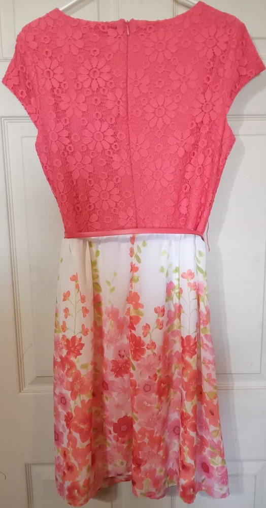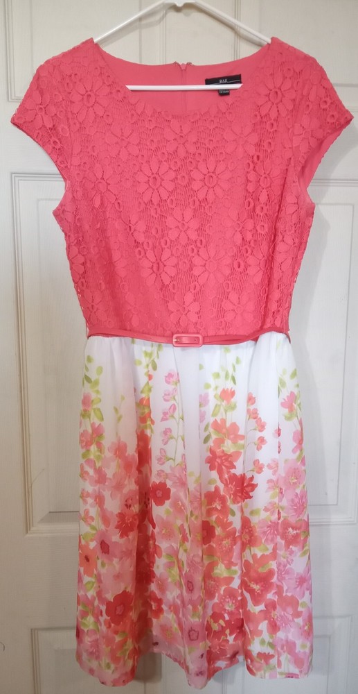 R&K Dress with Lace Salmon color bodice and brightly colored flowy belted skirt. Great for office, church, and special occasions....