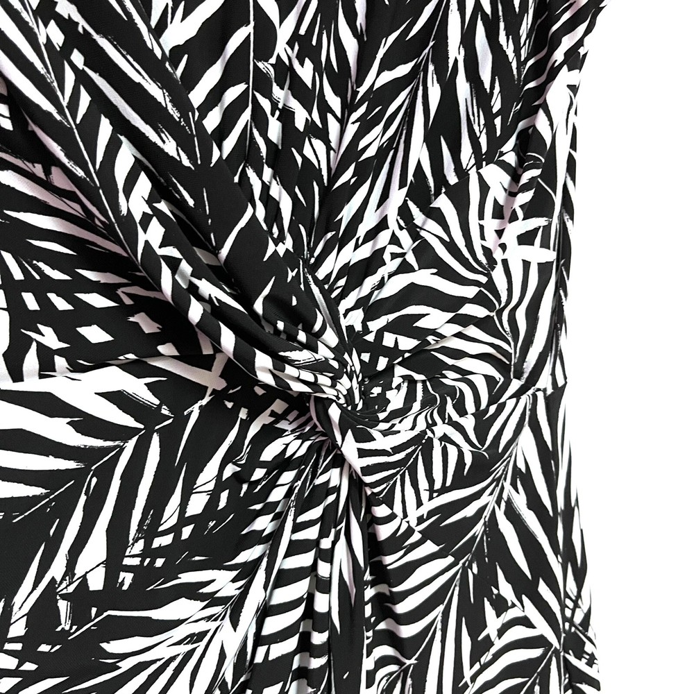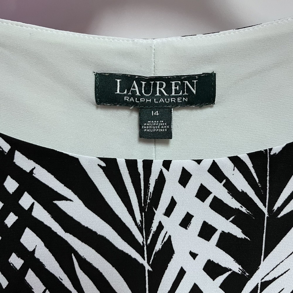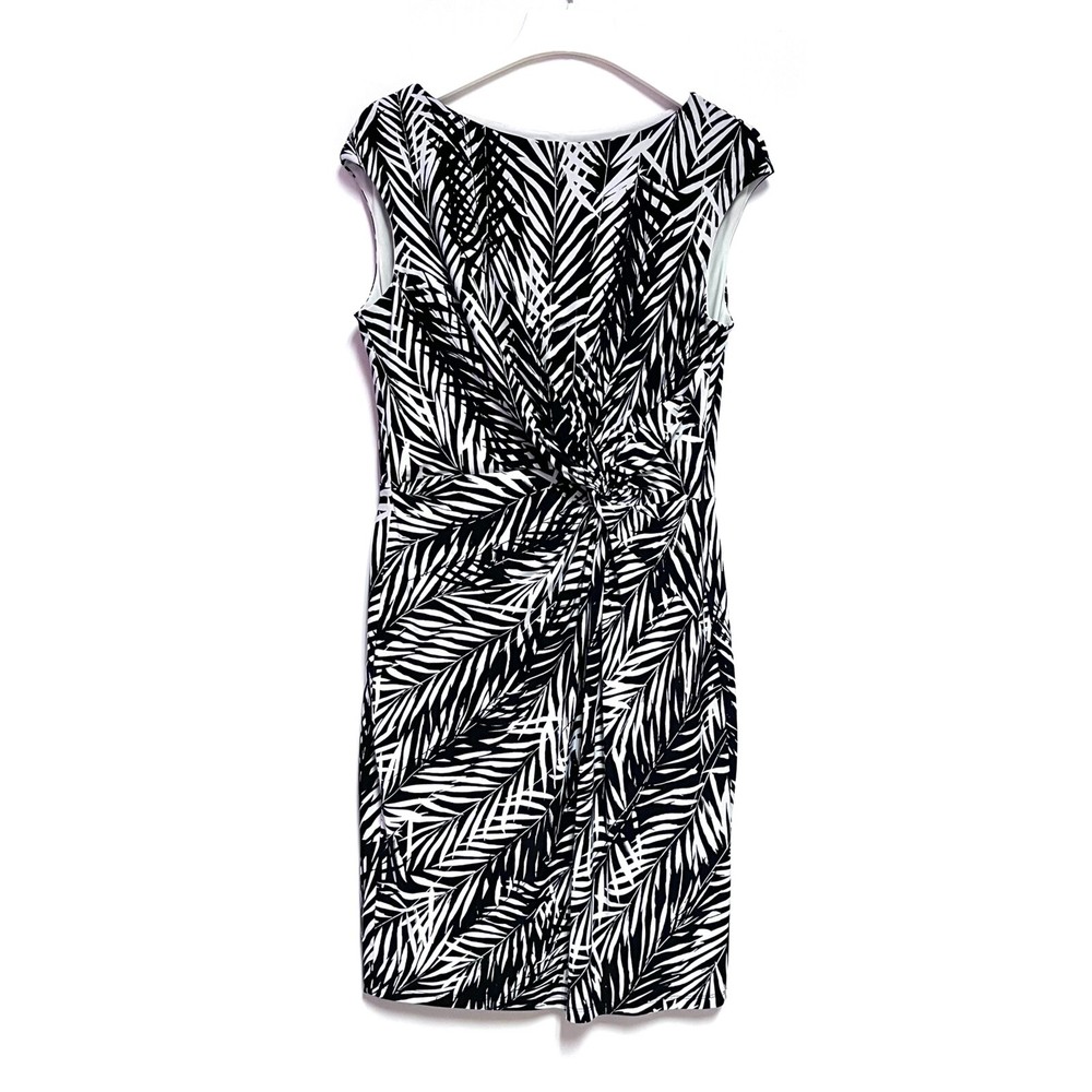 LAUREN Ralph Lauren Size 14 Joss Abstract Leaf Print Black White Midi Sheath Jersey Knit Dress. • Item in great preowned condition • Cap sleeve • Boat neck • Leaf Twig Bold Print • Flattering side ruching/twist detail • Fully lined • 95% polyester 5% Spandex • Flat measurements; 20.5” from armpit to armpit, 15.5” across the waist, 39” length from shoulder to hem • Career, Workwear, Wedding Guest, Contemporary,
