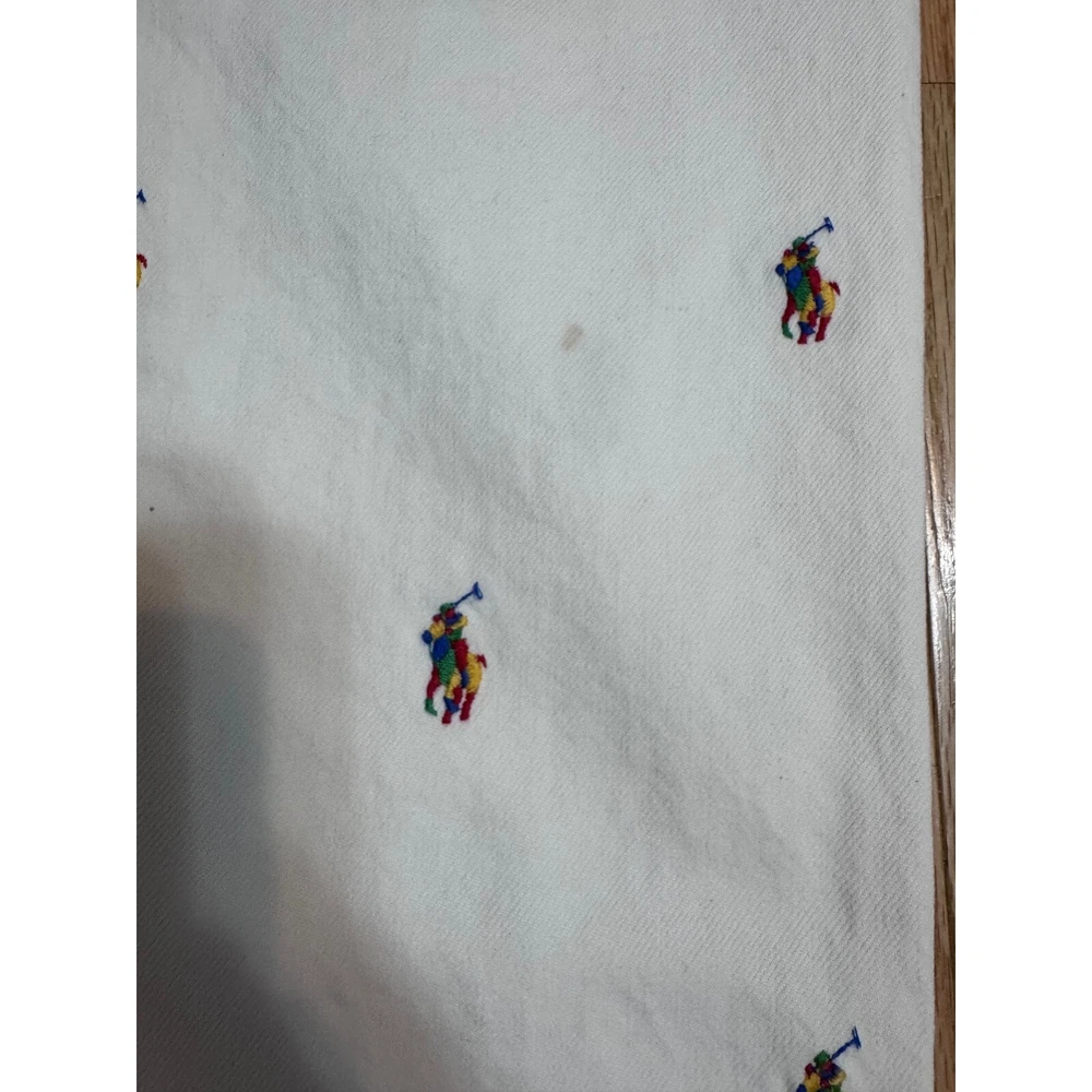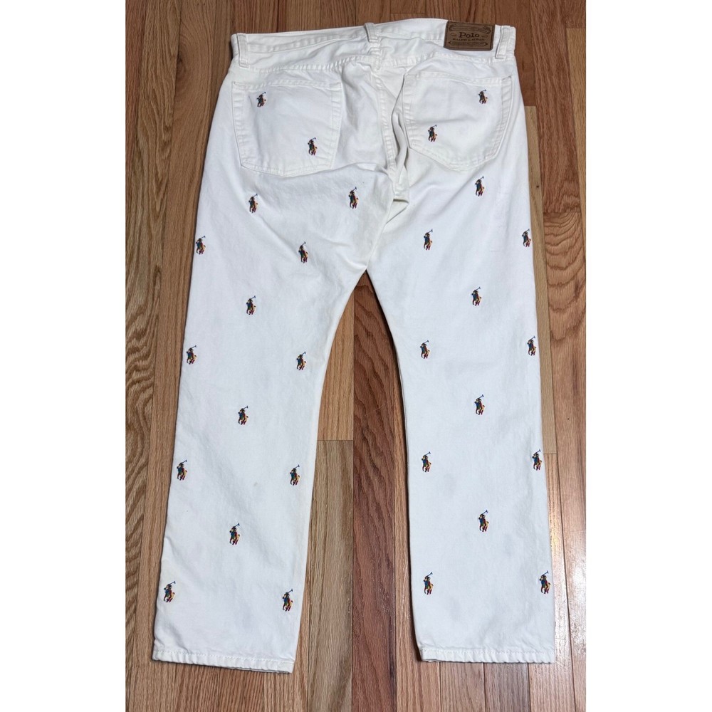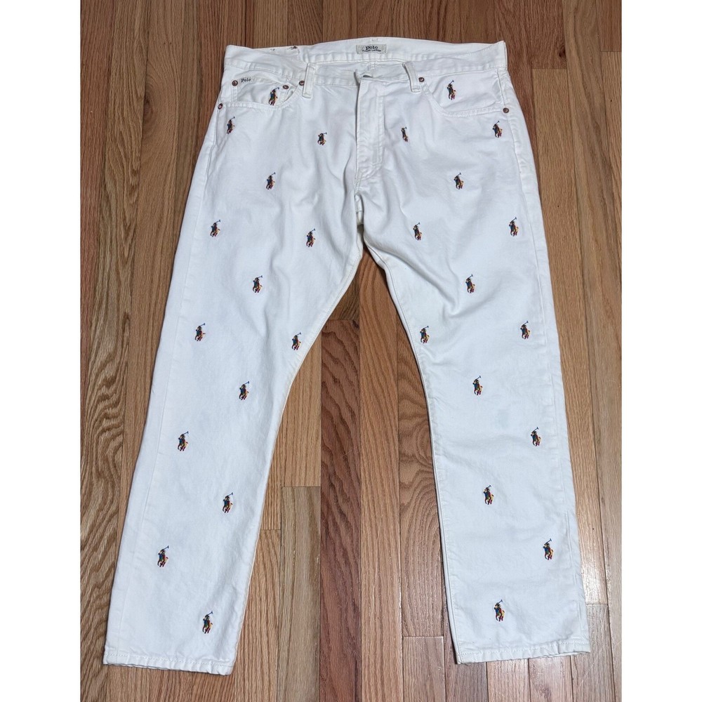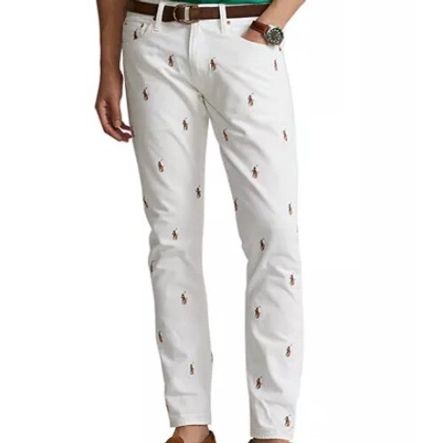 Classic Polo Ralph Lauren Sullivan Slim pants in crisp white with allover embroidered polo player logos! Perfect preppy aesthetic with premium cotton construction and timeless style. Polo Ralph Lauren brand Sullivan Slim fit Size 34/30 100% cotton White with multicolor polo logos Embroidered throughout Five-pocket styling Made in Egypt Classic preppy design Does have small stain on back of leg as shown in last pic Polo Ralph Lauren, Sullivan slim, preppy aesthetic, embroidered logos, white pants, polo player print, classic menswear, luxury cotton, timeless style, heritage brand, country club vibes, ivy league fashion, nautical prep, clean preppy, sophisticated casual, premium quality, designer pants, traditional American, coastal prep, old money aesthetic