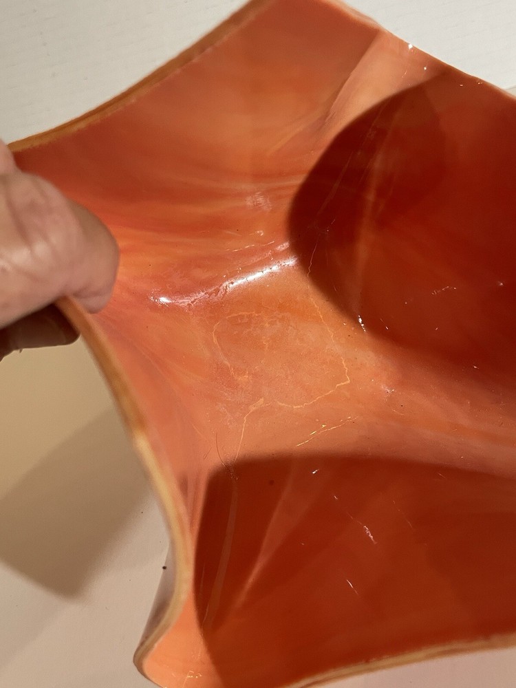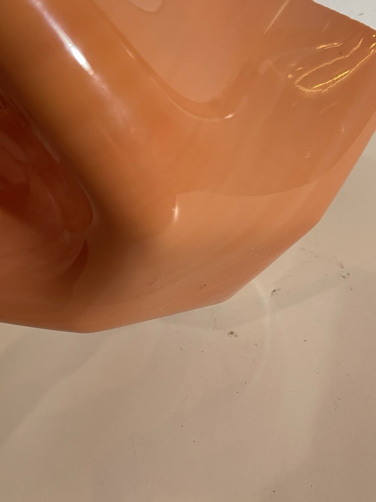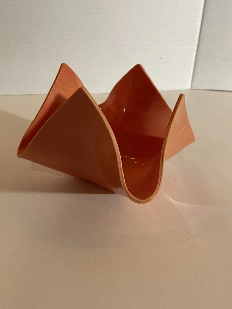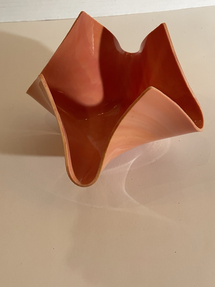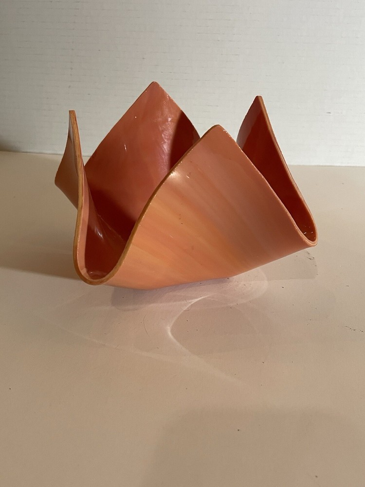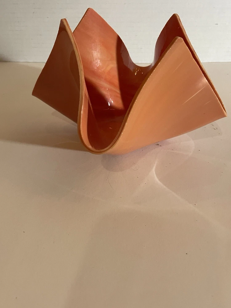 This stunning hand-blown glass art bowl features a unique folded design in a rich coral shade, making it a captivating piece for any decor. With its soft lines and abstract shape, it serves as a perfect centerpiece or decorative accent, ideal for mid-century modern or contemporary settings. This bowl is not only functional but also an exquisite example of glass artistry, embodying both elegance and warmth.