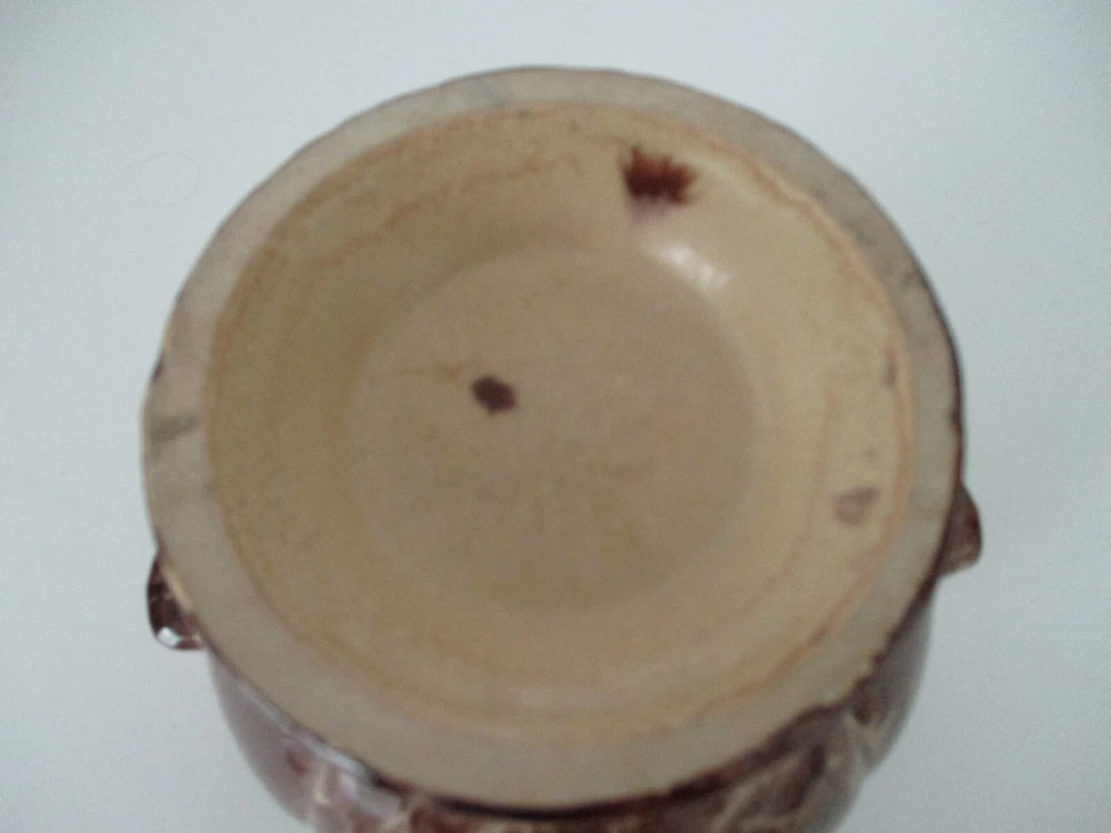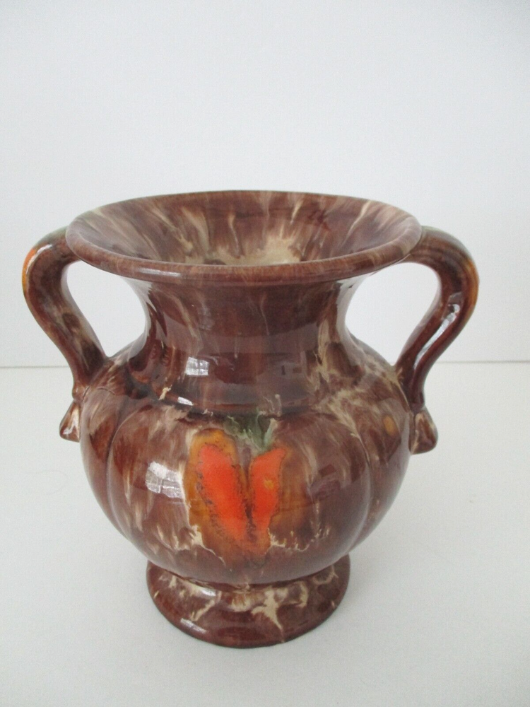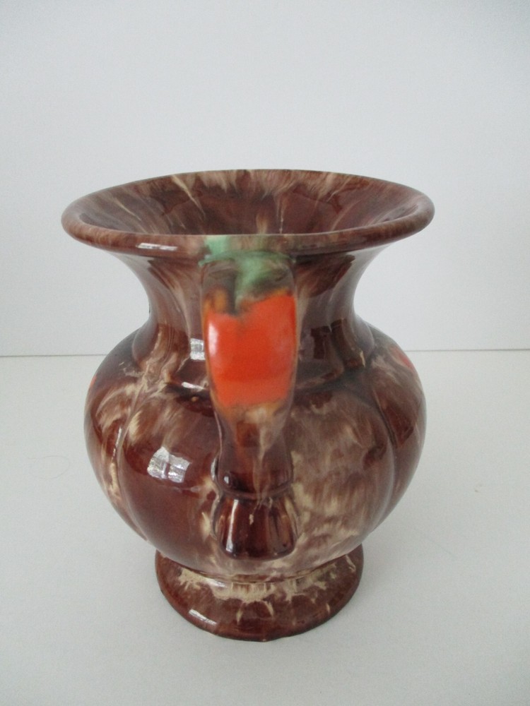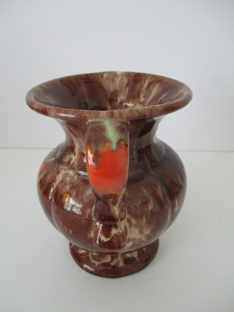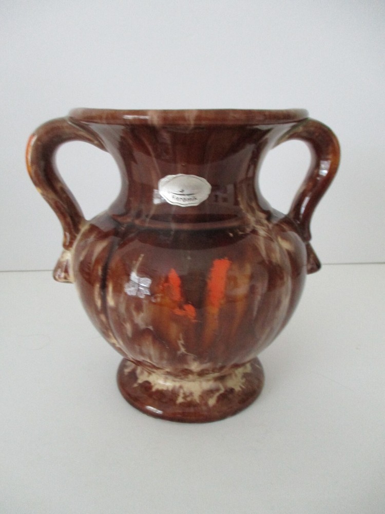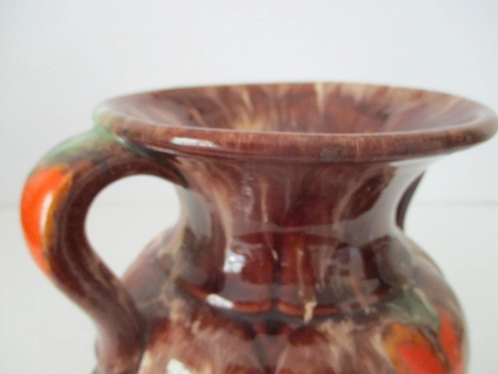 This Double Handle Vase has a classical shape which is finished with a brown, cream, orange and green drip glaze. It retains its original S & G silver metallic paper sticker. S and G is short for Scheurich and Greulich, a company founded in 1928 as a wholesaler of glass, porcelain and ceramics. Approximately 1950, they began the production of their own ceramics, including vases, and ceased the wholesale operation completely around 1953-54 to concentrate on their own ceramic production. There is a small repair spot on the rim (photo #7) that does not detract from the beauty of this piece. Approximately 6 1/2" Tall X 5" Diameter.