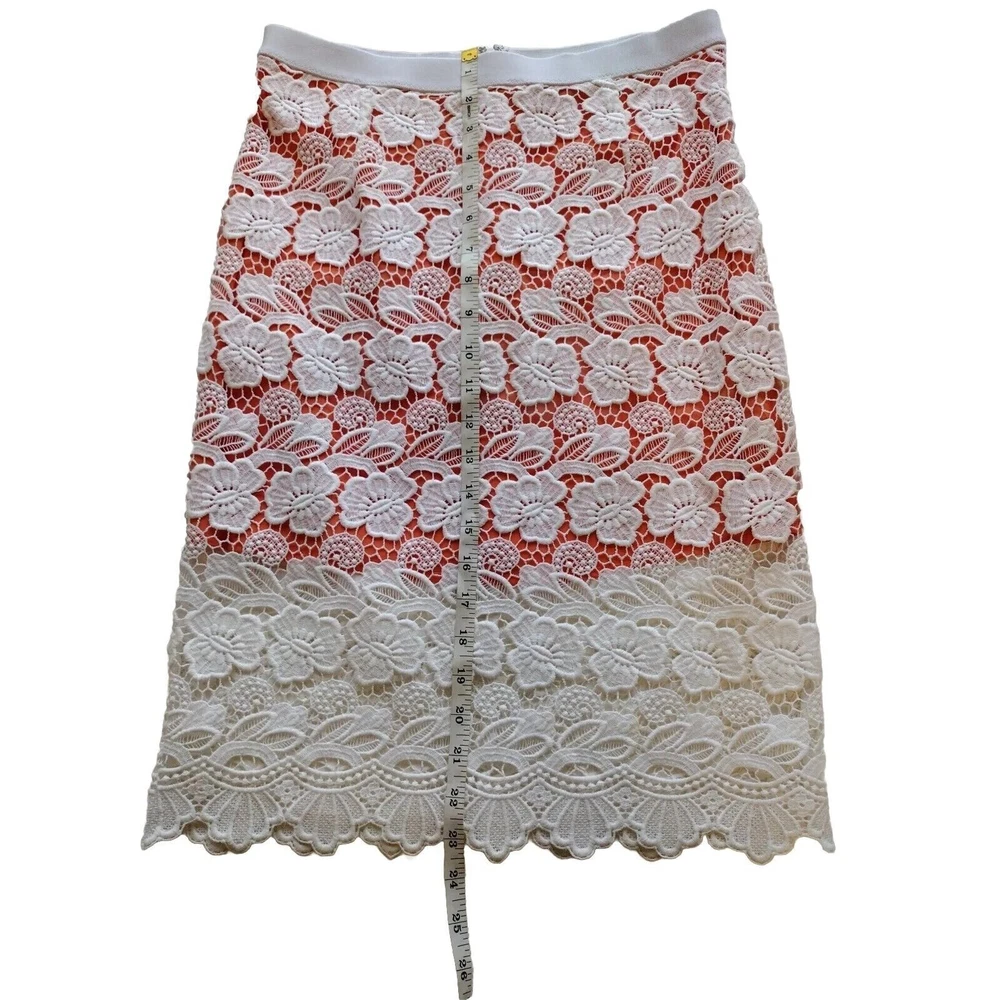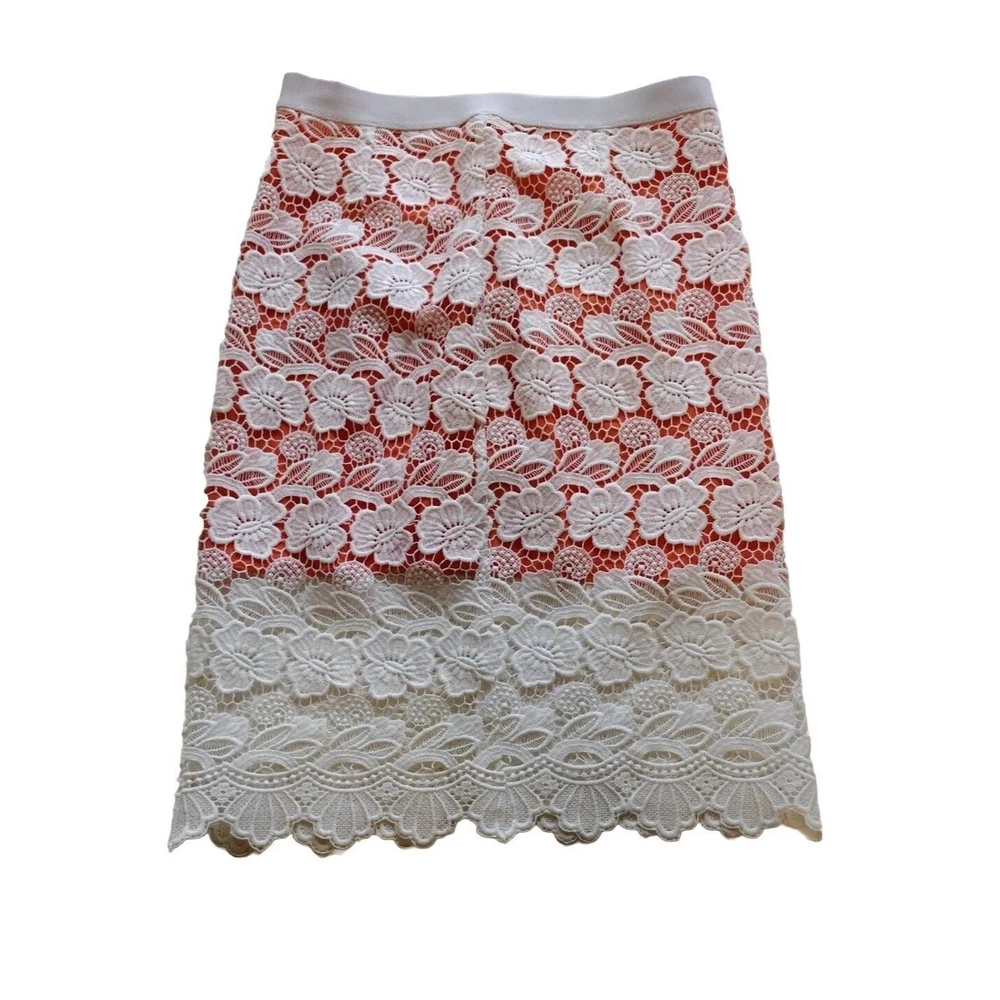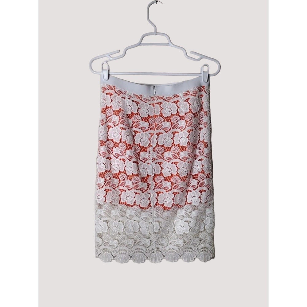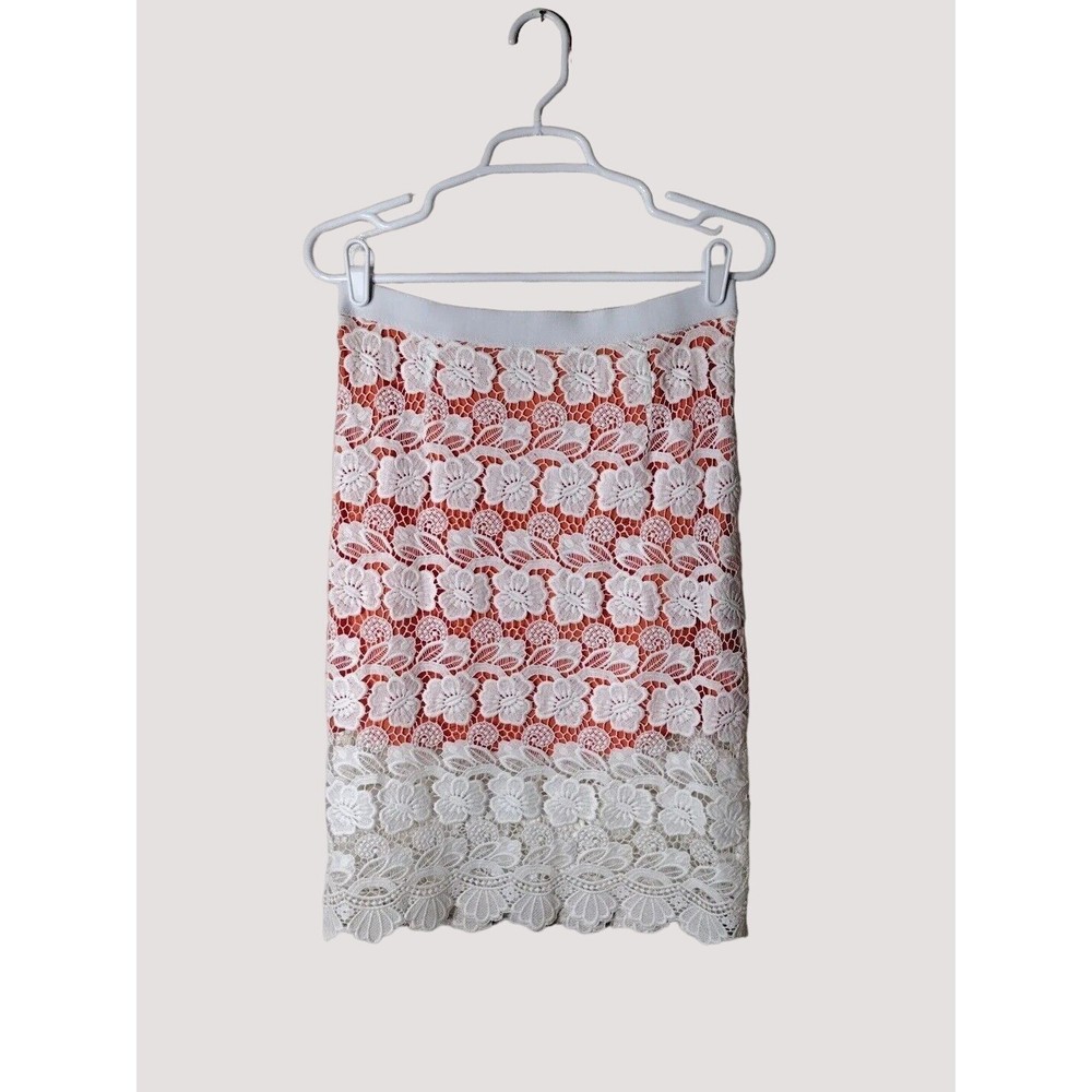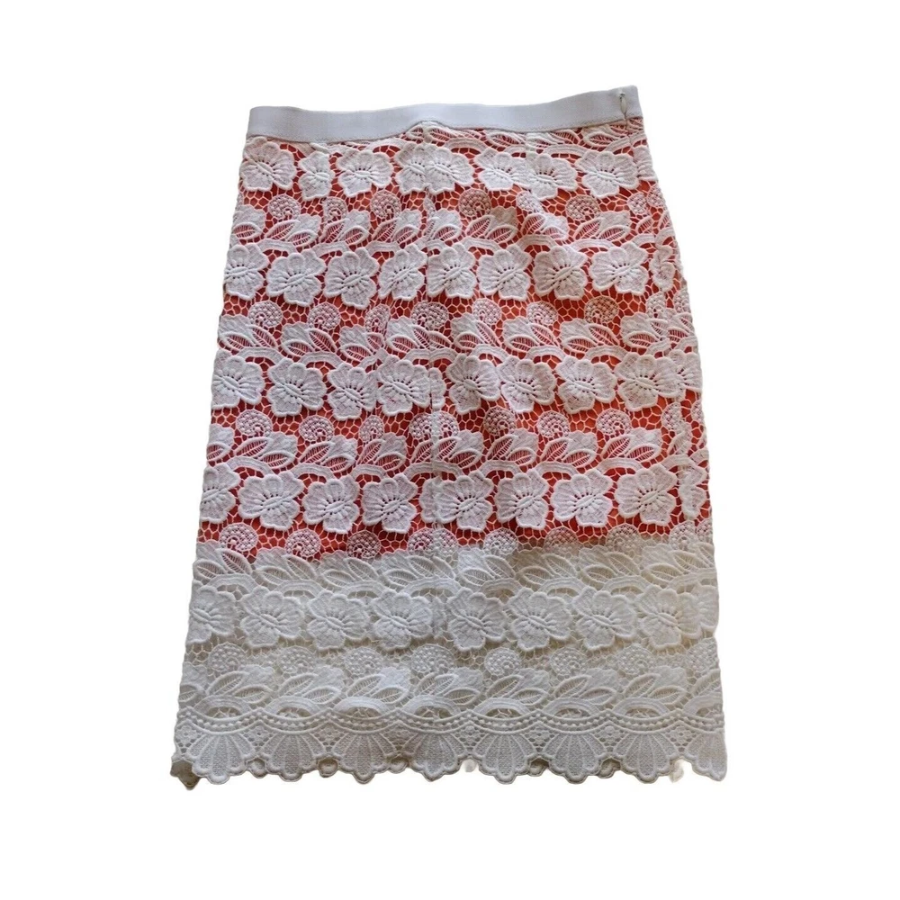 This beautiful Rebecca Minkoff skirt is a stunning addition to your wardrobe. The skirt features a floral pattern with a crochet overlay and an orange lining. It has an elastic waistband and a hook and eye closure. The skirt is knee-length and falls straight with a pencil style. It is made of polyester and cotton with a lace fabric type. The skirt is suitable for travel, parties, and cocktail events. It is available in size 6 and should be dry cleaned only. The skirt comes in multicolor and is perfect for the seasons of summer, fall, and spring. It has accents of crochet and a mid-rise with an elastic waist. This is a pre-owned item and expectation should be for general wash wear. Before shipping, we will clean it and include any tags that come with it. Although we launder all our items, they come from several sources such as estate sales, private individuals, liquidation facilities, and others. They may carry odors that we try to eliminate, but may require additional laundering.