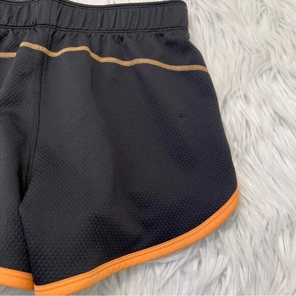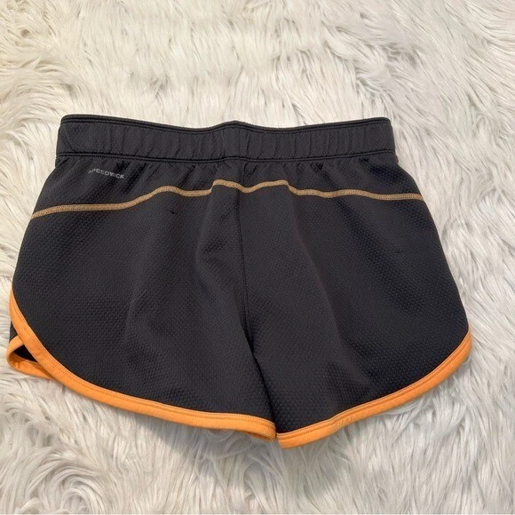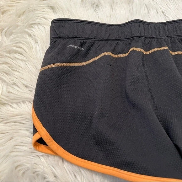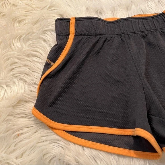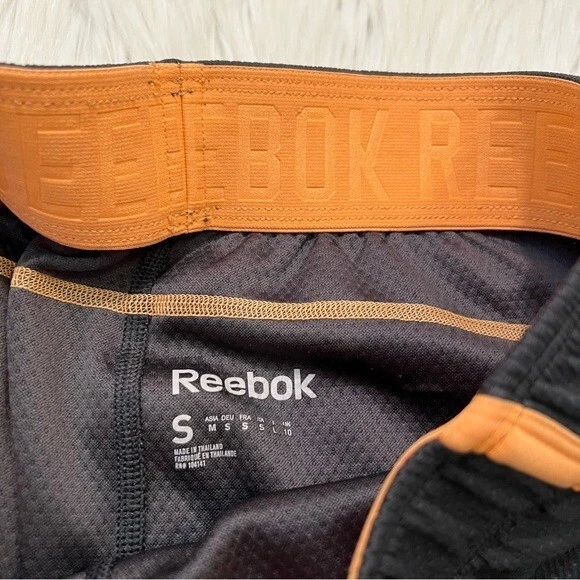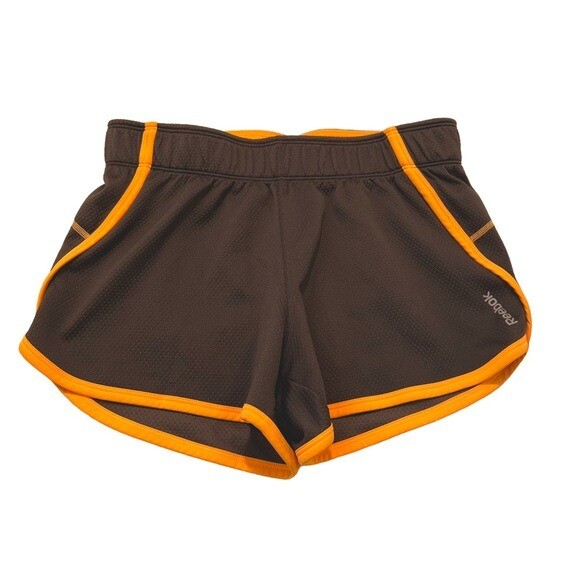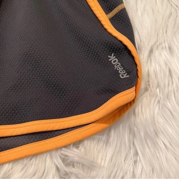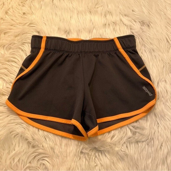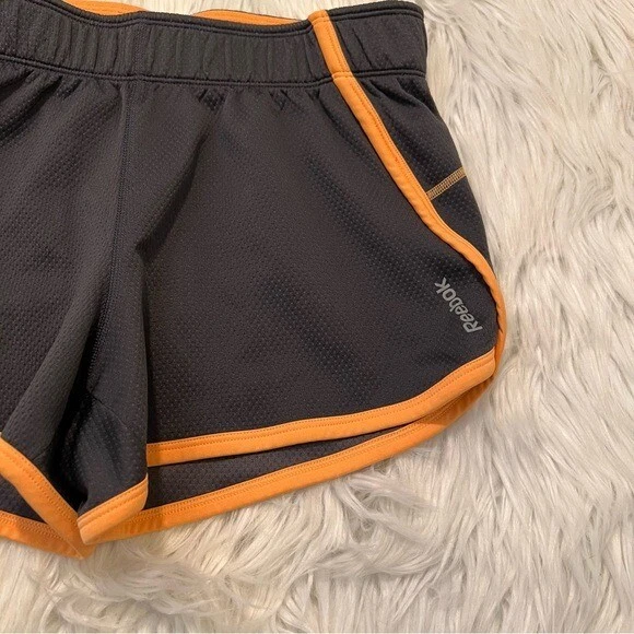 Good condition, has a couple of small snags. Reebok. Athletic shorts. Elastic waist. Dark gray with melon orange details. Size small. 100% polyester. Waist 14” Inseam 3” Front Rise 9.5”. All measurements are approximate and taken lying flat. Smoke free home. No trades, offers welcome.
