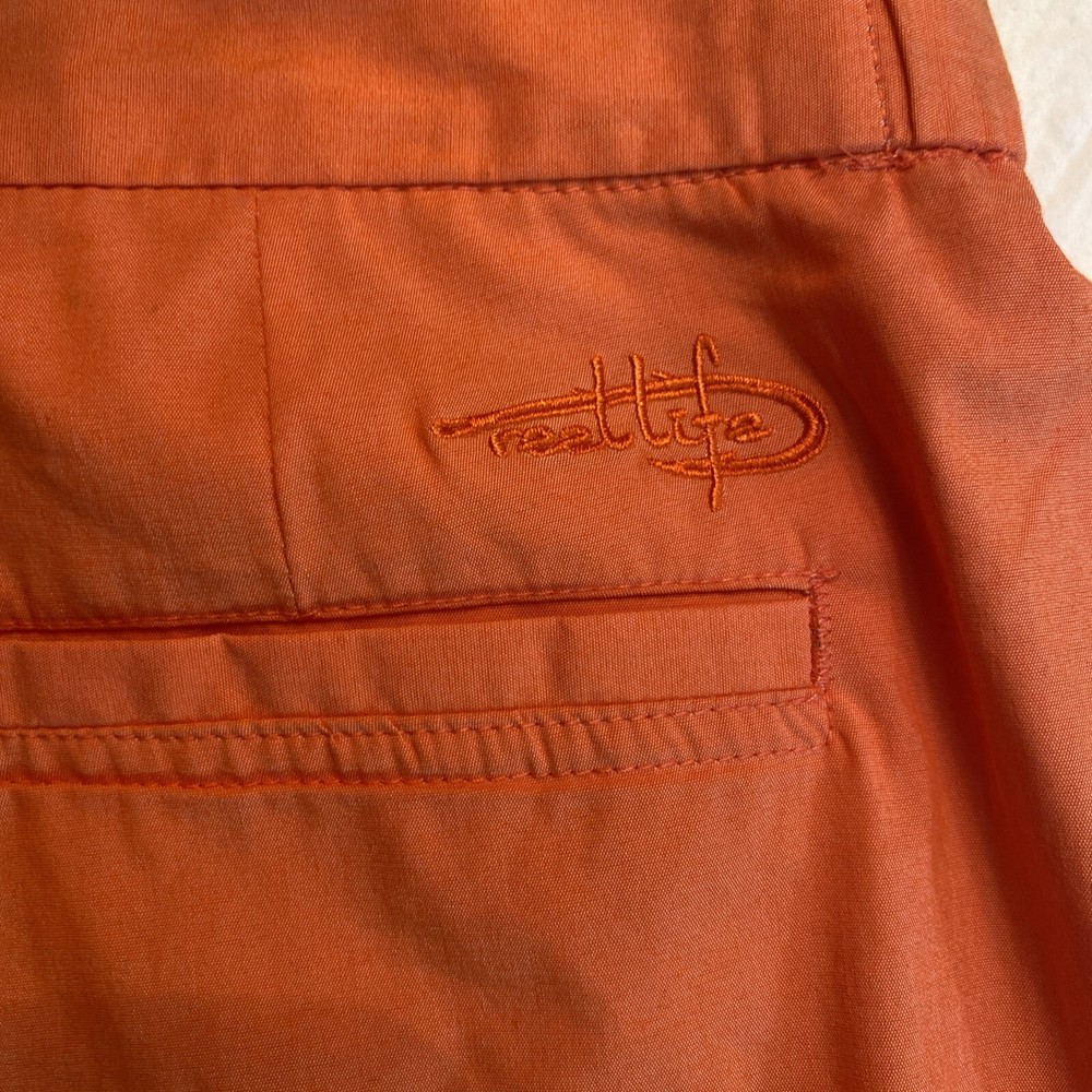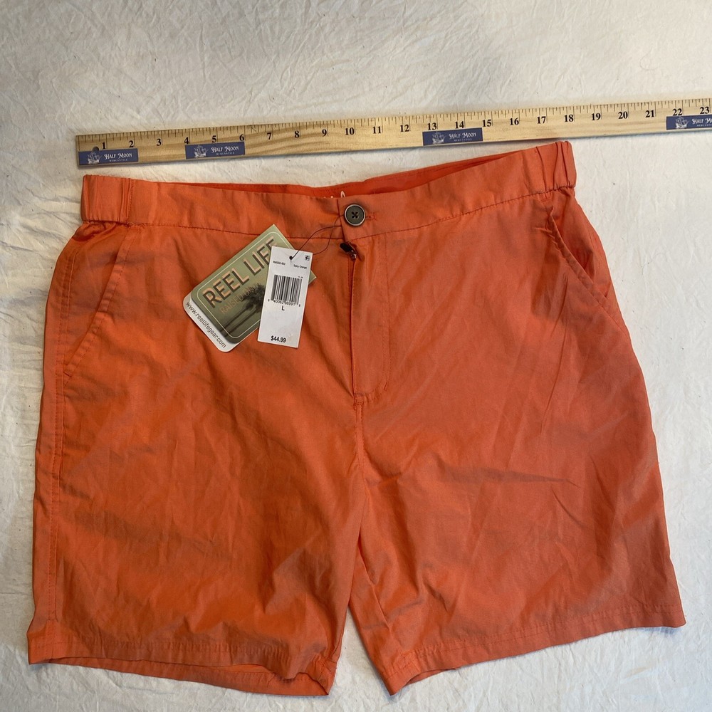 Boost your style with these Reellife Men's Ocean Washed Series Shorts in Spicy Orange. These shorts come in a size L with a flat front design and mid-rise waist measuring at 36 inches. The chino style shorts are made of a comfortable and durable blend of polyester, spandex, and cotton, making them perfect for casual and travel occasions during the summer, fall, and spring seasons. The shorts feature a zip closure and slash pockets, making them practical and functional for everyday use. They are also machine washable, making it easy to clean and maintain their fresh look. With their solid pattern and vibrant blue color, these shorts are an excellent addition to any wardrobe. Grab a pair now and elevate your style game.