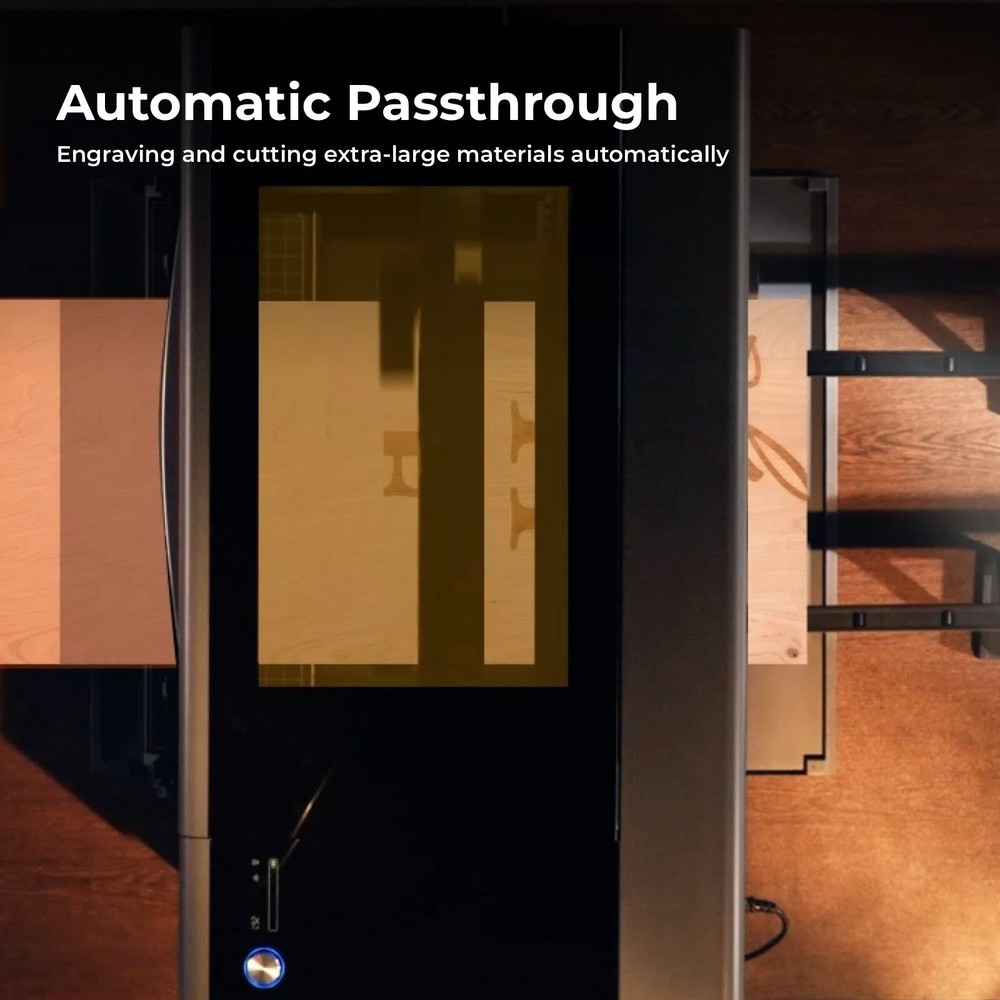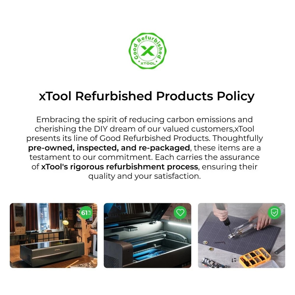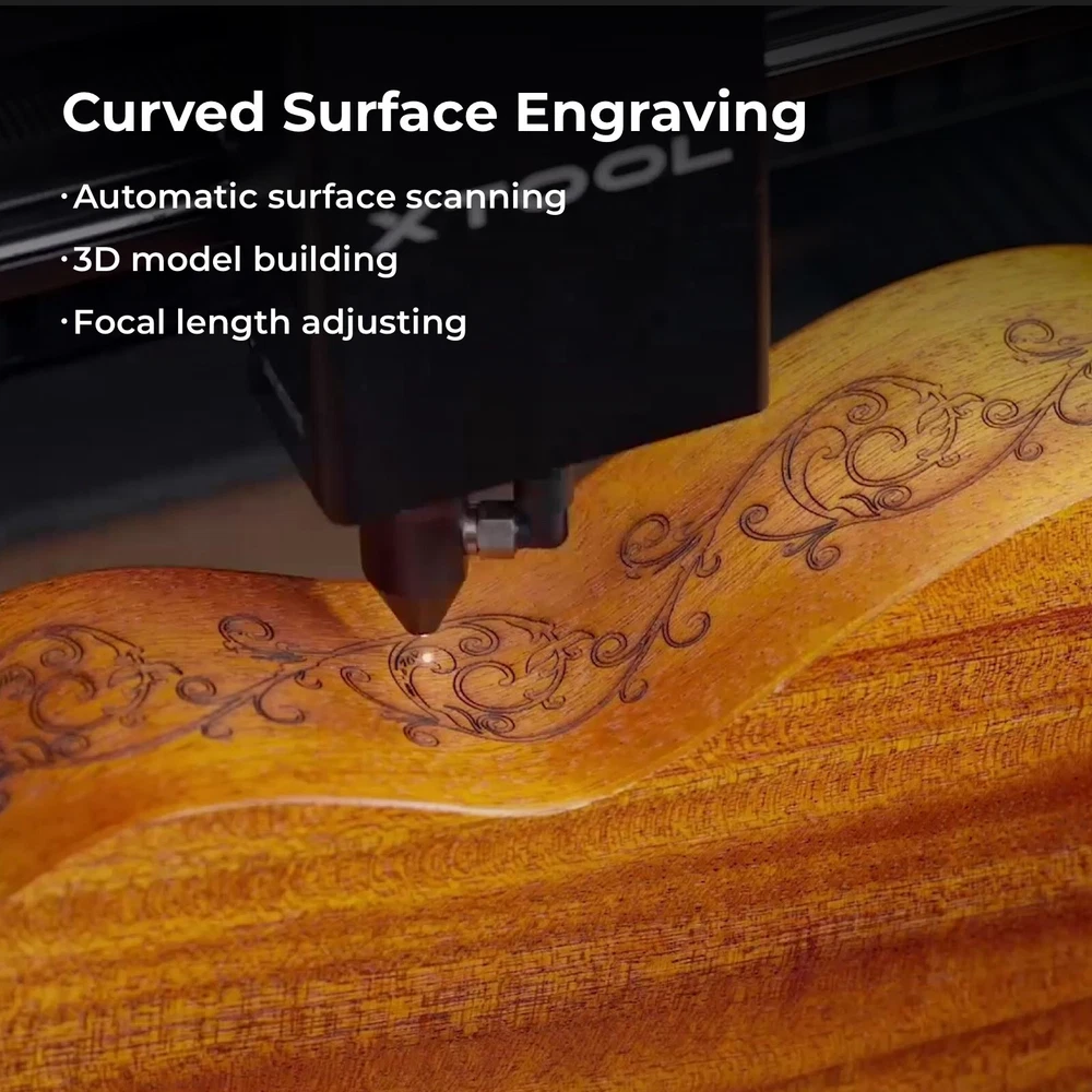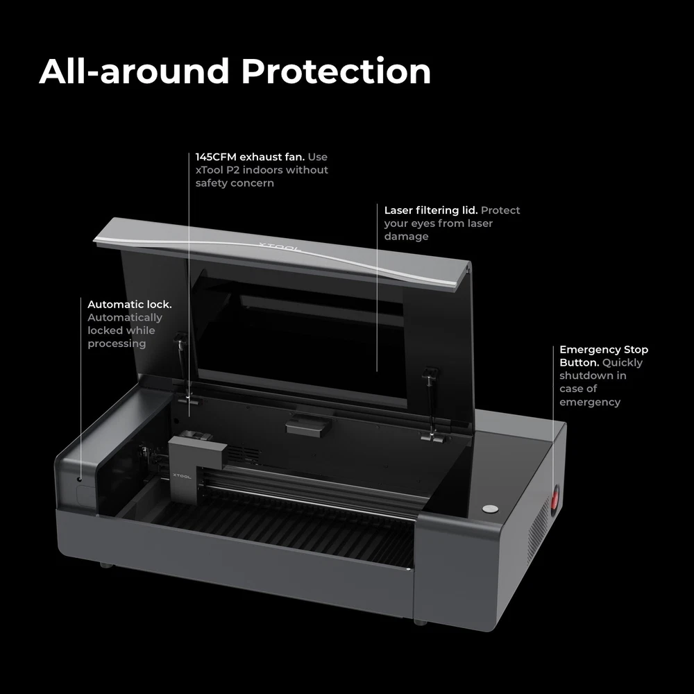 (Refurbished) xTool P2 CO2 Laser Engraver, Smart Desktop 55W CO2 Laser Cutter, Smart Laser Engraving Machine for Wood and Metal, Acrylic, Craft Paper, Leather, Glass, Autofocus with Dual 16MP Smart Cameras 55W Superb Laser Cutting : xTool P2 CO2 laser engraver & cutter has a 55W high-power laser that support to cut 18mm black walnut and 20mm acrylic in one pass. xTool P2 laser machine has a sturdy construction and a high-quality motor that provides maximum engraving speed of 600mm/s. P2 CO2 laser cutter have ultra-high absorption efficiency on wood and acrylic, can cut 3mm basswood at the speed of 35mm/s, which is 6 times faster than a 20W diode laser. Dual 16MP Smart Cameras: The two 16MP cameras provide a real-time preview and bring down the precision error to only 0.3mm. The panoramic camera facilitates easy positioning by taking a whole picture of the working space in 3 seconds. Close-range cameras can move with the laser head to any position and take photos to get a precise view of a particular spot. Automatic Passthrough: xTool CO2 Laser cutter provides an automatic passthrough for precision and convenience when processing extra-large materials. Unlimited Engraving: xTool P2 laser engraver can make curved surface engraving and batch items engraving. This Laser engraving machine can automatically construct 3D models of curved objects, which makes curved surface engraving come true. Moreover, P2 can intelligently recognize shapes through the 16MP camera, fill patterns on multiple objects and engrave them in one batch! Safe and Clean: P2 has an enclosed and safe design, automatic lock, emergency stop button, hydraulic support, fire safety, and multiple warning systems. This laser machine also has an excellent smoke exhaust system. With a built-in adjustable air assist and slats, smoke can easily get through the materials and be ventilated by the 145CFM exhaust fan. eginner-friendly Software: You can download our proprietary XCS software and use it for free, easy to get started, and no network is required. XCS supports Windows, macOS, and iOS for iPad. Or you can use Lightburn software for advanced laser operation. This machine also supports multiple device connections, including USB, Wi-Fi, and IP connection.
