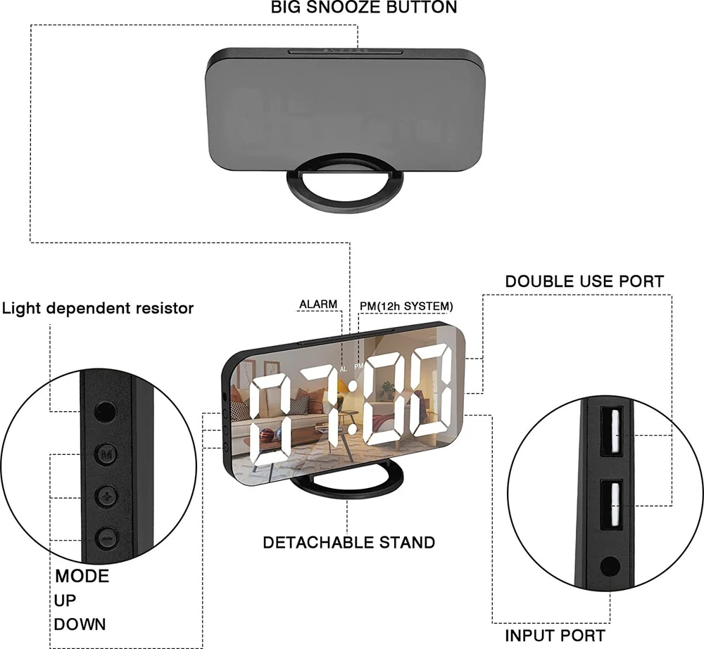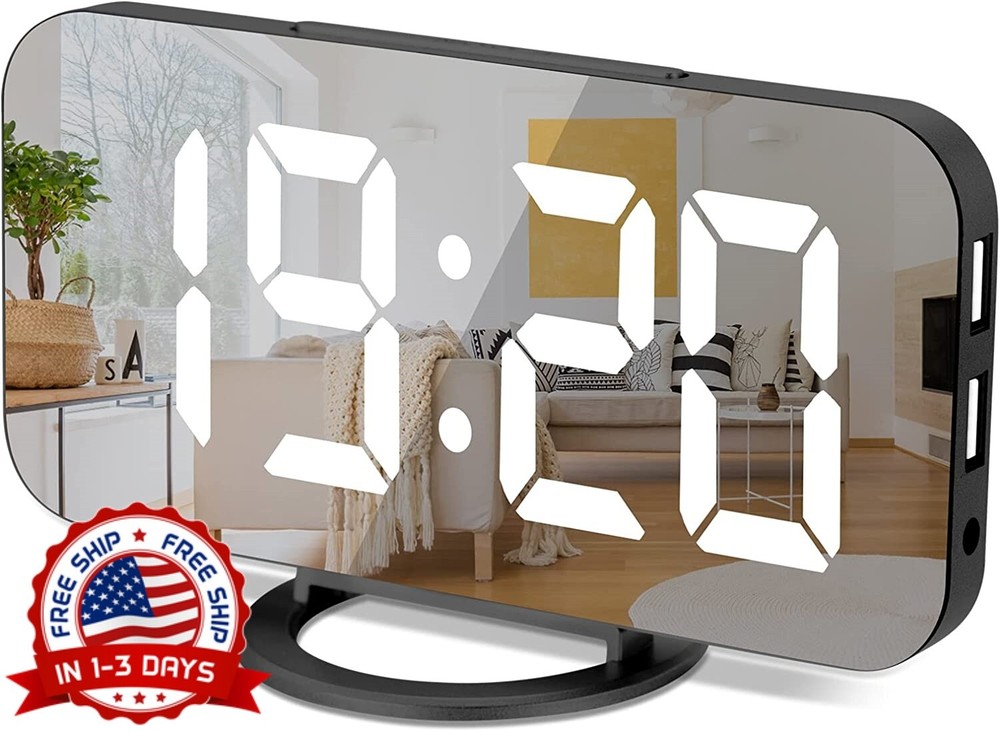 Reloj Despertador Alarma de Mesa Con Espejo Digital,with USB Charging Port NEW ♥ Diseño de pantalla grande con espejo único: pantalla LED ultra grande de 6.1 "pulgadas, puede ver la hora claramente incluso de un vistazo dentro de los 30 pies de su habitación, y la pantalla también se puede usar como un espejo en el uso diario, simple e interesante. ♥ Brillo ajustable y modo nocturno: el reloj despertador digital proporciona un brillo de 3 niveles, se ajusta de forma manual o automática a un brillo cómodo y la luz LED se atenuará automáticamente durante el tiempo de sueño para proteger sus ojos por la noche y ahorrar energía. Sin luces cegadoras ni sonidos molestos que perturben su sueño, cree un ambiente tranquilo para dormir. ♥ Función de repetición: el botón de repetición grande lo ayuda a apagar fácilmente el zumbador sin abrir los ojos y obtener 5 minutos adicionales de sueño, pero al mismo tiempo evita quedarse dormido. El reloj digital emitirá una alarma cada 5 minutos hasta que apagues el modo de repetición presionando cualquier otro botón, perfecto para los que duermen mucho. ♥Puertos de carga USB duales y respaldo de batería: equipado con dos puertos de carga USB en el reloj despertador digital, puede cargar teléfonos celulares, tabletas y otros dispositivos electrónicos simultáneamente cuando carga el reloj. No hay necesidad de preocuparse por la batería baja cuando juegas tu teléfono en la cama, muy conveniente para toda la vida. La batería de respaldo (incluida) solo almacena la hora y la configuración de las alarmas.