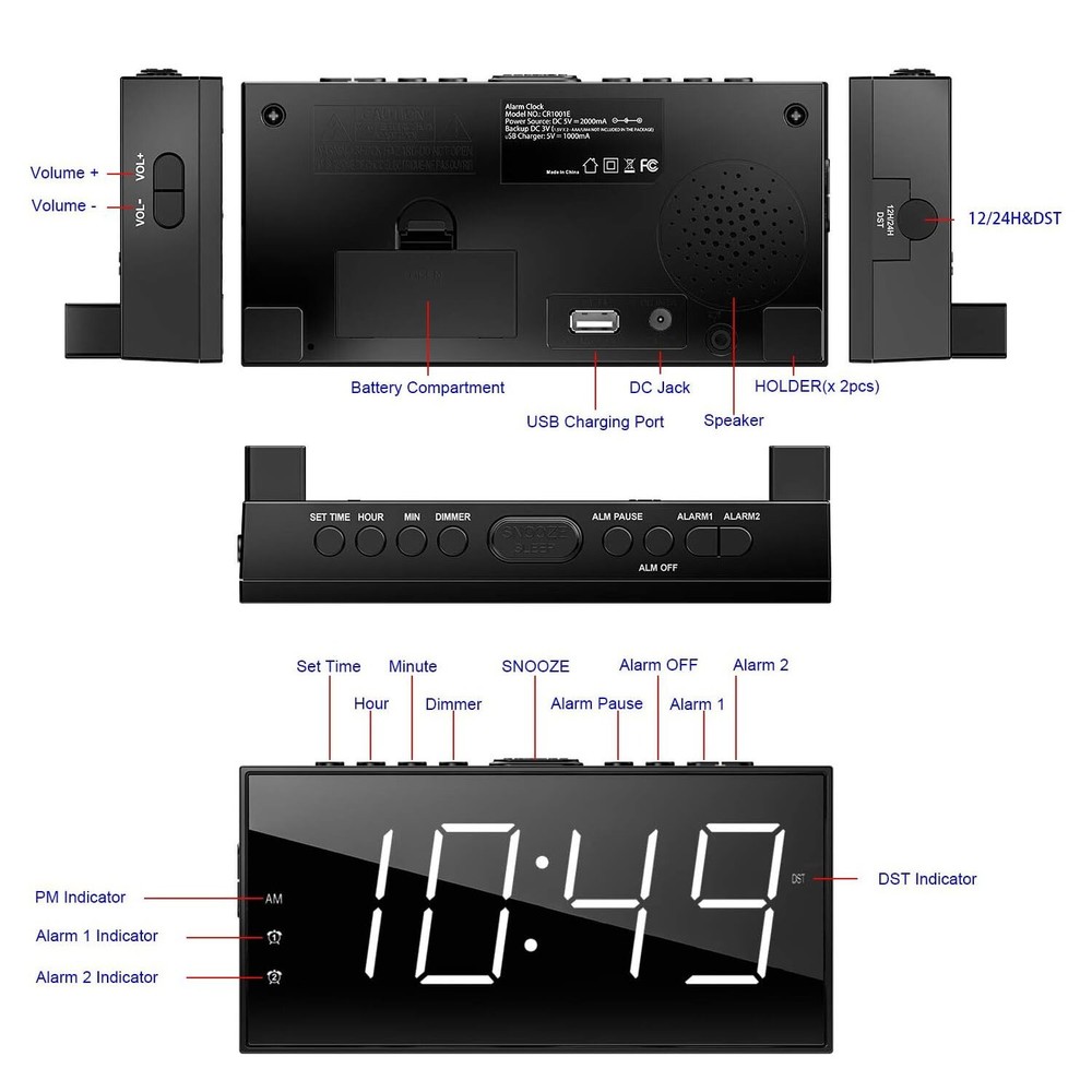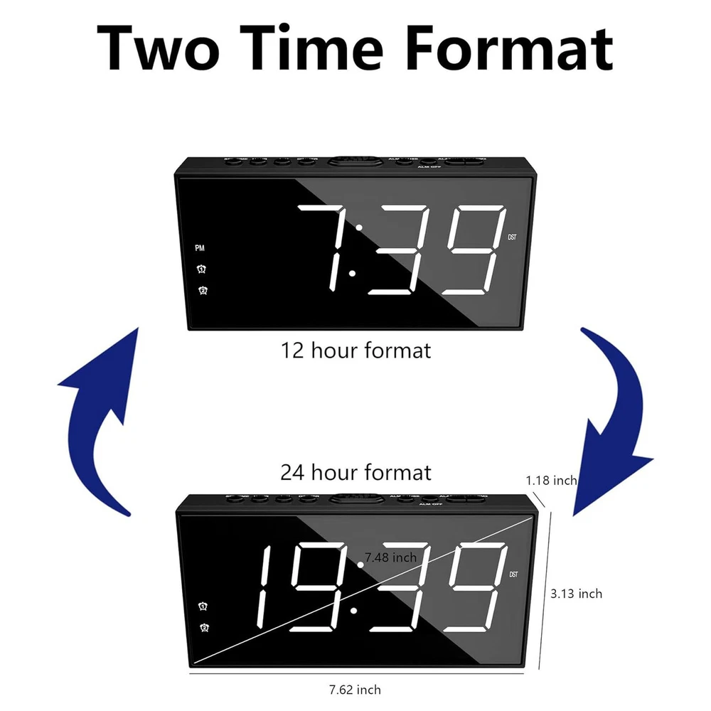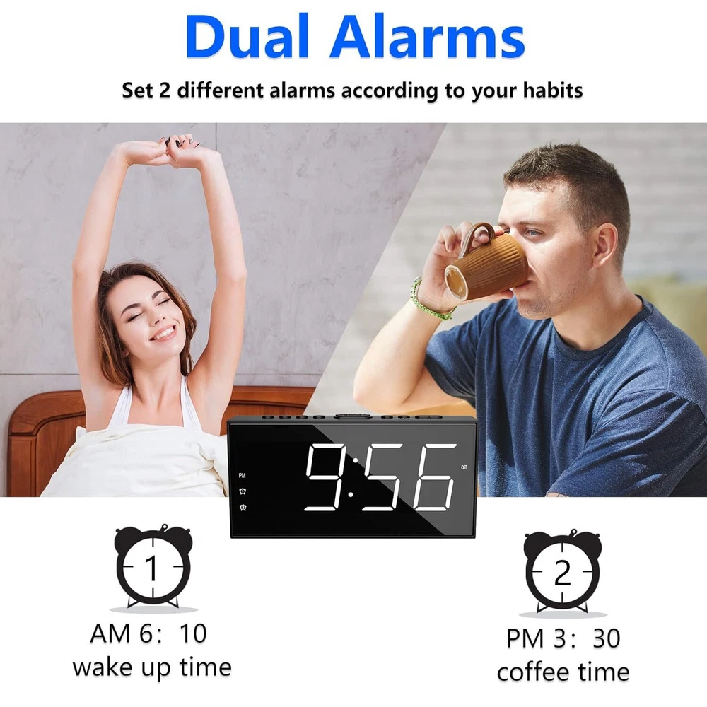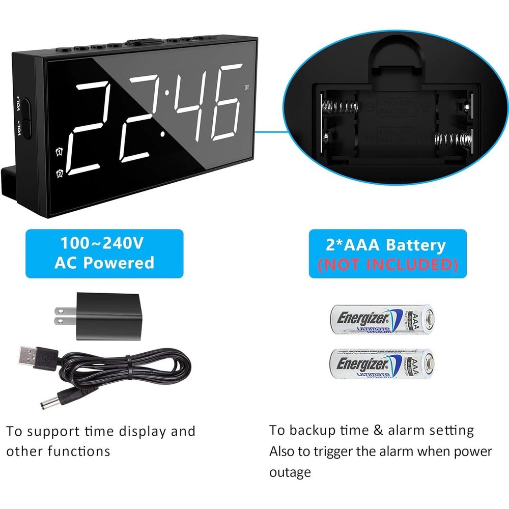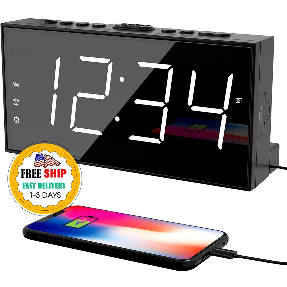 Reloj Despertador LED Inteligente Para Mesa De Noche Alarma US RELOJ DE ALARMA DOBLE FÁCIL DE USAR: Este reloj de alarma dual digital para dormitorio puede configurar 2 alarmas diferentes, conveniente para miembros de la familia con un horario diferente. Un reloj básico con suficientes funciones prácticas para el uso diario: volumen de alarma ajustable de 4 niveles, atenuador de brillo de 5 dígitos, puerto de carga USB incorporado, función SNOOZE para dormir 9 minutos adicionales, tomacorriente operado con configuraciones de respaldo de batería, 12/24H Y función DST también disponible. PANTALLA GRANDE CON VOLUMEN Y REGULADOR AJUSTABLES: Reloj despertador muy ruidoso para personas que duermen mucho con pantalla LED grande y clara de 7 "para personas con problemas de visión, fácil de verificar la hora desde el otro lado de la habitación. El volumen de la alarma se puede ajustar a 4 niveles según la profundidad de su sueño. , más fuerte para personas que duermen mucho mientras que ligero para personas que duermen poco. Atenuador de brillo de dígitos ajustables de 5 niveles para una fácil lectura, más brillante para el día y más oscuro para la noche. SIN PREOCUPACIONES CONFIGURACIÓN DE RESPALDO DE BATERÍA CON SNOOZE: Este reloj despertador enchufable para dormitorio funciona con tomacorriente para TODAS las funciones, como carga USB, alarma y visualización de la hora. Reloj despertador dual con tiempo de respaldo de batería y configuración de alarma, además de activar la alarma cuando falla la energía. Simplemente presione el botón "DORMITAR" en la parte superior para dormir 9 minutos adicionales antes de que vuelva a alertar. CARGADOR DE TELÉFONO USB Y FORMATO DE HORA 12/24H Y DST: El reloj despertador LED de cabecera con cargador de teléfono le permite cargar su teléfono inteligente, iPad u otros dispositivos inteligentes, sin necesidad de enchufarlos a la pared. También está disponible el formato de 12 o 24 horas y el horario de verano. Los botones claros y comprensibles hacen que sea fácil de configurar, perfecto para niños mayores. ¡La apariencia elegante también es adecuada para adolescentes, niños y niñas! Terms of Sale and Feedback: Feedback is extremely important to us and eBay If you are satisfied with our transaction, please take a moment to leave Positive Feedback. YOUR Satisfaction is our #1 Priority! If there are any issues, PLEASE contact us BEFORE leaving a neutral or negative rating so that we may resolve any concerns. We PROMISE we can make you happy if you give us a fair chance.