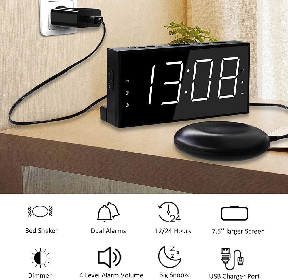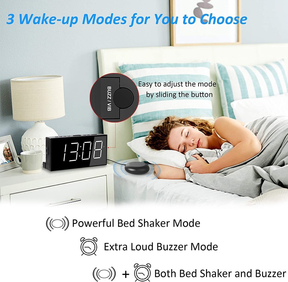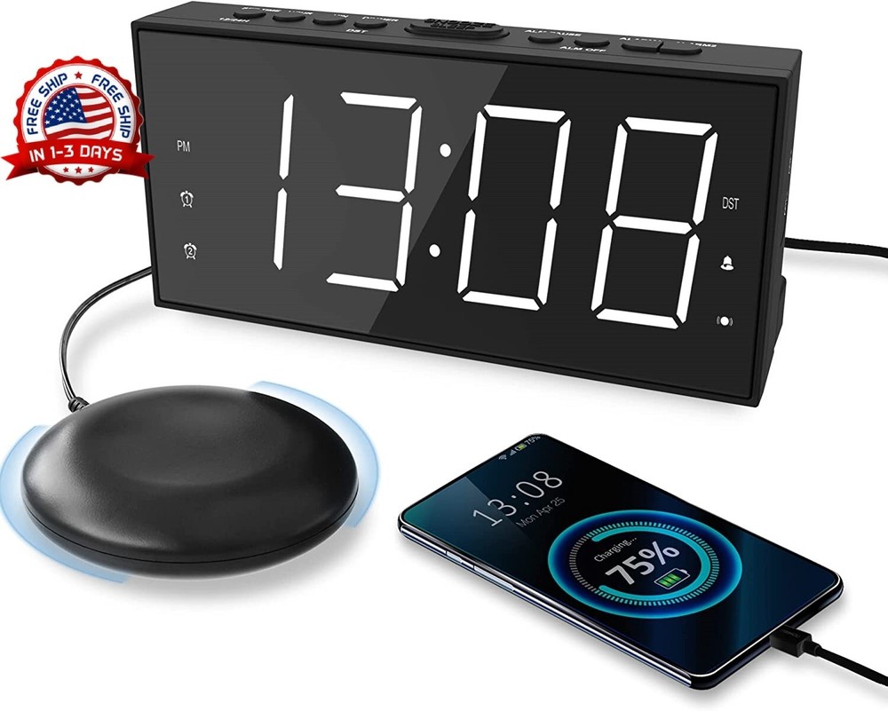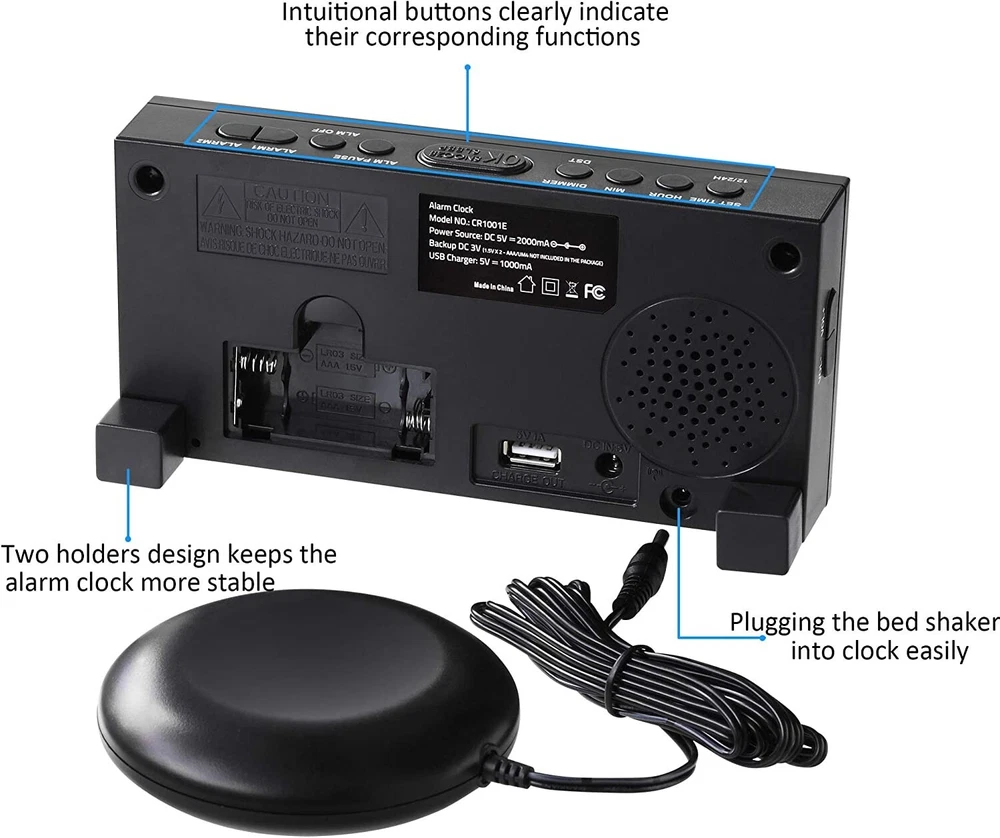 Reloj Despertador LED Proyector Digital Inteligente Para Mesa De Noche Alarma US 🔊Easy Wake by Strong bed Shaker & Loud Buzzer: en comparación con el reloj despertador de sonido normal, nuestro reloj despertador Loud viene con 3 modos de alarma actualizados: zumbador fuerte, súper vibrador de cama o sonido y vibrador, lo ayudan a despertarse más fácilmente a tiempo. Simplemente presione el botón "BUZZ/VIB" para configurar su método de despertador favorito para satisfacer diferentes necesidades. Incluso para los que duermen mucho, tienen problemas de audición, pérdida o sordera, el despertador vibrador de cama es un asistente perfecto para el servicio de despertador. ⏰【Agitador de vibración con cable largo y volumen ajustable】: con un cable vibrador de 71 "de largo, el agitador de cama se puede colocar debajo de la almohada o el colchón y produce una fuerte vibración para despertarlo sin molestar a los demás. Además, el volumen de sonido del despertador vibratorio se puede ajustar en 4 niveles para satisfacer más necesidades. Combinando el nivel de volumen más alto y un potente agitador de cama, puede despertarse a tiempo de manera confiable incluso para los que duermen mucho. 🕒【Reloj de alarma dual y función de repetición grande】: el reloj de alarma dual le permite configurar dos alarmas separadas fácilmente, especialmente útil para parejas o compañeros de cuarto que mantienen diferentes horarios. Cuando suene la alarma, toca ligeramente el botón grande de repetición para apagarla temporalmente y disfruta de 9 minutos extra de sueño antes de que te avise de nuevo. También puede presionar el botón “PAUSA DE ALARMA” o “APAGAR ALARMA” para apagar la alarma por 24 horas o permanentemente respectivamente. 🔆【Pantalla grande de 7.5'' y atenuador de brillo de 5 niveles】-Con una gran pantalla LED de 7.5'', los números en el reloj despertador Bed Shaker son ultra claros para verlos incluso desde una larga distancia o desde el otro lado de la habitación sin anteojos. El reloj despertador digital también tiene un brillo de pantalla ajustable de 5 niveles, puede configurar el nivel más bajo para evitar que cualquier luz moleste su sueño o un nivel más brillante para ver fácilmente la hora durante el día. 🔌【Alimentación eléctrica con respaldo de batería】: el reloj despertador digital debe conectarse a la alimentación de CA con el adaptador incluido para que funcione. Las baterías de respaldo AAA de 2 piezas (NO incluidas) solo se usan para memorizar la hora y la configuración de la alarma cuando se produce un corte de energía. Durante la batería de respaldo, la pantalla quedará en blanco pero la alarma aún se activará. Diseño de puerto de carga USB y formato de 12/24 horas: el reloj despertador con puerto de carga USB (5 V/1 A) proporciona la comodidad para cargar tu teléfono u otro dispositivo de forma segura mientras duermes. El formato 12/24H y la función DST también están disponibles presionando los botones correspondientes.