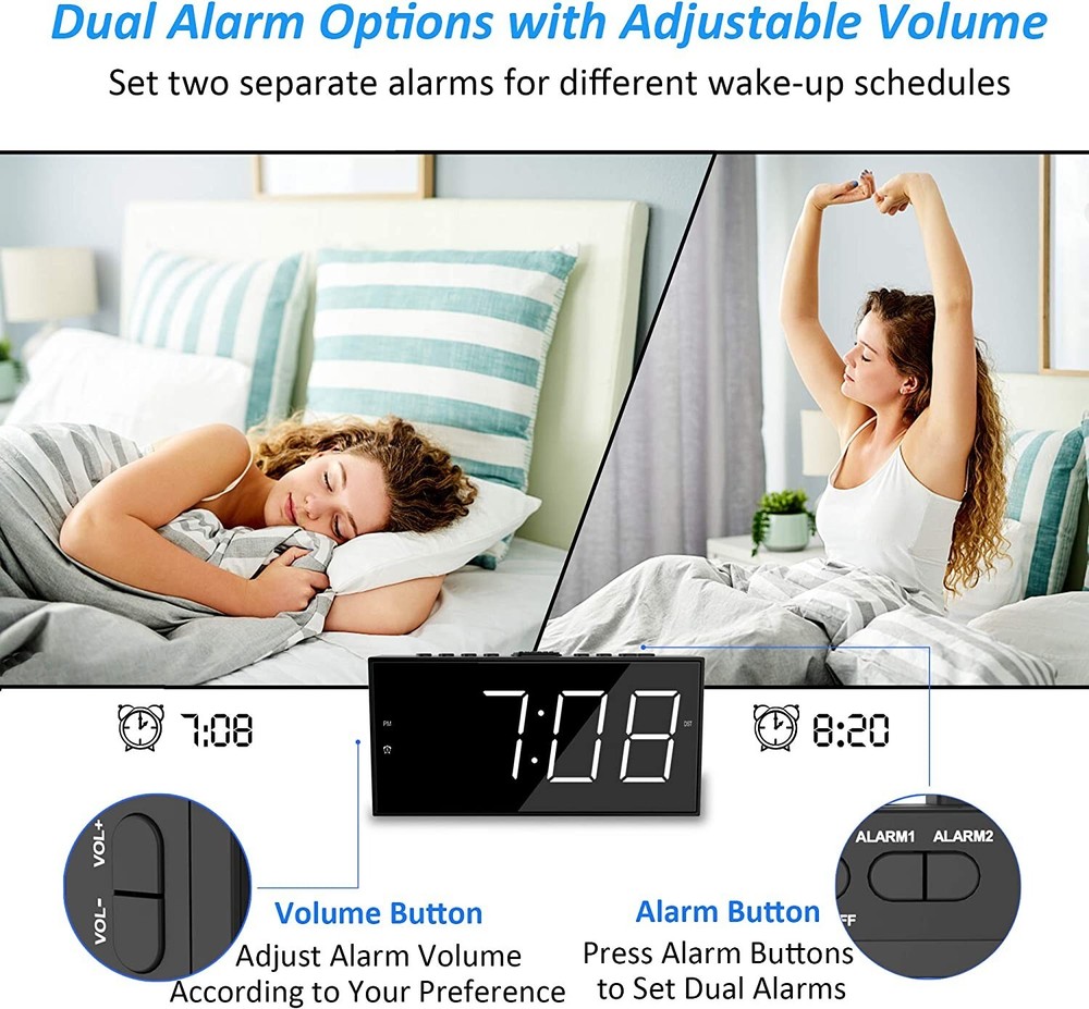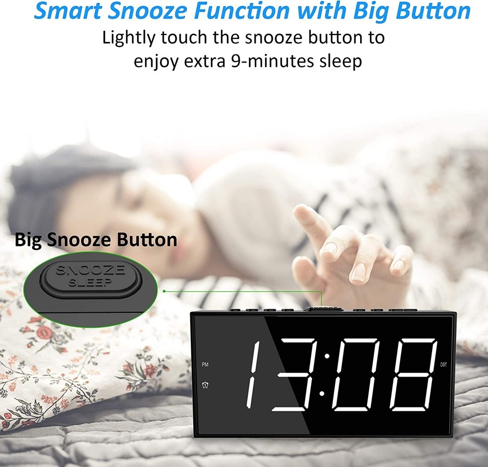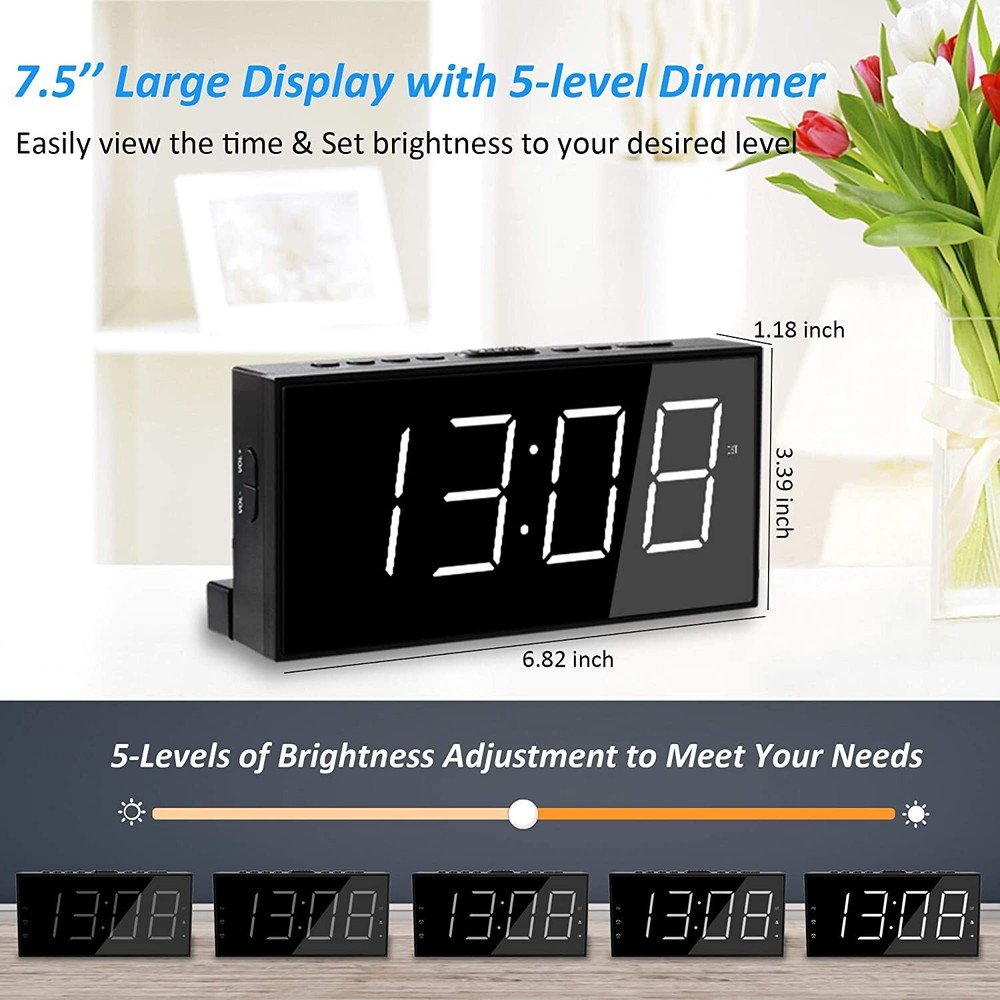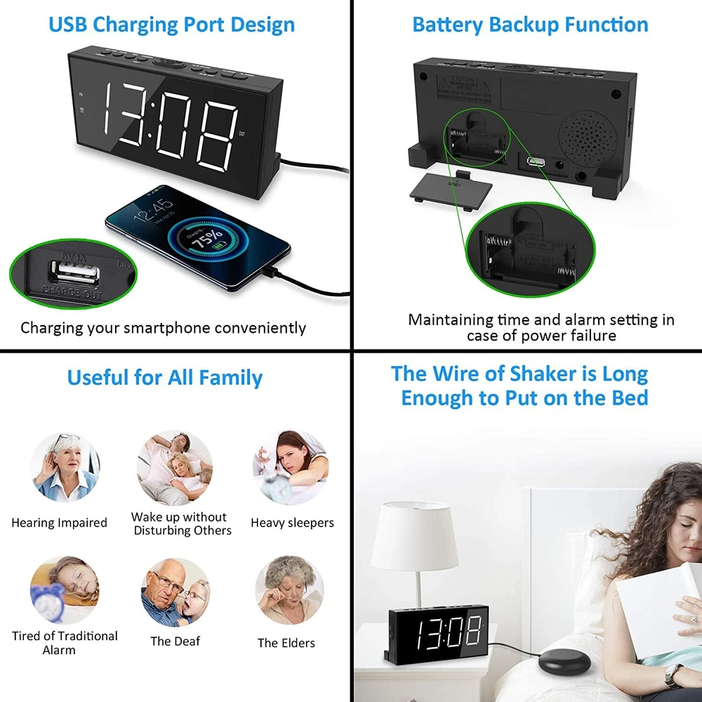 Reloj Despertador LED Proyector Digital Inteligente Para Mesa De Noche Alarma US 🔊Easy Wake by Strong bed Shaker & Loud Buzzer: en comparación con el reloj despertador de sonido normal, nuestro reloj despertador Loud viene con 3 modos de alarma actualizados: zumbador fuerte, súper vibrador de cama o sonido y vibrador, lo ayudan a despertarse más fácilmente a tiempo. Simplemente presione el botón "BUZZ/VIB" para configurar su método de despertador favorito para satisfacer diferentes necesidades. Incluso para los que duermen mucho, tienen problemas de audición, pérdida o sordera, el despertador vibrador de cama es un asistente perfecto para el servicio de despertador. ⏰【Agitador de vibración con cable largo y volumen ajustable】: con un cable vibrador de 71 "de largo, el agitador de cama se puede colocar debajo de la almohada o el colchón y produce una fuerte vibración para despertarlo sin molestar a los demás. Además, el volumen de sonido del despertador vibratorio se puede ajustar en 4 niveles para satisfacer más necesidades. Combinando el nivel de volumen más alto y un potente agitador de cama, puede despertarse a tiempo de manera confiable incluso para los que duermen mucho. 🕒【Reloj de alarma dual y función de repetición grande】: el reloj de alarma dual le permite configurar dos alarmas separadas fácilmente, especialmente útil para parejas o compañeros de cuarto que mantienen diferentes horarios. Cuando suene la alarma, toca ligeramente el botón grande de repetición para apagarla temporalmente y disfruta de 9 minutos extra de sueño antes de que te avise de nuevo. También puede presionar el botón “PAUSA DE ALARMA” o “APAGAR ALARMA” para apagar la alarma por 24 horas o permanentemente respectivamente. 🔆【Pantalla grande de 7.5'' y atenuador de brillo de 5 niveles】-Con una gran pantalla LED de 7.5'', los números en el reloj despertador Bed Shaker son ultra claros para verlos incluso desde una larga distancia o desde el otro lado de la habitación sin anteojos. El reloj despertador digital también tiene un brillo de pantalla ajustable de 5 niveles, puede configurar el nivel más bajo para evitar que cualquier luz moleste su sueño o un nivel más brillante para ver fácilmente la hora durante el día. 🔌【Alimentación eléctrica con respaldo de batería】: el reloj despertador digital debe conectarse a la alimentación de CA con el adaptador incluido para que funcione. Las baterías de respaldo AAA de 2 piezas (NO incluidas) solo se usan para memorizar la hora y la configuración de la alarma cuando se produce un corte de energía. Durante la batería de respaldo, la pantalla quedará en blanco pero la alarma aún se activará. Diseño de puerto de carga USB y formato de 12/24 horas: el reloj despertador con puerto de carga USB (5 V/1 A) proporciona la comodidad para cargar tu teléfono u otro dispositivo de forma segura mientras duermes. El formato 12/24H y la función DST también están disponibles presionando los botones correspondientes.