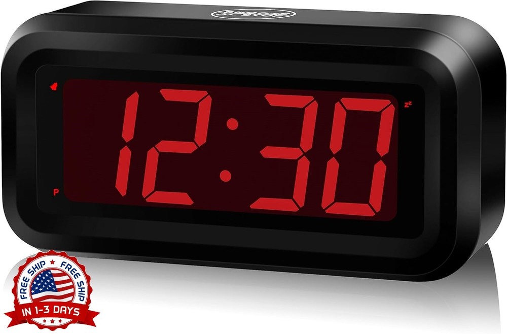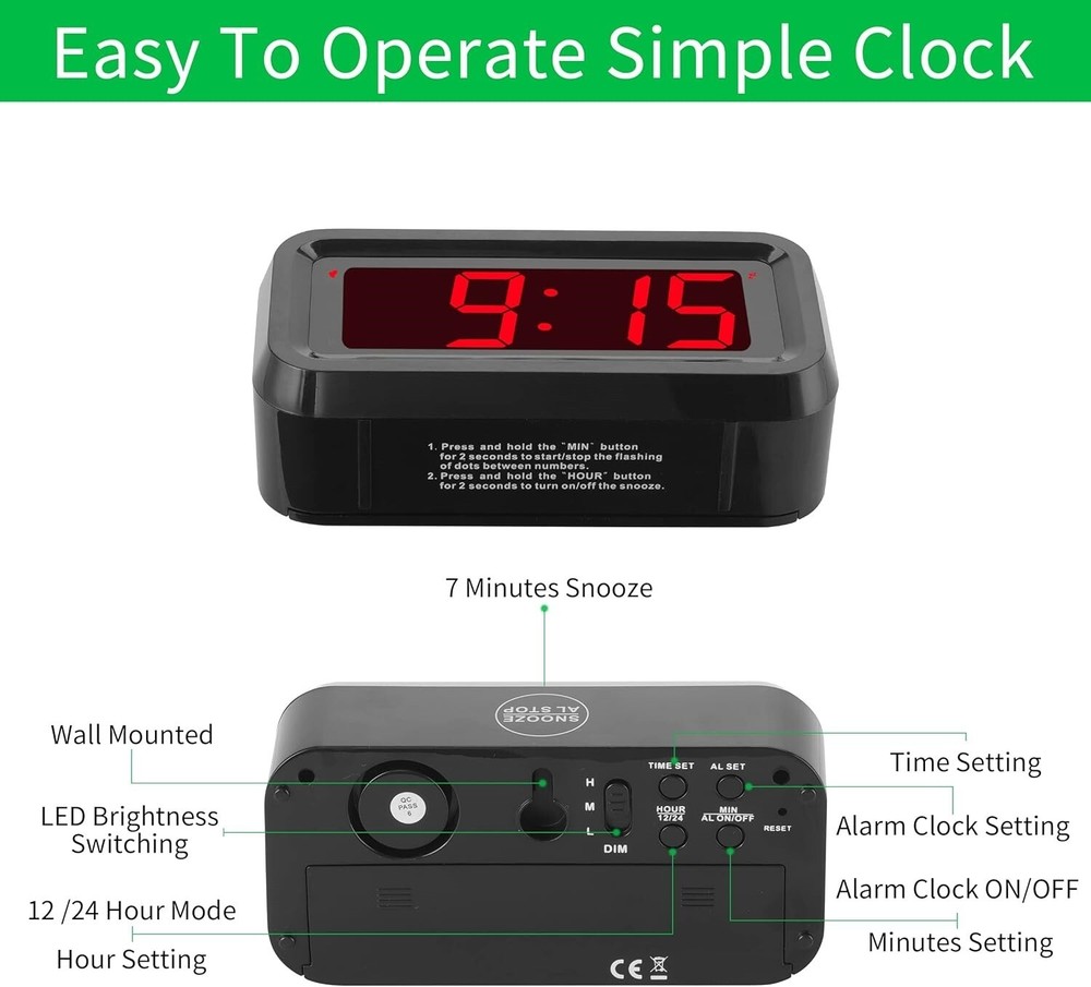 Reloj Despertador Reloj Digital Modo Nocturno Automatico Brillo LED De 3 Niveles Reloj despertador y reloj a pilas: este reloj básico funciona solo con 4 pilas alcalinas AA (no incluidas), que pueden mantener la pantalla de tiempo de dígitos LED grandes de 1,2 '' constante durante más de 12 meses. Pantalla LED brillante con hora, 24 horas de iluminación Los números LED grandes de 1,2" te permiten comprobar la hora claramente desde la distancia o incluso en la oscuridad. Es un reloj sencillo. Fácil de configurar: botón intuitivo y claramente marcado, excelentes despertadores para niños y ancianos, pueden operar el reloj, configurar la hora, la alarma, el atenuador y 12 h/24 h. Cuando suene la alarma, simplemente toca el botón de repetición grande superior para pausar la alarma y obtener una siesta adicional de 7 minutos, presiona cualquier botón para detener la alarma hoy y seguirá sonando al día siguiente. Presiona "AL ON/OFF" para cancelar las alarmas y el ícono de alarma en la esquina superior derecha desaparecerá. Despertador para dormitorio: hay 3 niveles de brillo para tus opciones (hora del día), alto/medio/bajo. El reloj entrará en modo nocturno y se atenuará automáticamente a las 8:00 p. m. ~ 6:00 a. m. para proteger tus ojos por la noche y ahorrar energía. Sin luces cegadoras ni sonidos molestos que perturben tu sueño, crea un ambiente Ambiente tranquilo para dormir. Despertador perfecto para dormitorio, mesita de noche, escritorio, estante y mesa. Despertador digital: el despertador sonará durante 90 segundos para garantizar que te despiertes definitivamente. La alarma sonará más fuerte cada 30 segundos. También hay una función de repetición de 7 minutos que se puede presionar continuamente y repetir 3 veces. La precisión horaria de este reloj es inferior a +/- 30 s por mes. Pequeño reloj de pared y de escritorio: 1 orificio en la parte posterior para un fácil montaje en la pared de un pequeño reloj de pared. También se puede colocar sobre la mesa para un simple reloj de escritorio. Regalos perfectos para niños, bebés, adolescentes, adultos, personas mayores, ancianos, niños o niñas, amigos o familias, ideal para regalos de despertador.