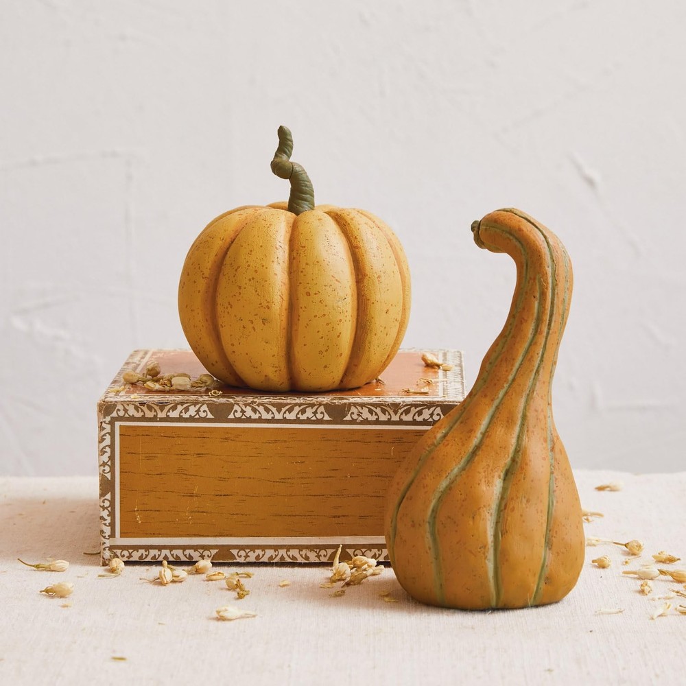A resin gourd with an orange color and a green stem that creates a bright and cheerful effect A festive and fun addition to the holiday decor, this gourd adds a touch of autumn and color to any space Ideal for displaying on a table, shelf, or mantel, this gourd can be used as a standalone piece or paired with other items Made of stone and resin that are sturdy, durable, and easy to clean 3.5" L x 3.25" W x 6.75" H
