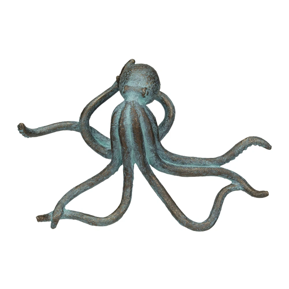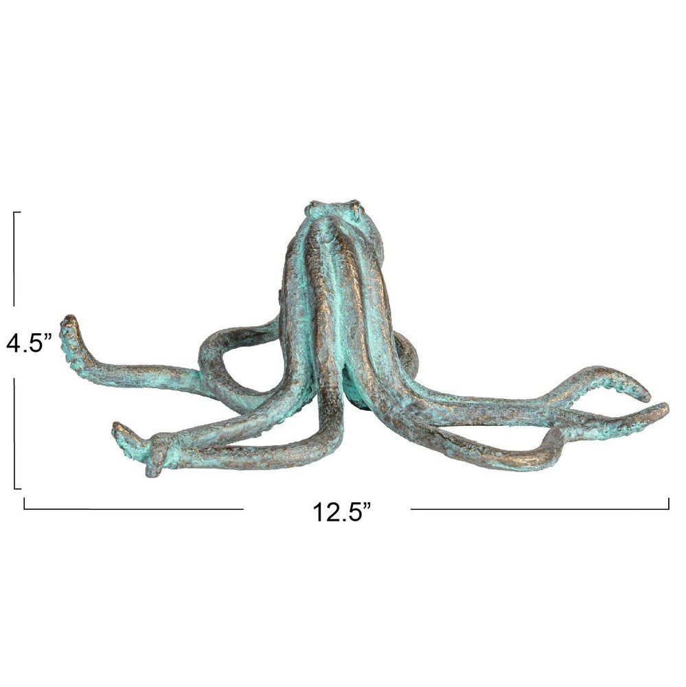 This resin octopus accent decor, in a verdigris finish and teal color, is a stunning addition to any home decor. Its realistic shape and antique appearance give it a weathered and antique look, while the teal color adds vibrancy and contrast. This piece is perfect for coastal, beach, nautical, or novelty themed decor, adding whimsy and character. It can be displayed on shelves, tables, mantels, or windowsills, and is made of durable resin, making it easy to clean. The piece measures 12.5 inches in length, 8.5 inches in width, and 4.5 inches in height, making it a great gift for anyone. Add some oceanic flair to the home with this resin octopus accent decor piece that features a verdigris finish and a teal color This accent decor piece is perfect for any coastal, beach, nautical, or novelty themed decor, as it adds a touch of whimsy and character This accent decor piece can be displayed on shelves, tables, mantels, or windowsills, as it is captivating, expressive, and eye-catching This accent decor piece is made of resin, a type of plastic that is durable and easy to clean Measures 12.5 inches in length, 8.5 inches in width, and 4.5 inches in height